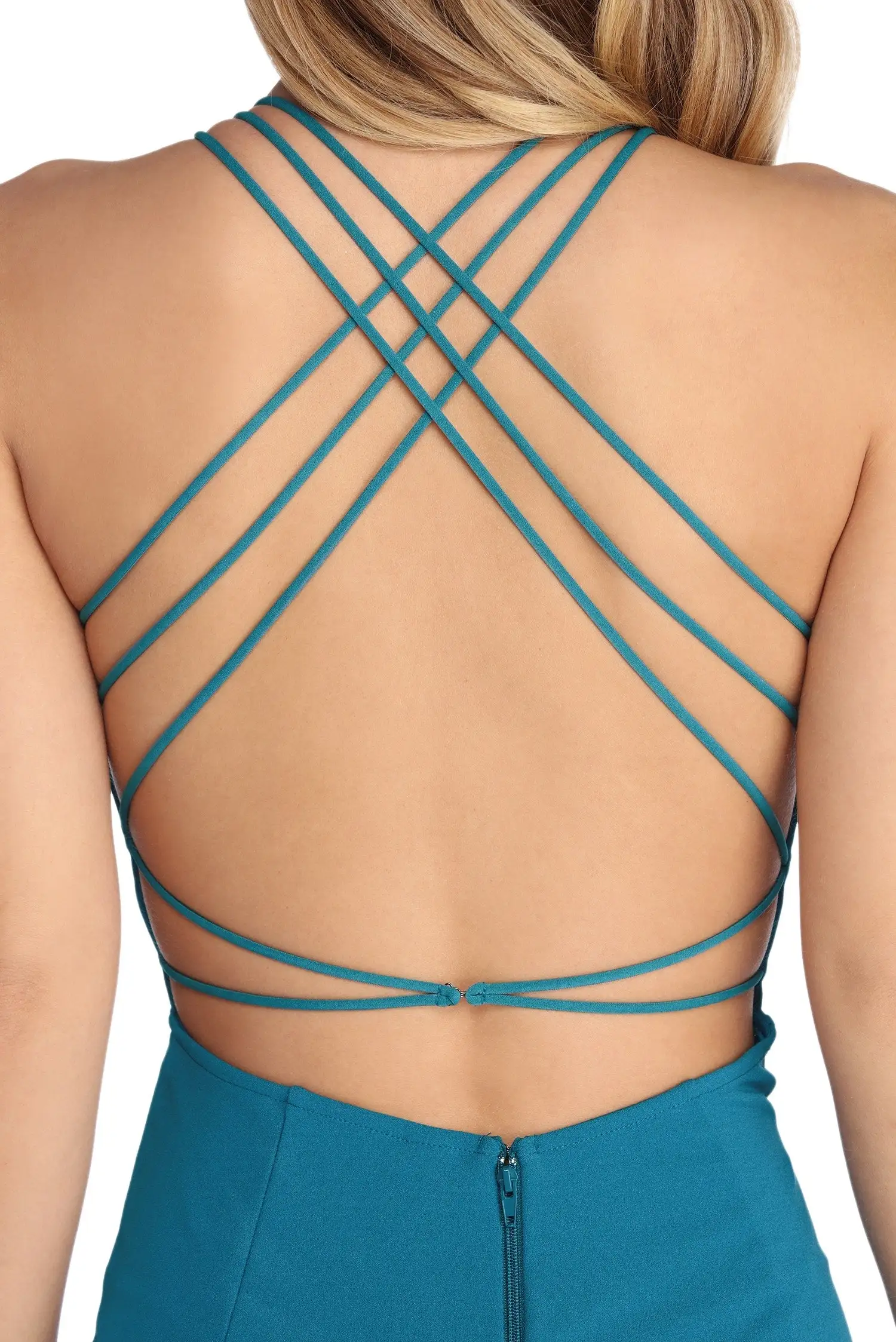 Stay perfectly poised in our teal Adelyn dress as she flatters your curves in all the right places! Adelyn features a sleeveless bodice with a high round neckline, padded cups, multiple straps that cross at the back, an exposed back zipper closure, a high waist seam, and a flared trumpet skirt with vertical seams. Adelyn offers a slim fit and is composed of a crepe fabric that offers a moderate stretch. Dress is lined with a smooth knit fabric.Â