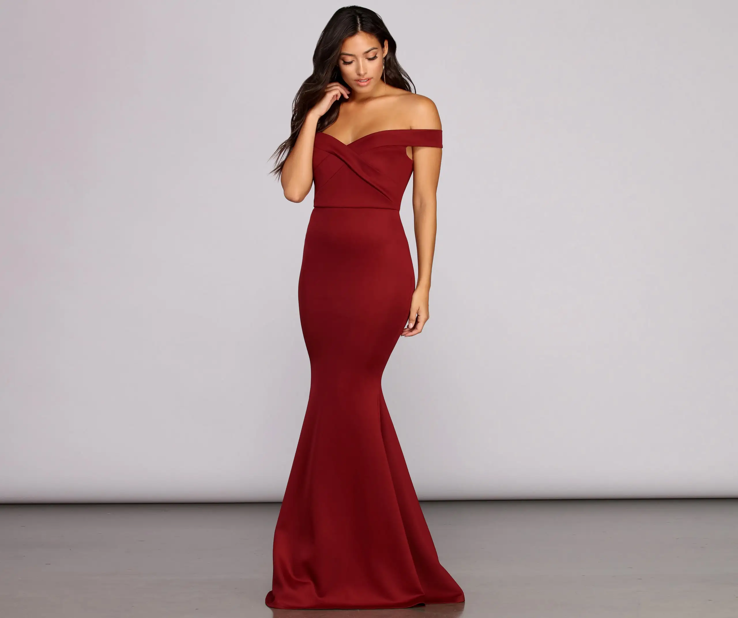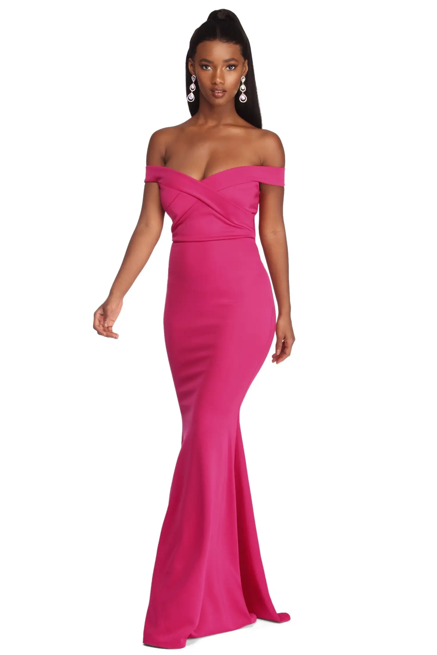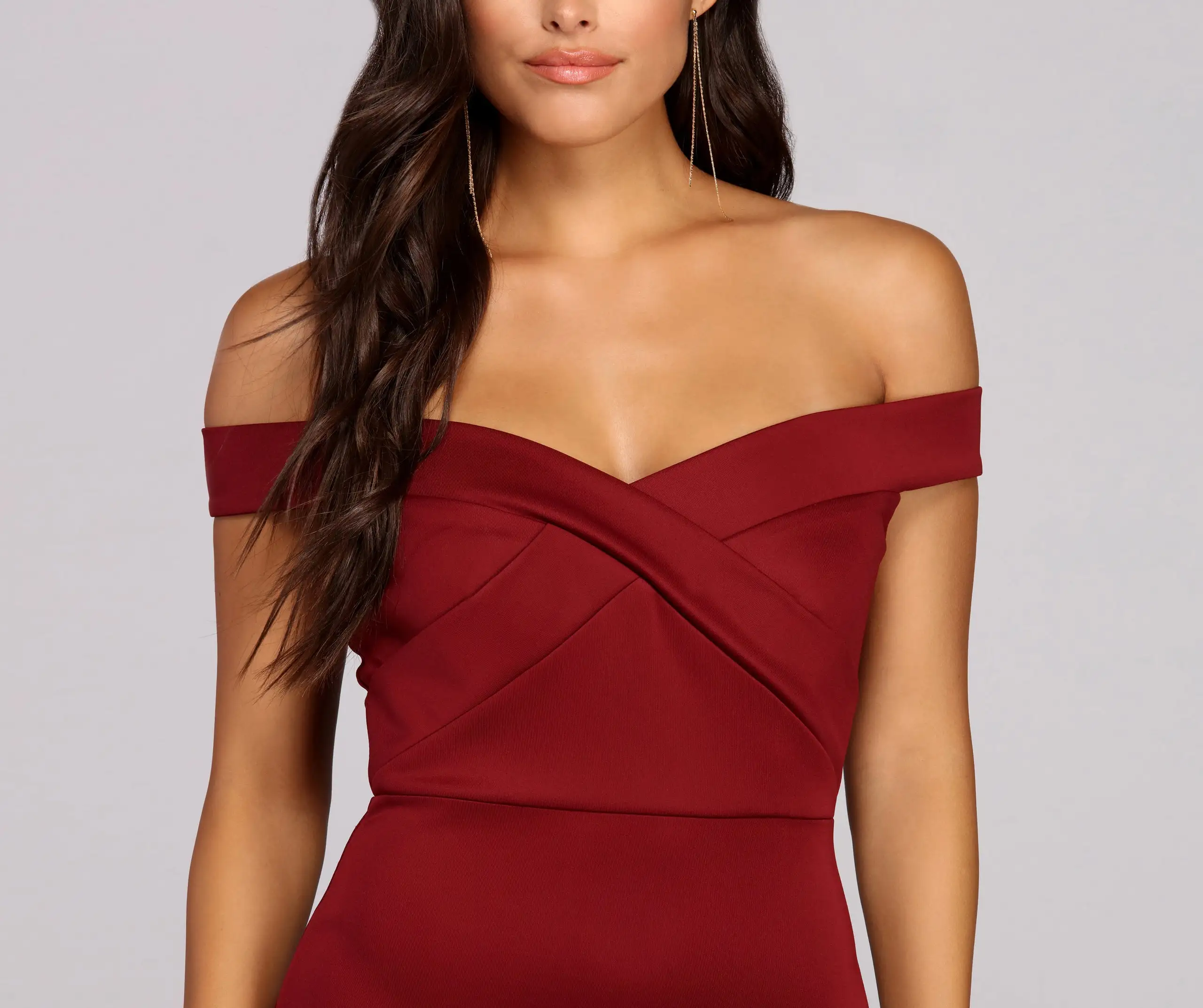 Captivate and create an unforgettable moment in the vibrant Aileen dress! She features an off the shoulder neckline, a sweetheart bust, padded cups and a bandage-style overlapping band accent. Her slim fit bodice leads to a curve hugging mermaid silhouette. Dress is composed of a scuba knit fabric that offers a moderate stretch.