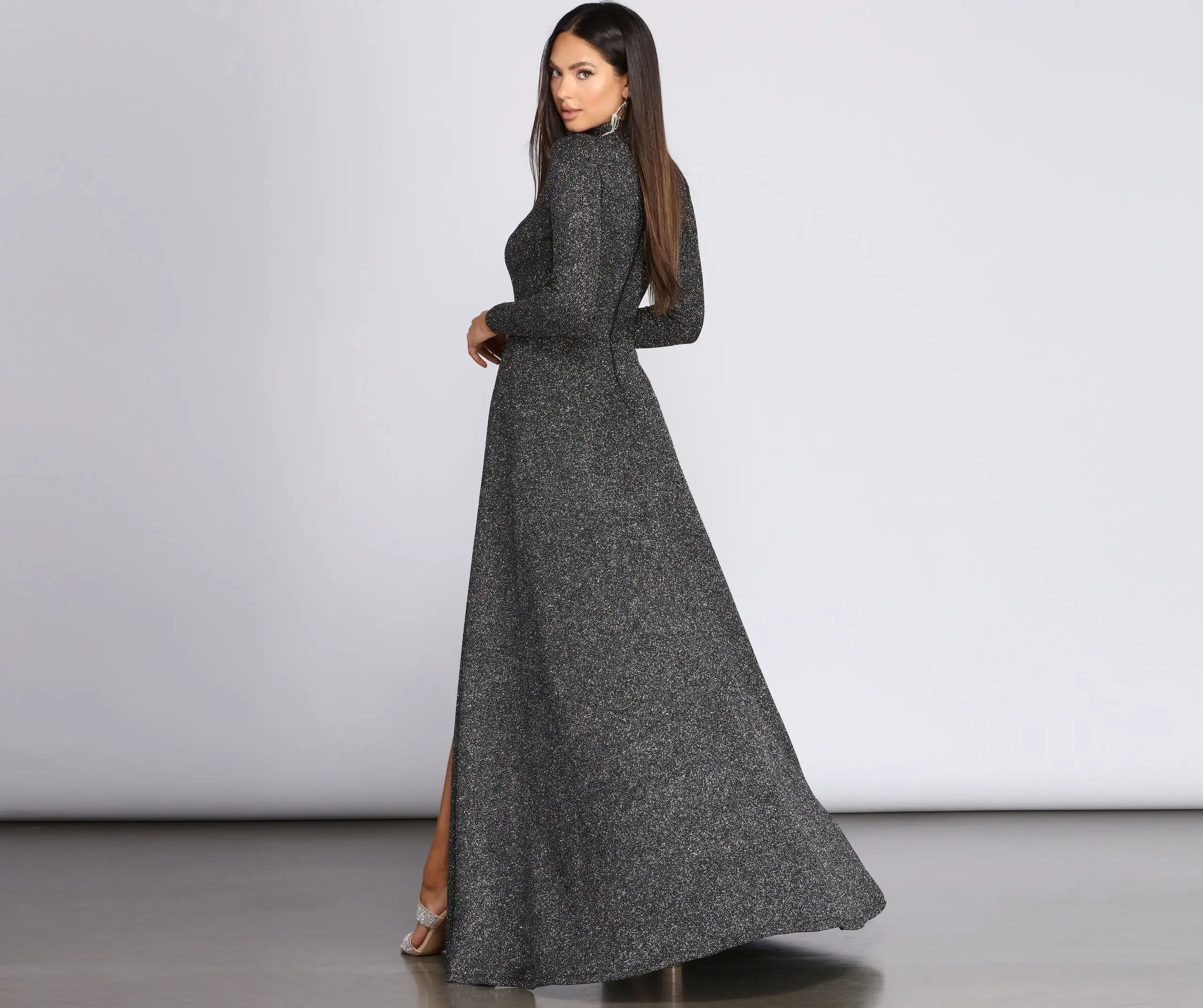 Go gaga for glitter in our glam Alessandra dress! She features an all over black hue, a mock neck, fitted long sleeves, princess seams and a narrow waistband accent. Her slim fit bodice leads to an elongating floor length silhouette accented with high side slits to show off your glowing gams! She is composed of a glitter knit fabric that offers a form hugging fit with a moderate stretch. Bodysuit-like lining included with snap button closure and full bottom. Includes a smooth knit lining and a back zipper closure. Glitter will transfer.