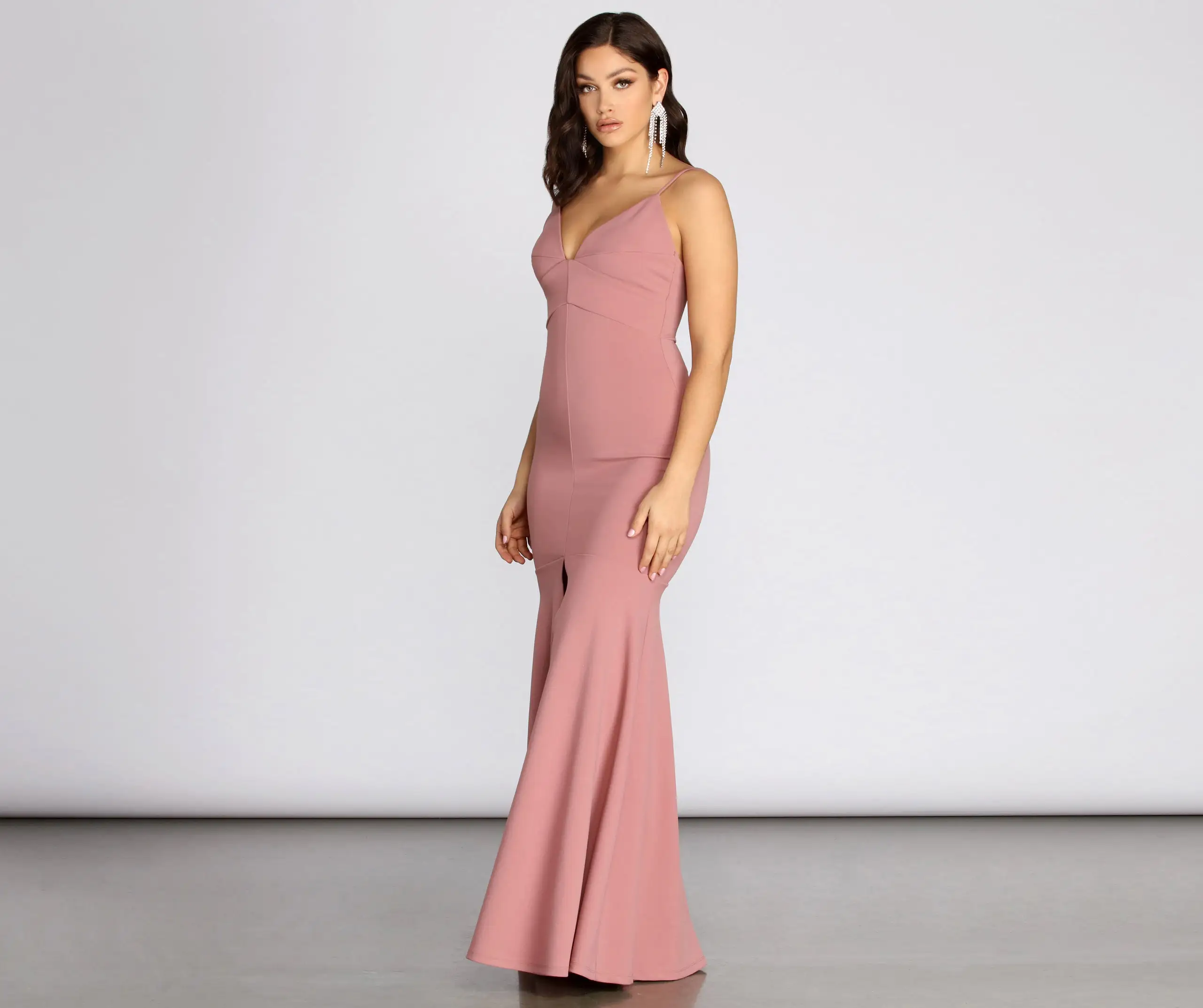 Our Alia deep V mermaid dress was made to flatter your curves and create a gorgeous silhouette! She features a sleeveless plunging V-neckline with a padded bust, adjustable spaghetti straps for a customized fit, front seam detailing, and a curve-hugging mermaid silhouette with a sultry front slit. Style this dress with