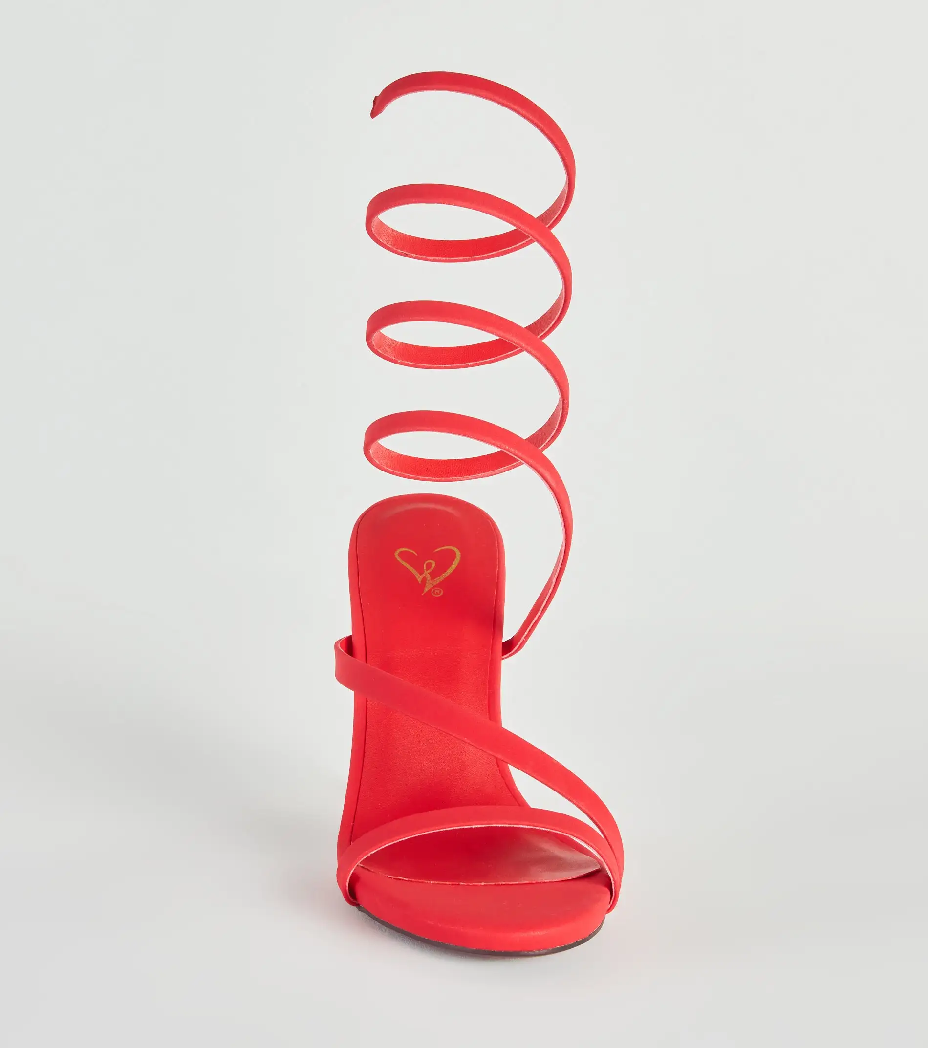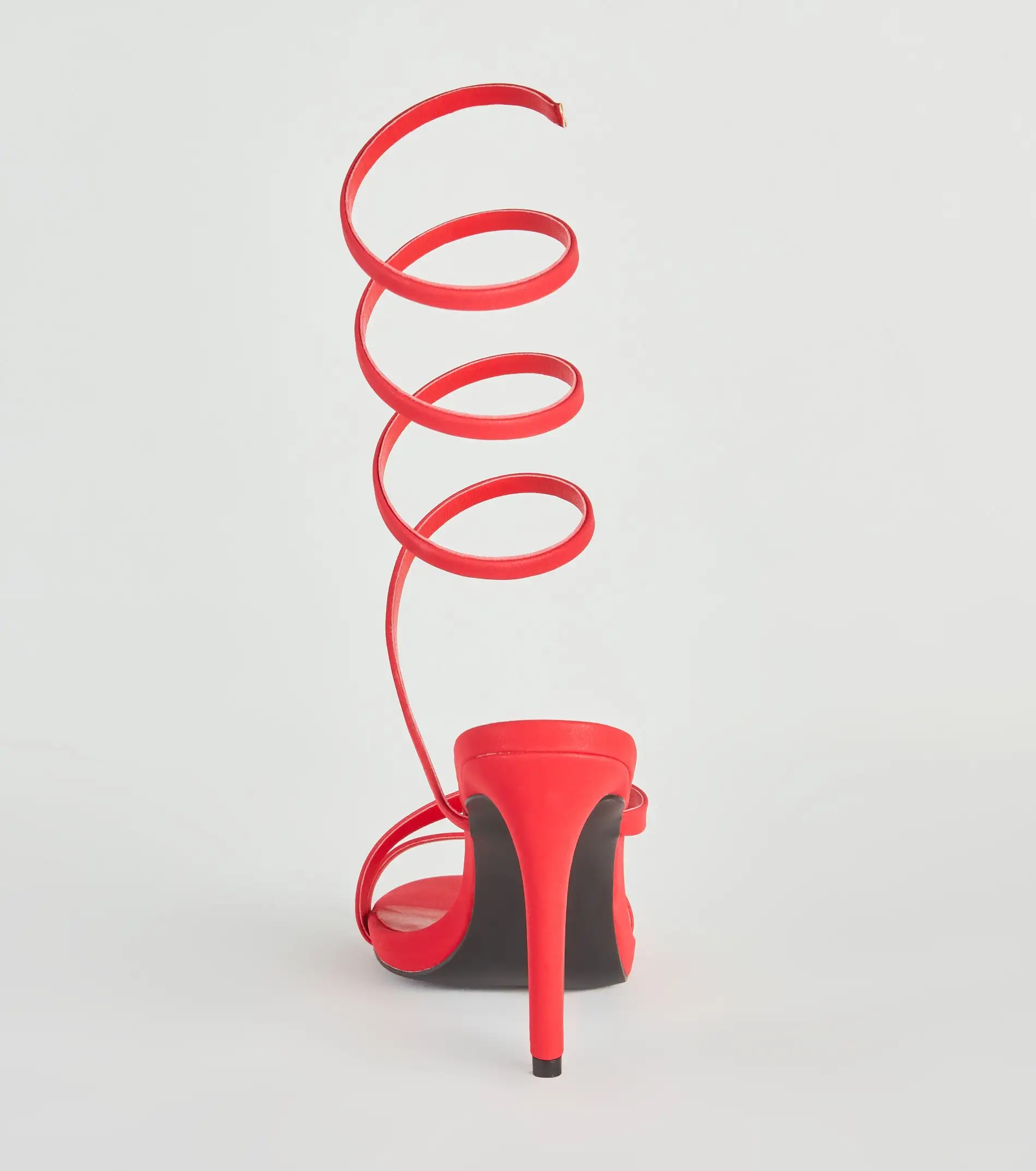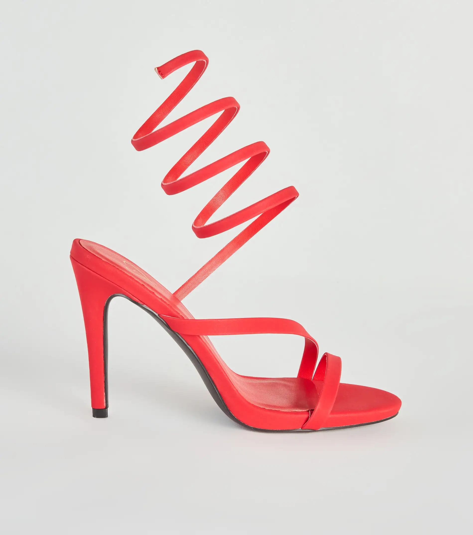 Amp up your night-out look with these hot spiral stilettos that will set the vibe. They feature an open almond toe with a strap, an asymmetric strap across the foot, a spiral strap design that wraps around the leg, an open back, and a sleek stiletto heel. Pair with a