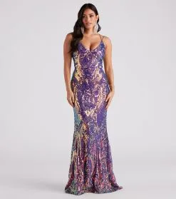Feel like a lost princess in this gorgeous gold dress! Anastasia features a scallop V neckline, built in cups, thin adjustable straps and a floor length sheath silhouette with a high slit. She is composed of a lined tulle fabric that features gold floral embroidery throughout. Includes zipper closure.