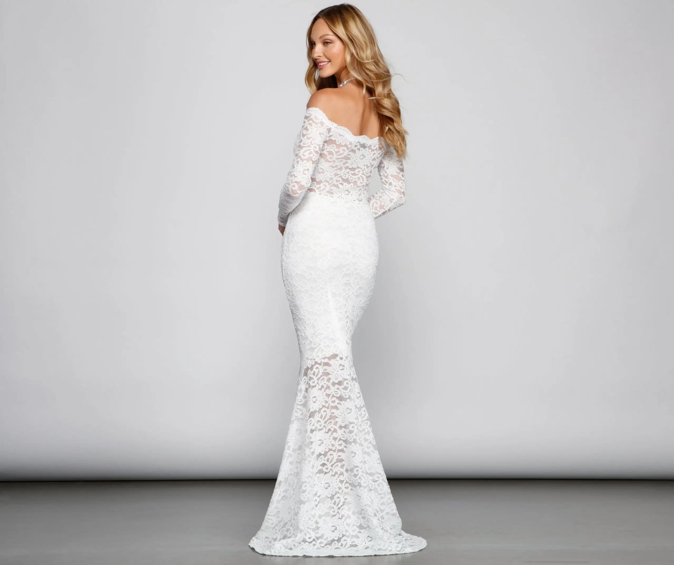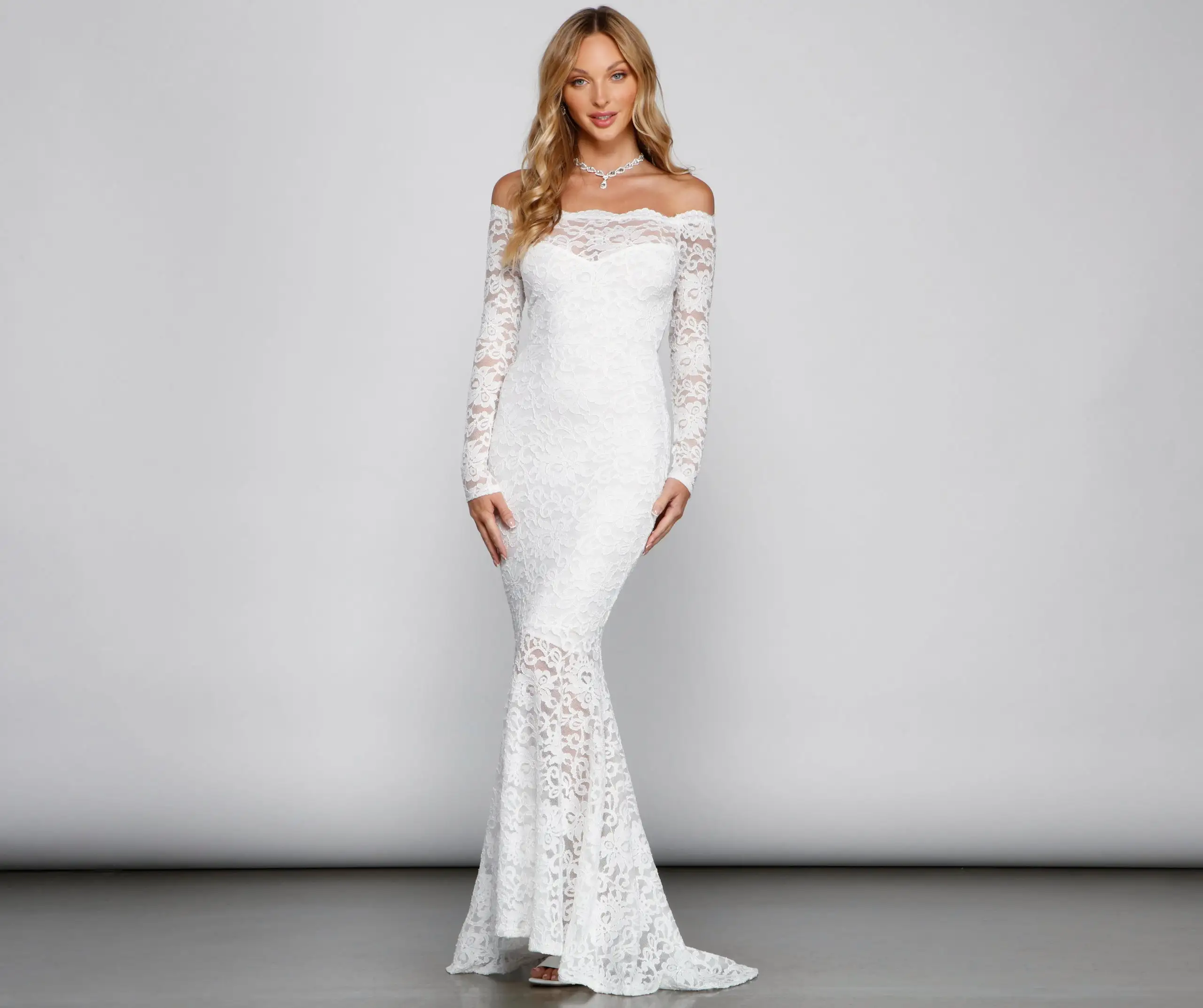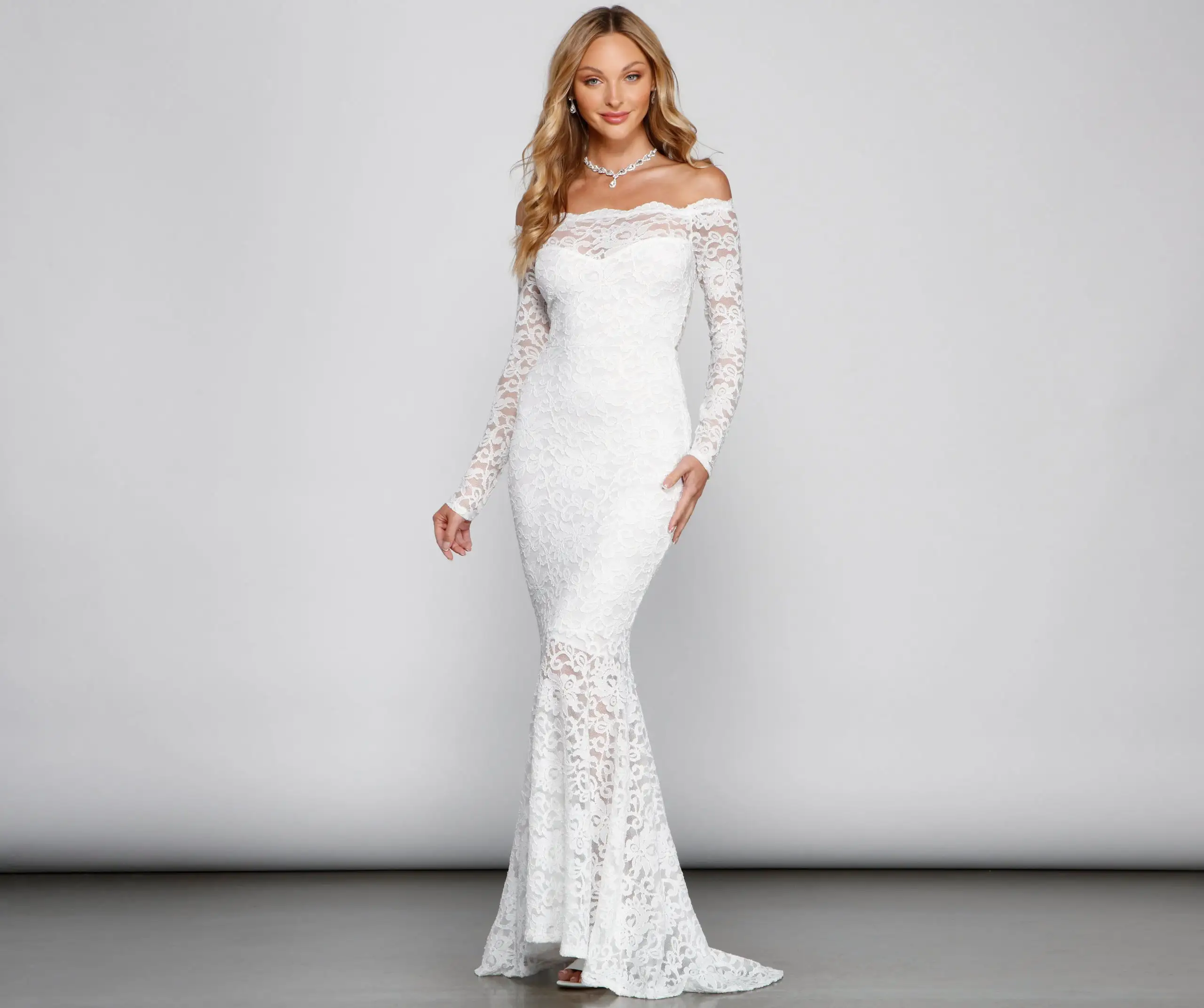 Stun in a timeless lace dress that makes a captivating impression! Betty features an off-the-shoulder neckline with scalloped lace trim, a sweetheart bust, long unlined sleeves, a floral lace pattern throughout the chic mermaid silhouette. The dress is composed of a lined lace fabric that offers a form hugging fit with a slight stretch. Complete look with nude heels and a