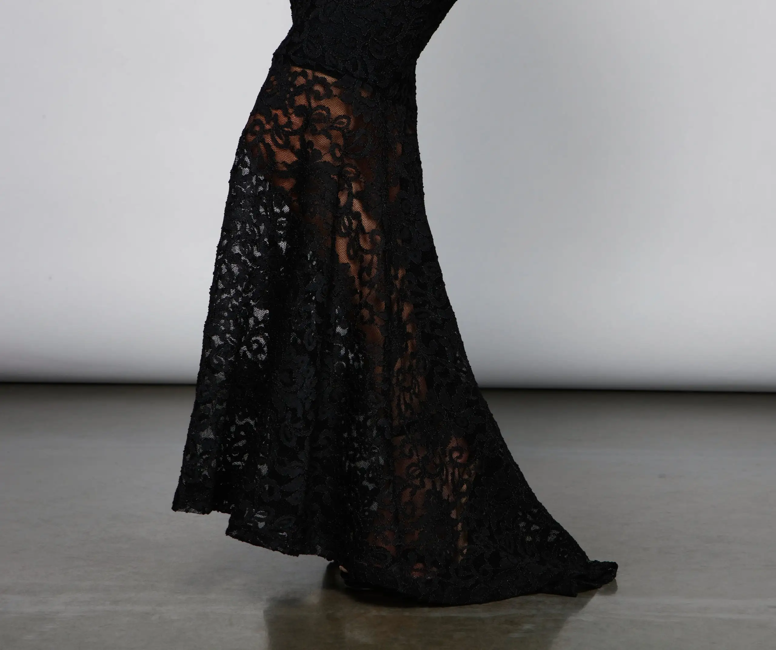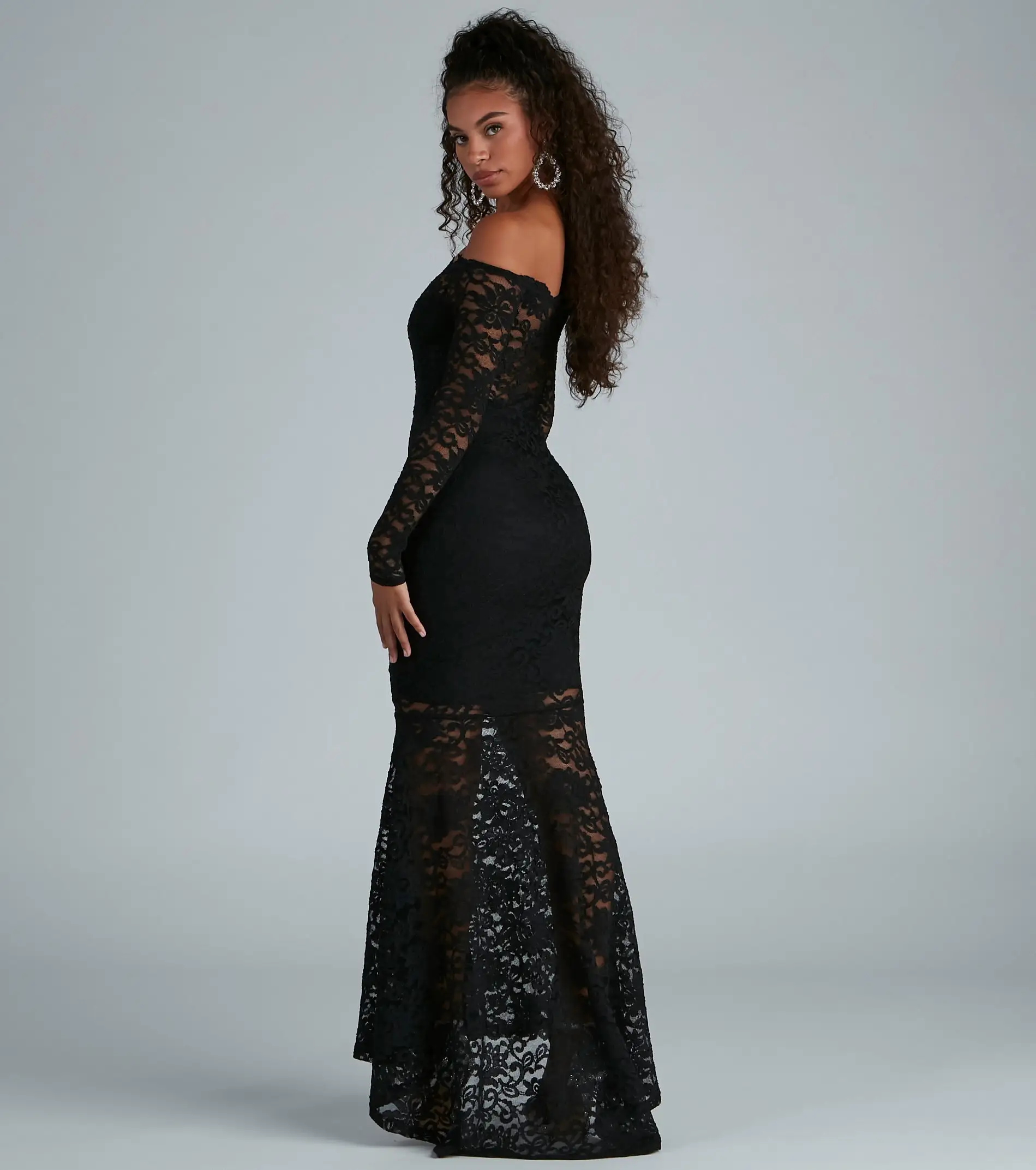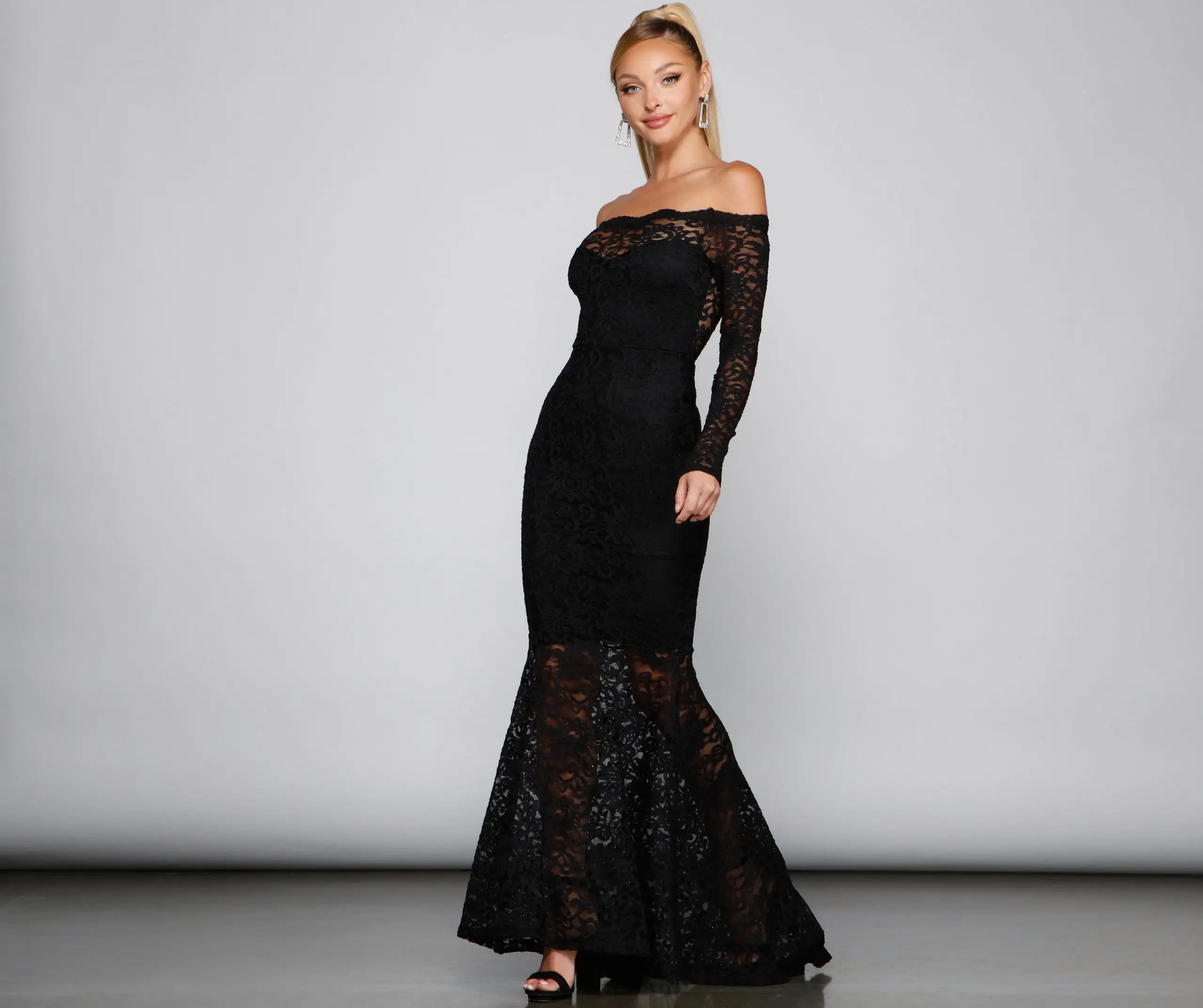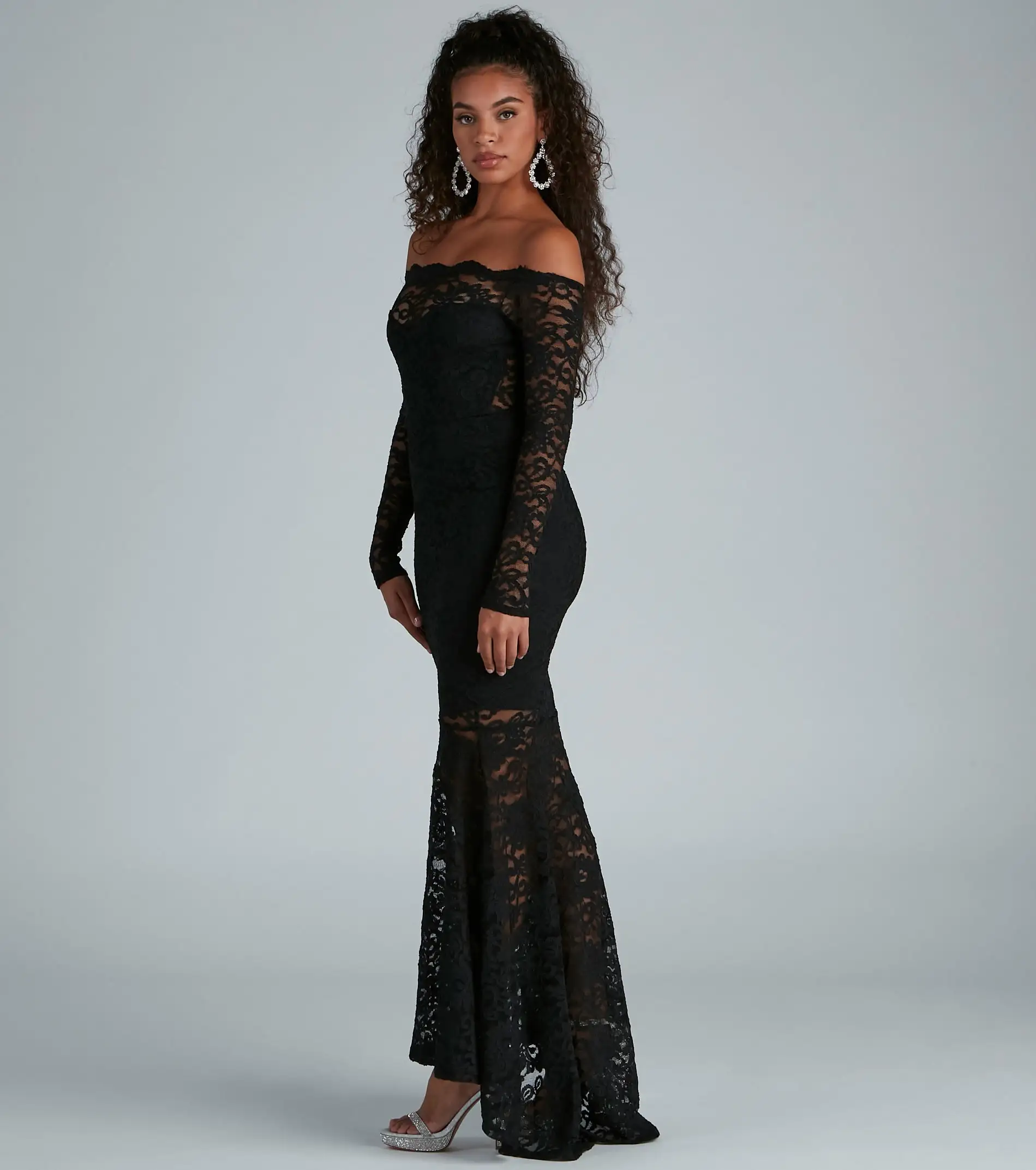 Stun in a timeless lace dress that makes a captivating impression! Betty features an off-the-shoulder neckline with scalloped lace trim, a sweetheart bust, long unlined sleeves, a floral lace pattern throughout the chic mermaid silhouette. The dress is composed of a lined lace fabric that offers a form hugging fit with a slight stretch. Complete look with nude heels and a