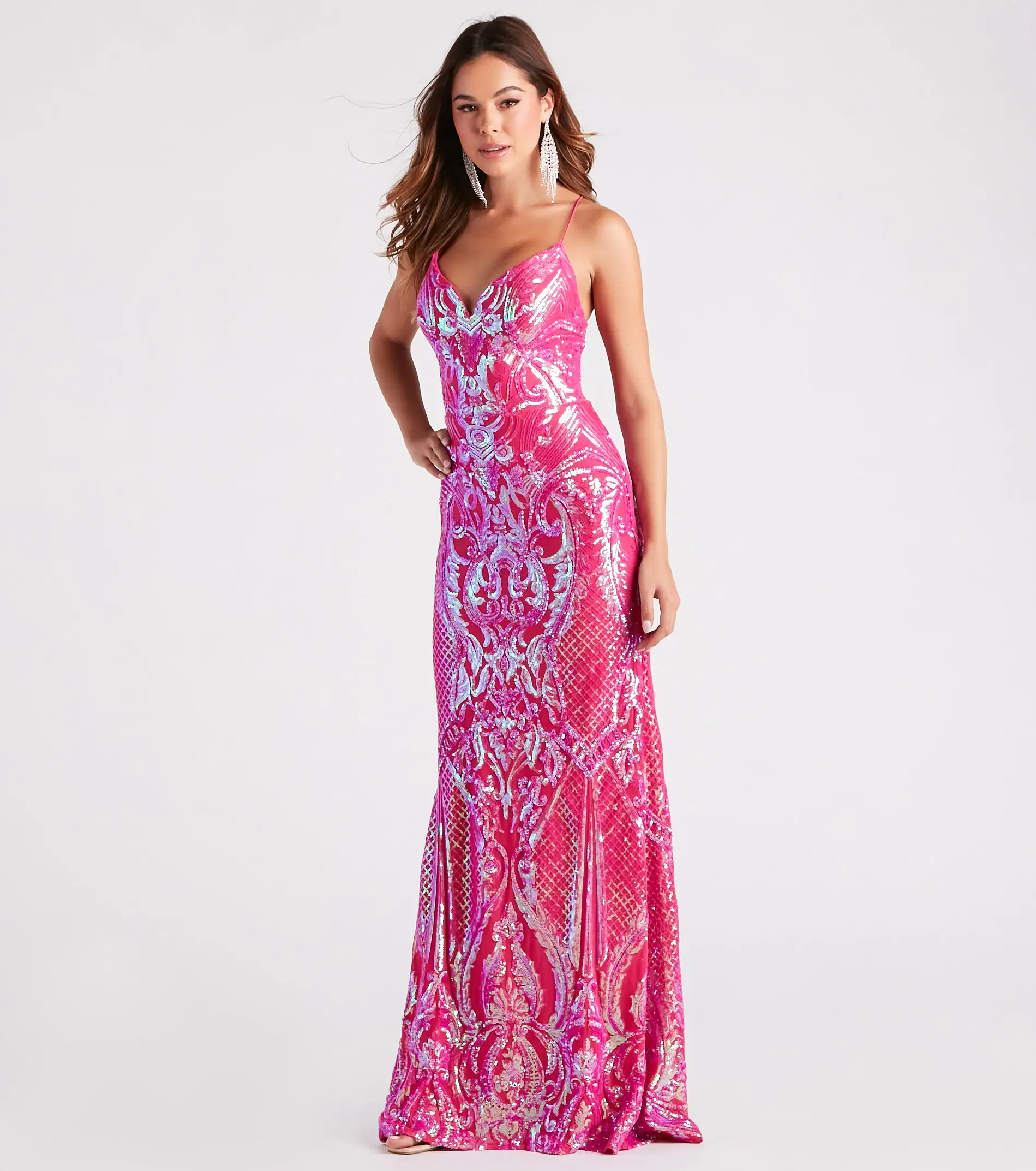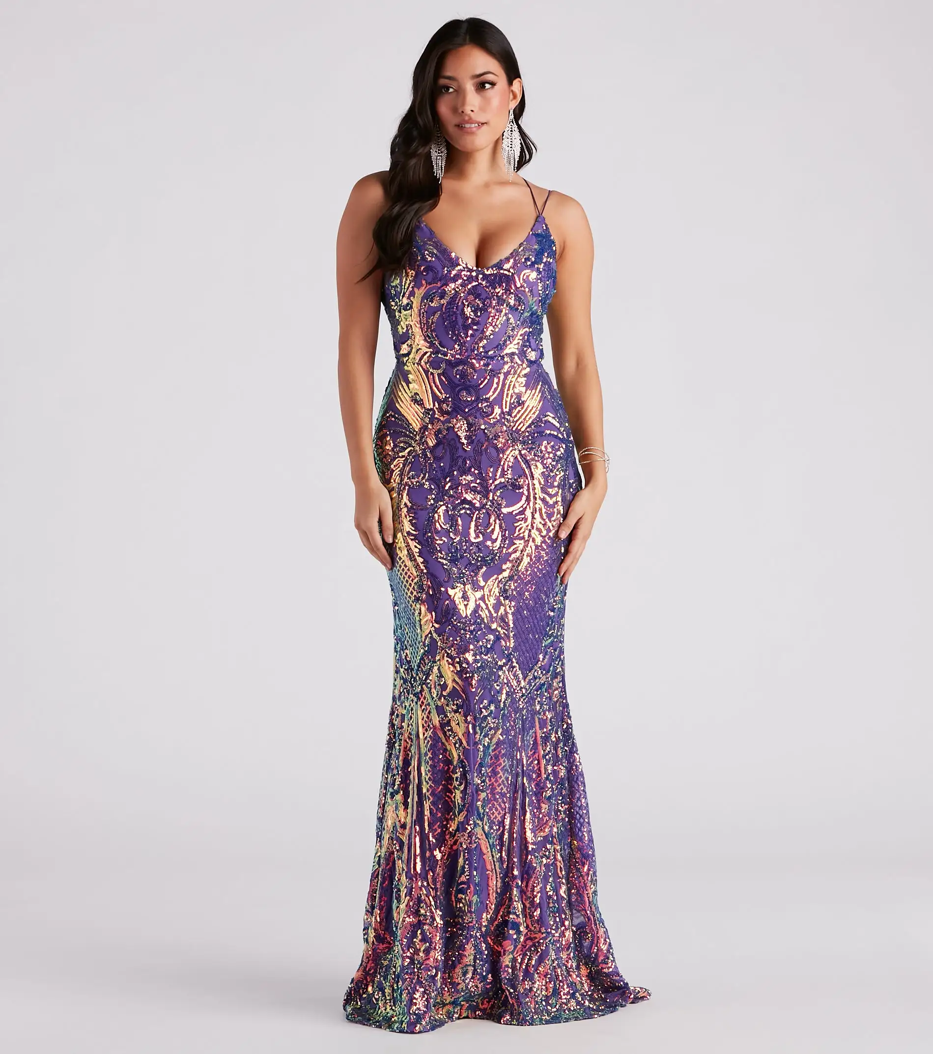 Elegance is an understatement when it comes to the Camren formal sequin dress! Radiant the night in an everlasting glow at weddings, prom, or celebration parties! She features a sleeveless plunge V-neckline with a wire insert, padded bust, bungee spaghetti straps that shape the strappy back design, a mermaid silhouette, and a floor-length hem. The formal dress is composed of a shimmering iridescent sequin-embroidered mesh fabric with a stretchy knit lining. Style with a sleek