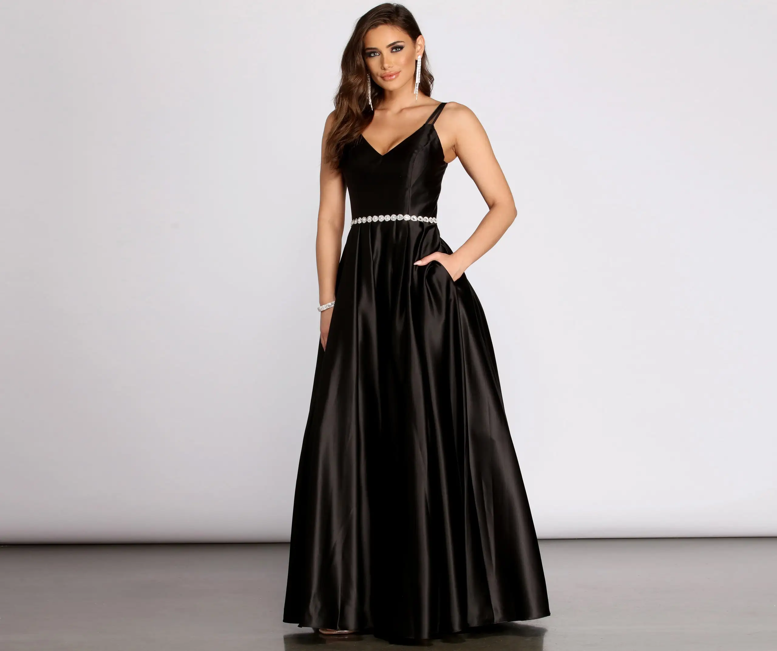 Feel like an absolute princess in our stunning Caris! Her plunging V neckline leads to a gorgeous arrangement of twinkling rhinestones along the waist. You’ll be twirling around nonstop in her dramatic and voluminous ball gown. Finish the look off by adding some rhinestone earrings!