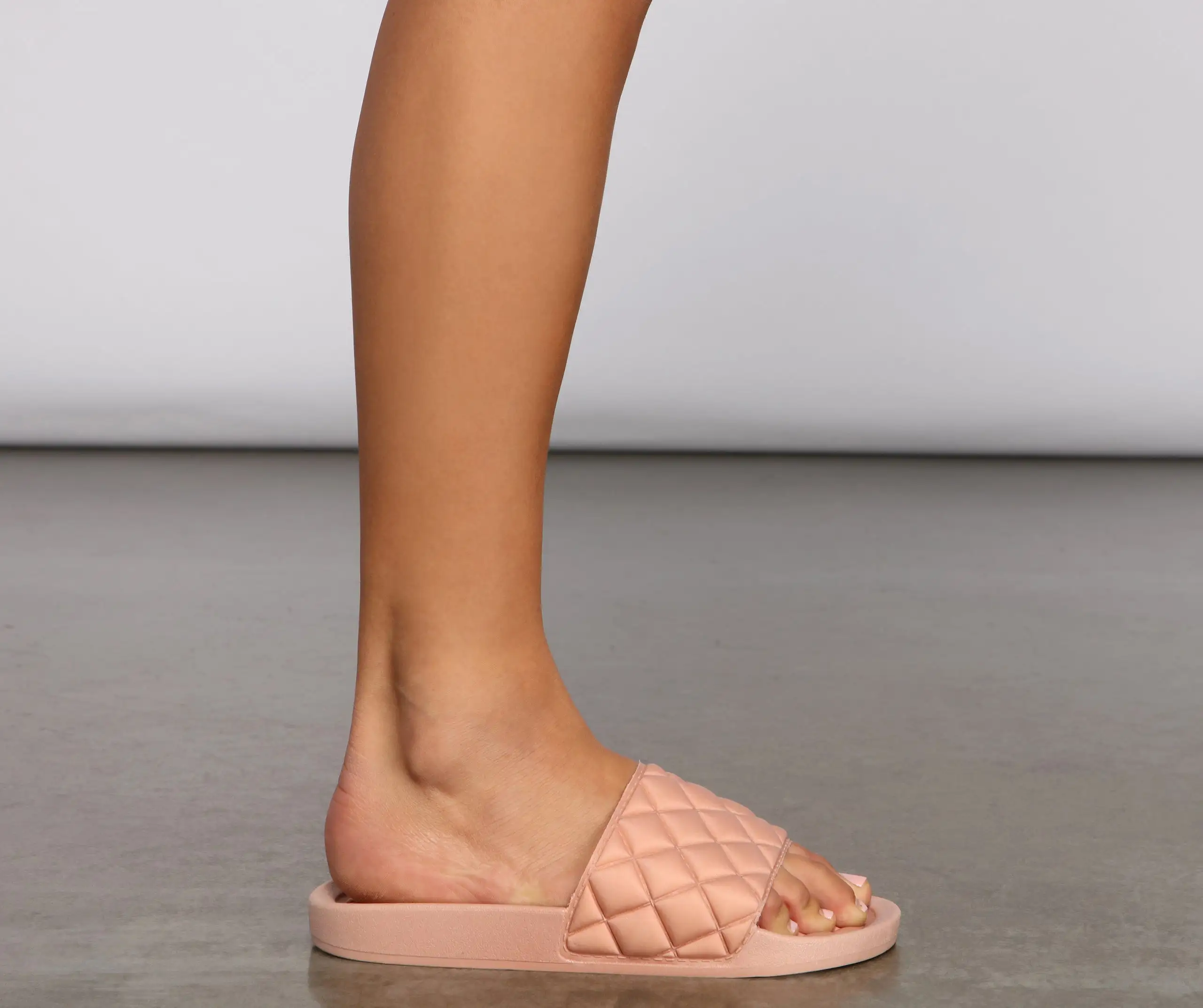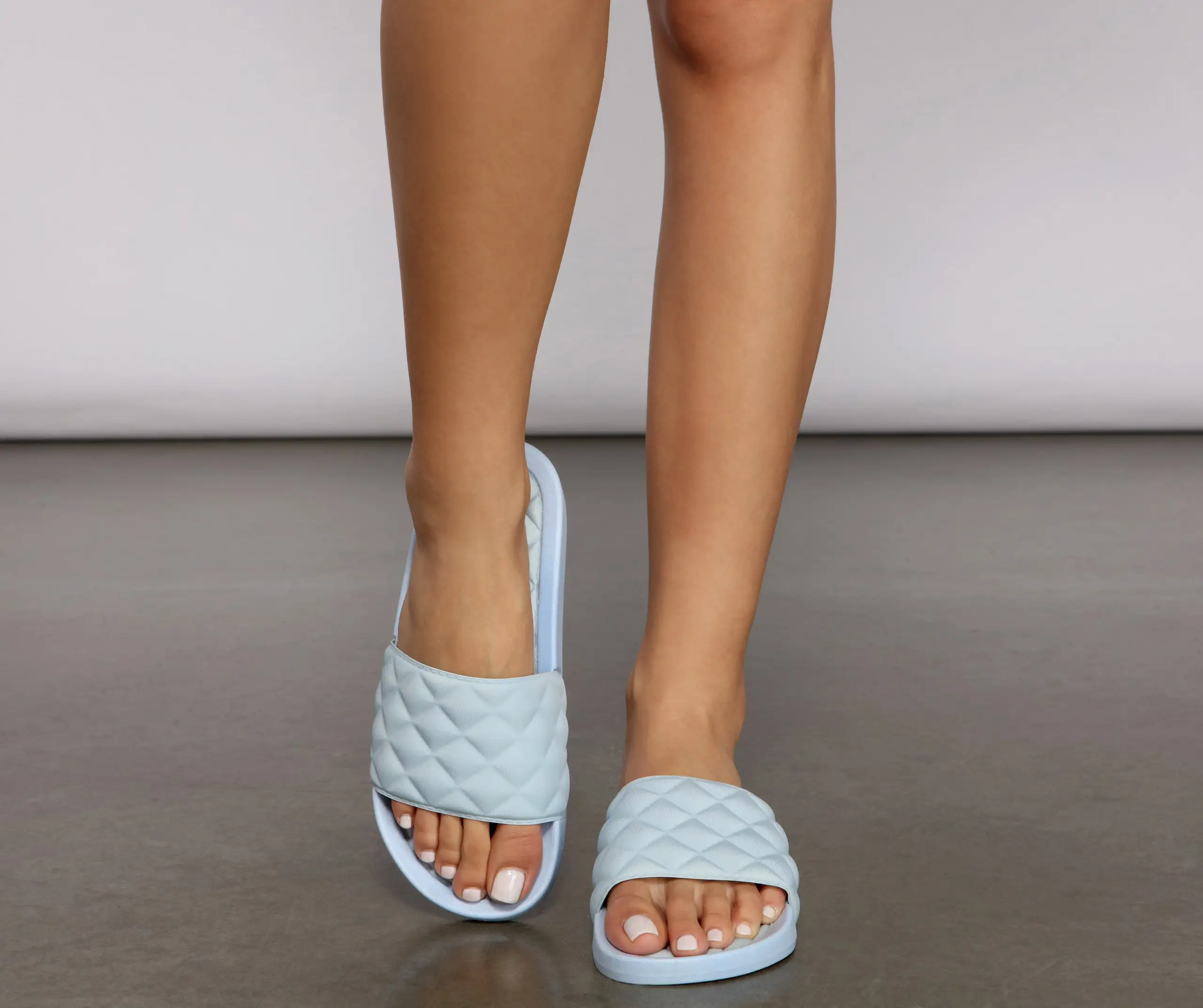 Showcase a casual trendy vibe this summer in these cool slides! They feature an open round toe, a wide toe strap, a quilted design, and a flat sole. Style these sandals with your fave