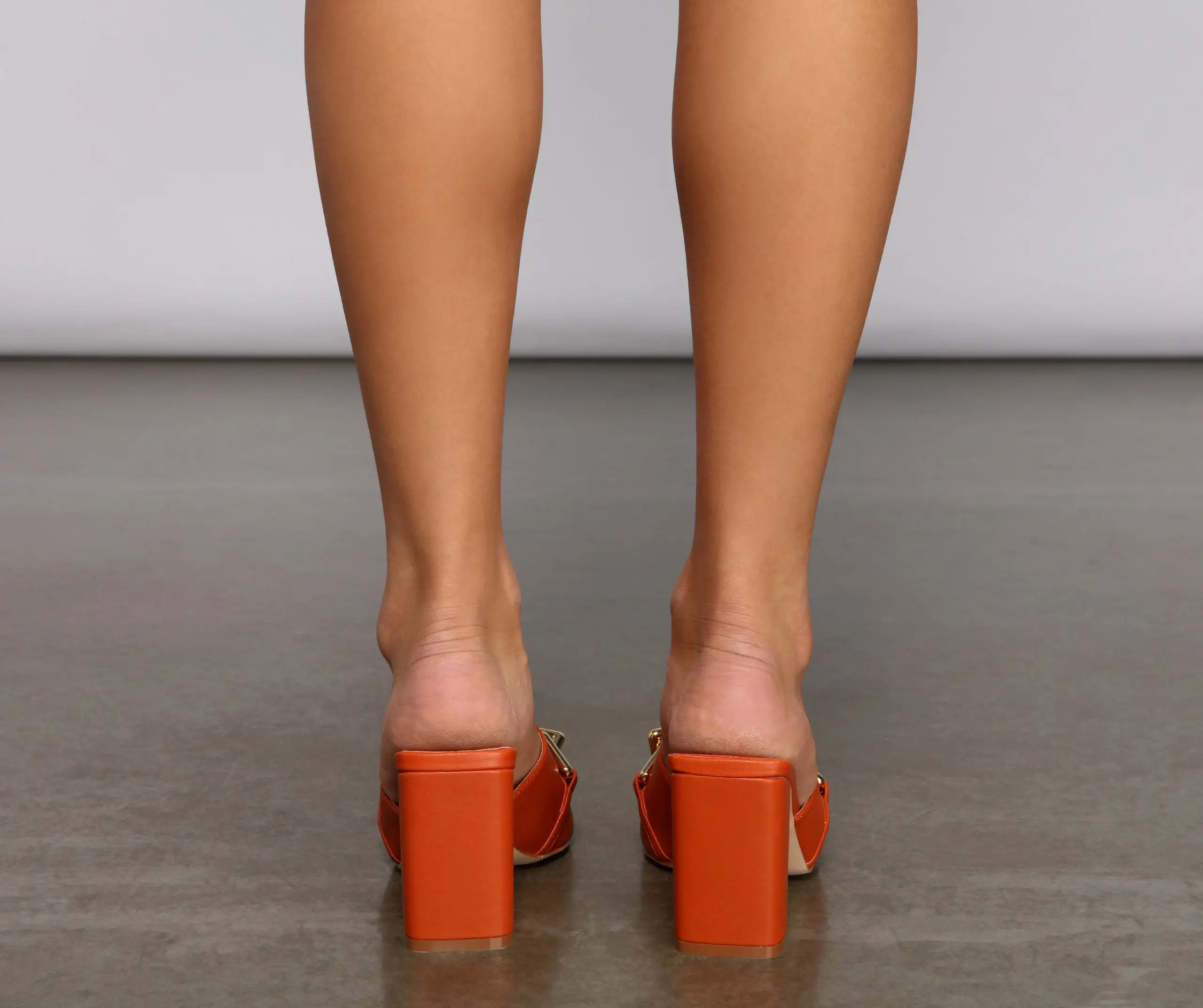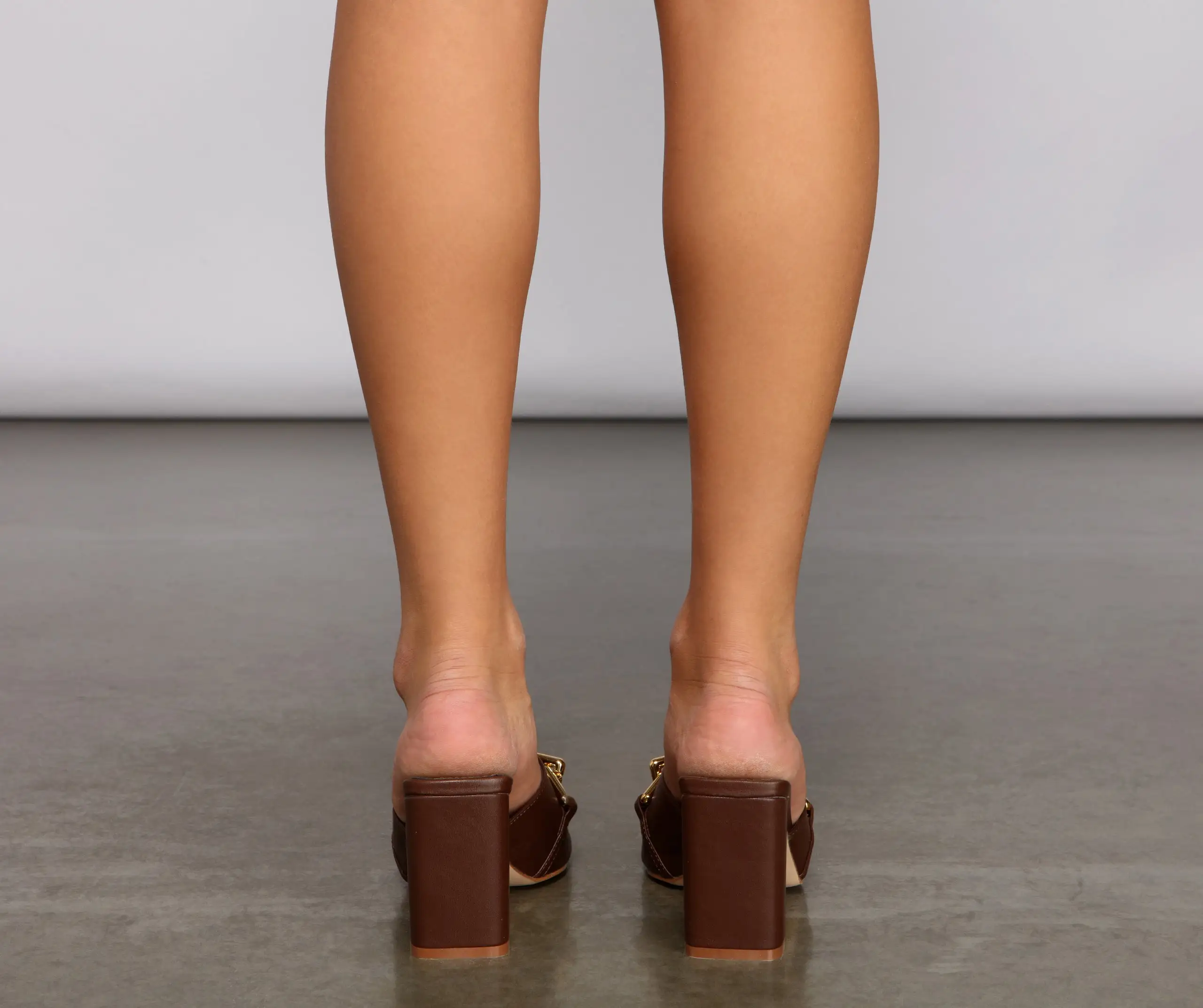 Keep it chic with mules that elevate your looks with stunning details. The mules feature an open back, a square toe, a wide band over the toe with a chunky chain-link accent, and a block heel. The mules are composed of faux leather material. Complete the look with a