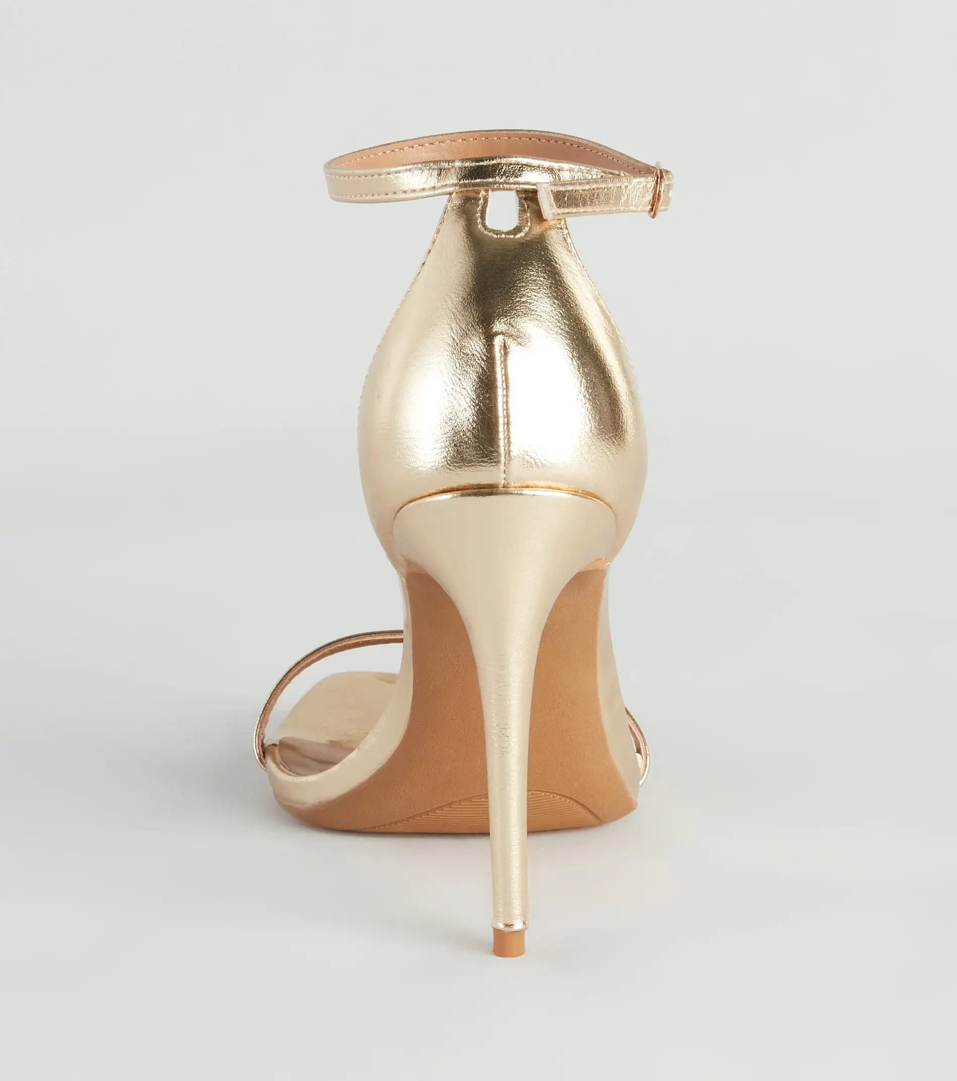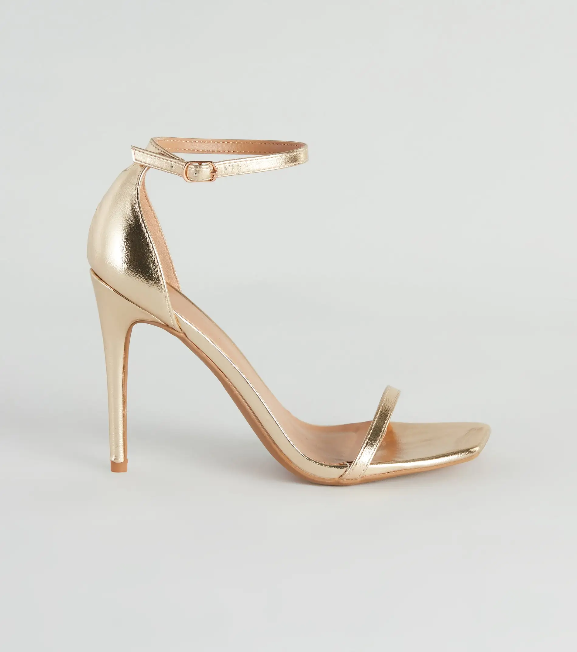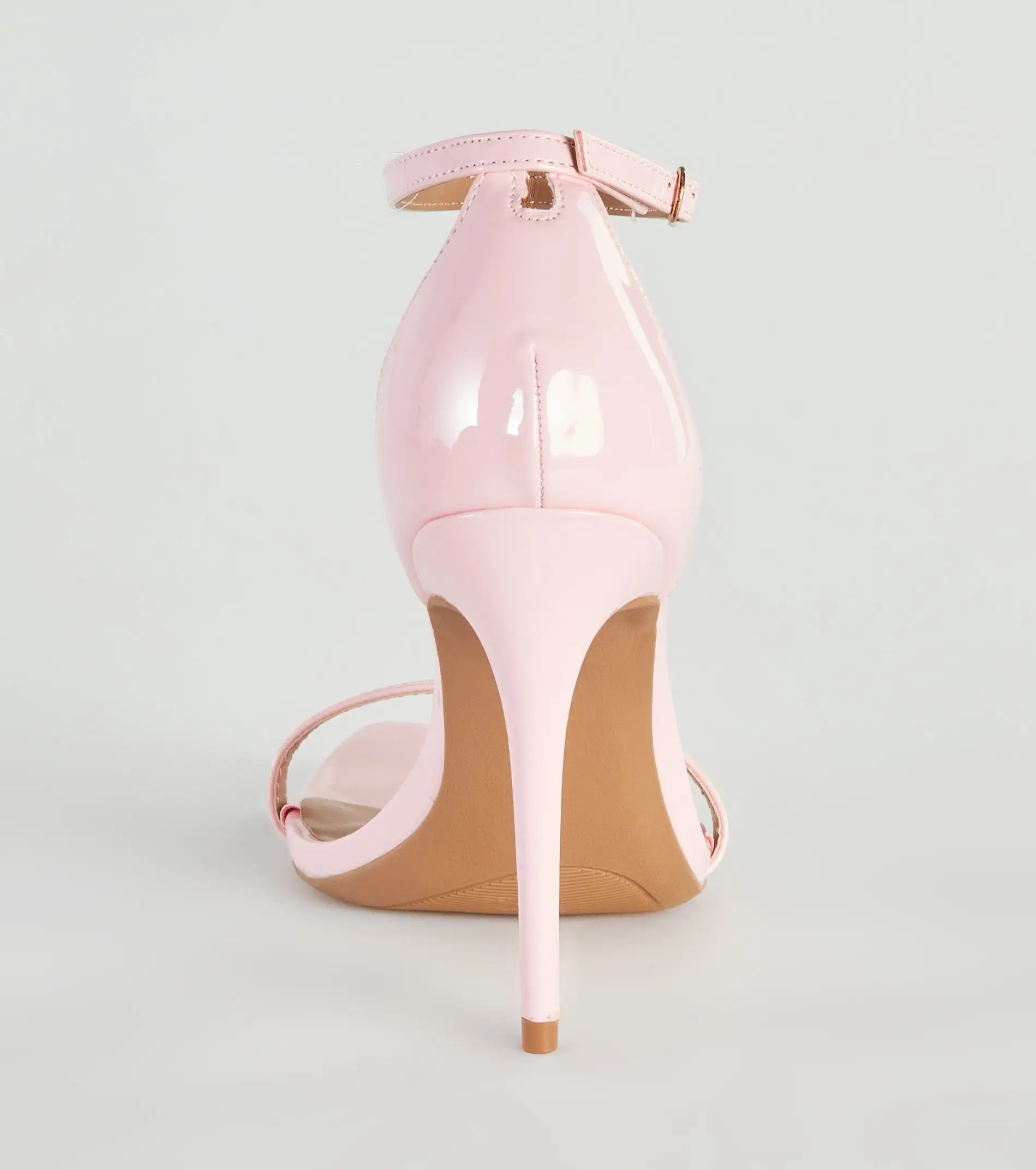 These classic faux leather stiletto heels are the perfect pick for your dressy events. They feature an open square toe with a thin strap, a thin adjustable ankle strap, a closed back, and a sleek stiletto heel. The heels are composed of a patent faux leather material with a subtle cushioned insole. Style with an
