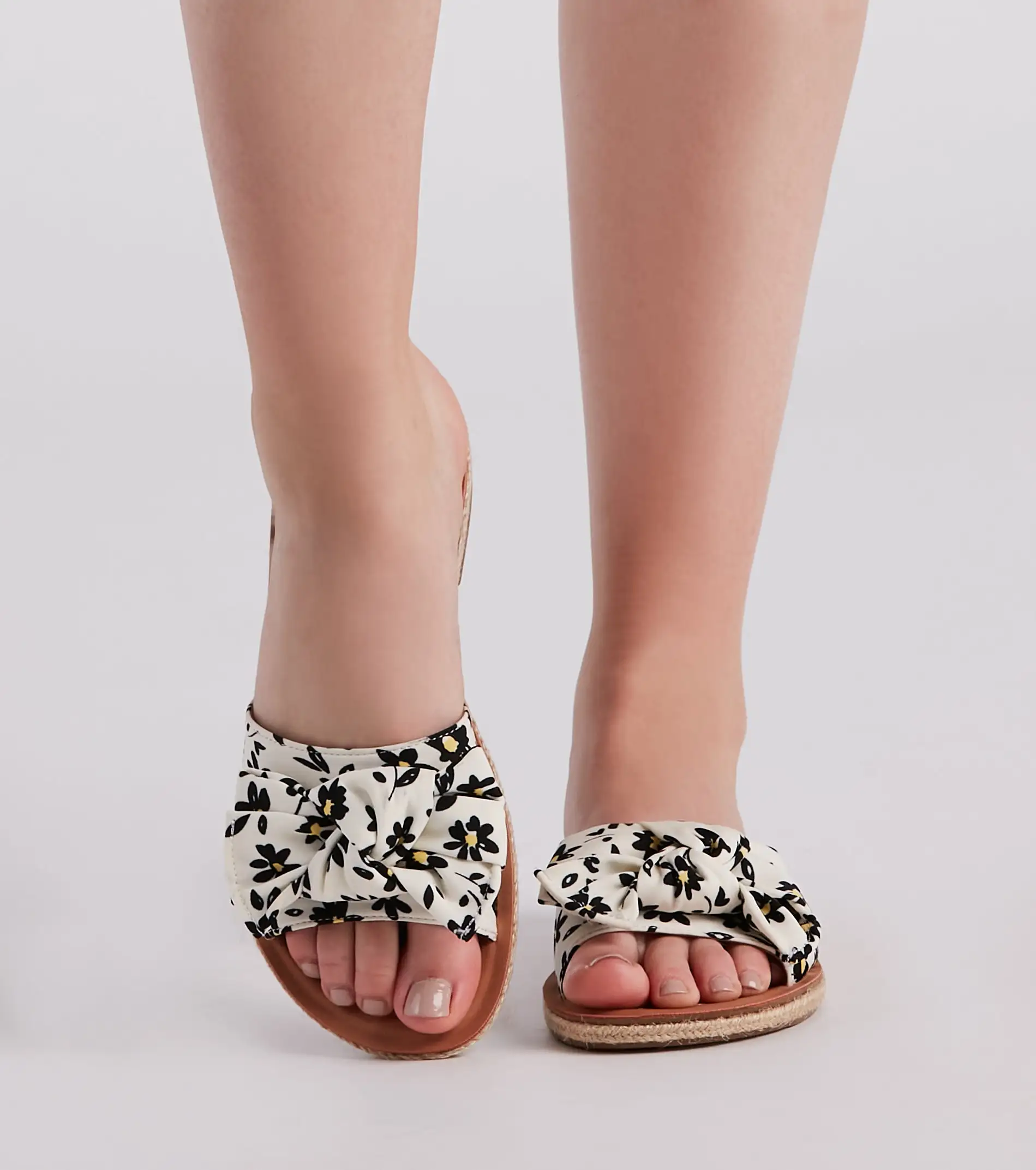 Oh-so-darling, these daisy floral print sandals will create a cute springtime look. They feature a round toe, a wide woven strap with a bow design and an adorable daisy print floral pattern, an open back for easy on-and-off styling, and a flat sole with an espadrille trim. Style with a