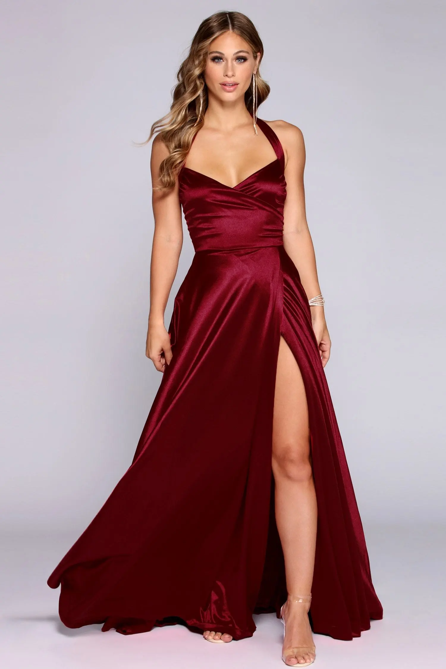 Radiate elegance and grace in our timelessly breath taking Diana dress! She features an ivory hue, a sleeveless bodice, a halter neck and a plunging wrap V bust. Her relaxed fit bodice leads to a sweeping floor length wrap skirt to make a lovely entrance. Dress is composed of a double lined stretchy satin fabric that offers a form hugging fit with a slight stretch.