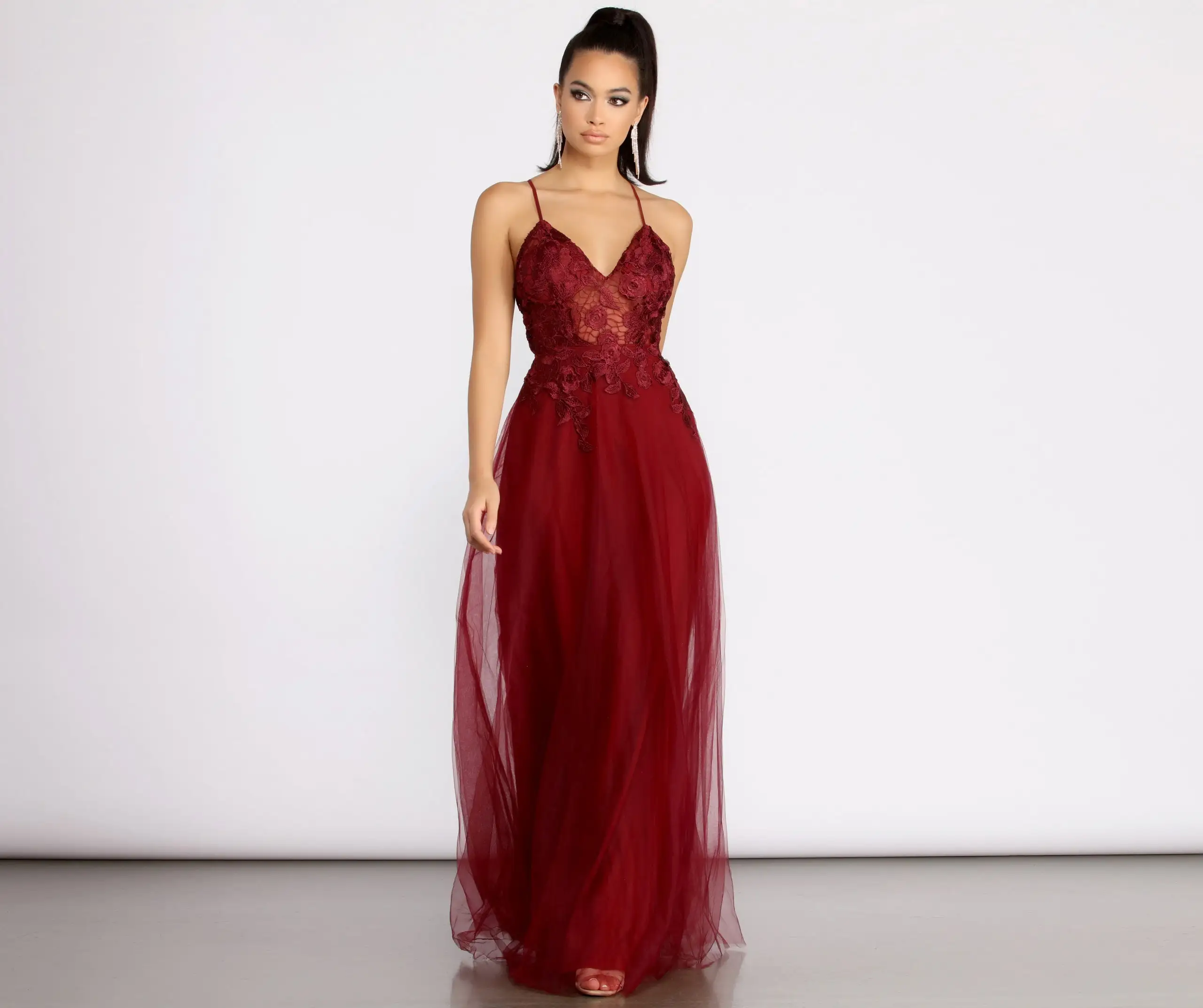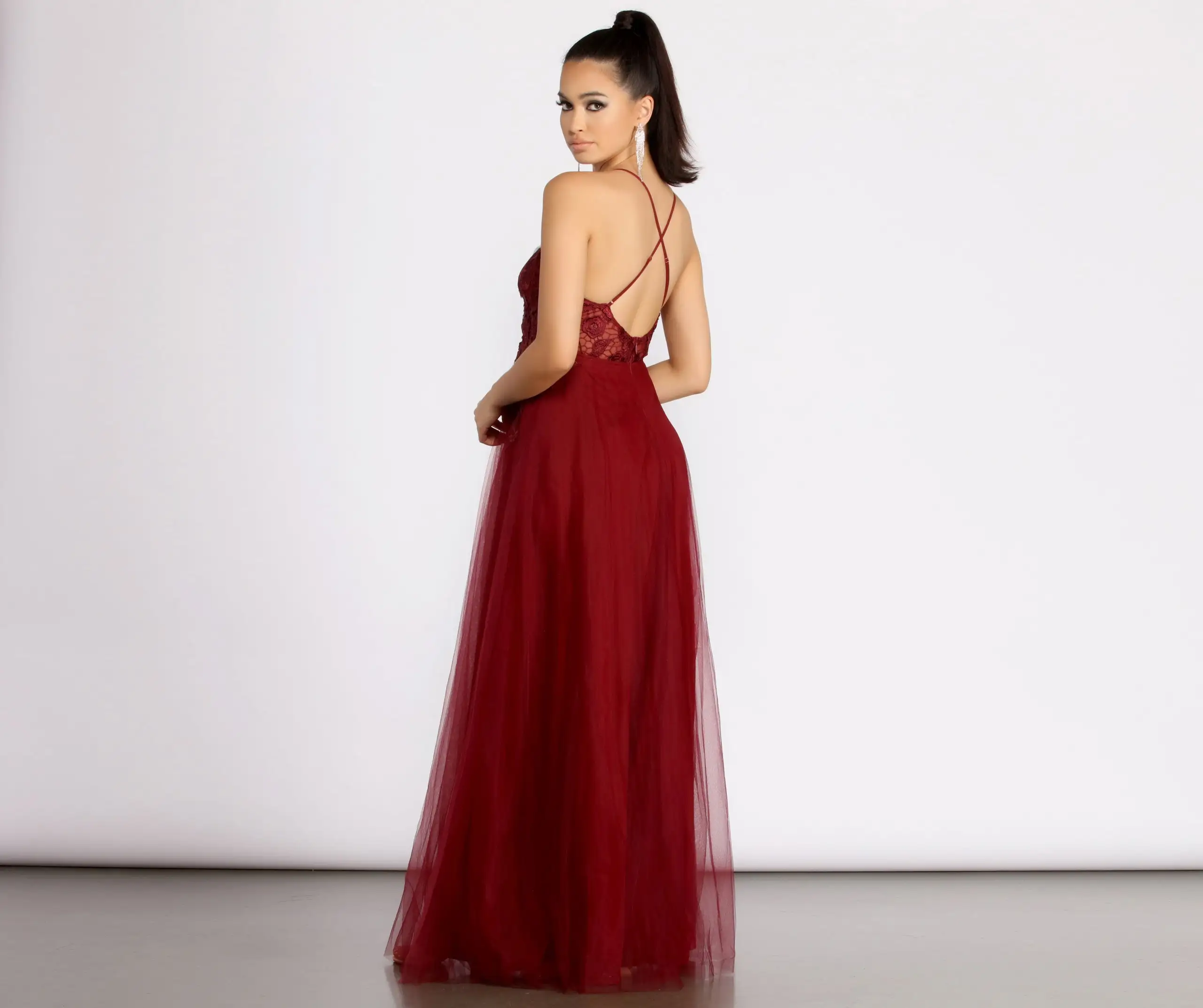 Captivate them all with elegant lace and a sweeping A-line silhouette in our Electra dress! Pair her with rhinestone accents and strappy stilettos for a breath-taking impression!