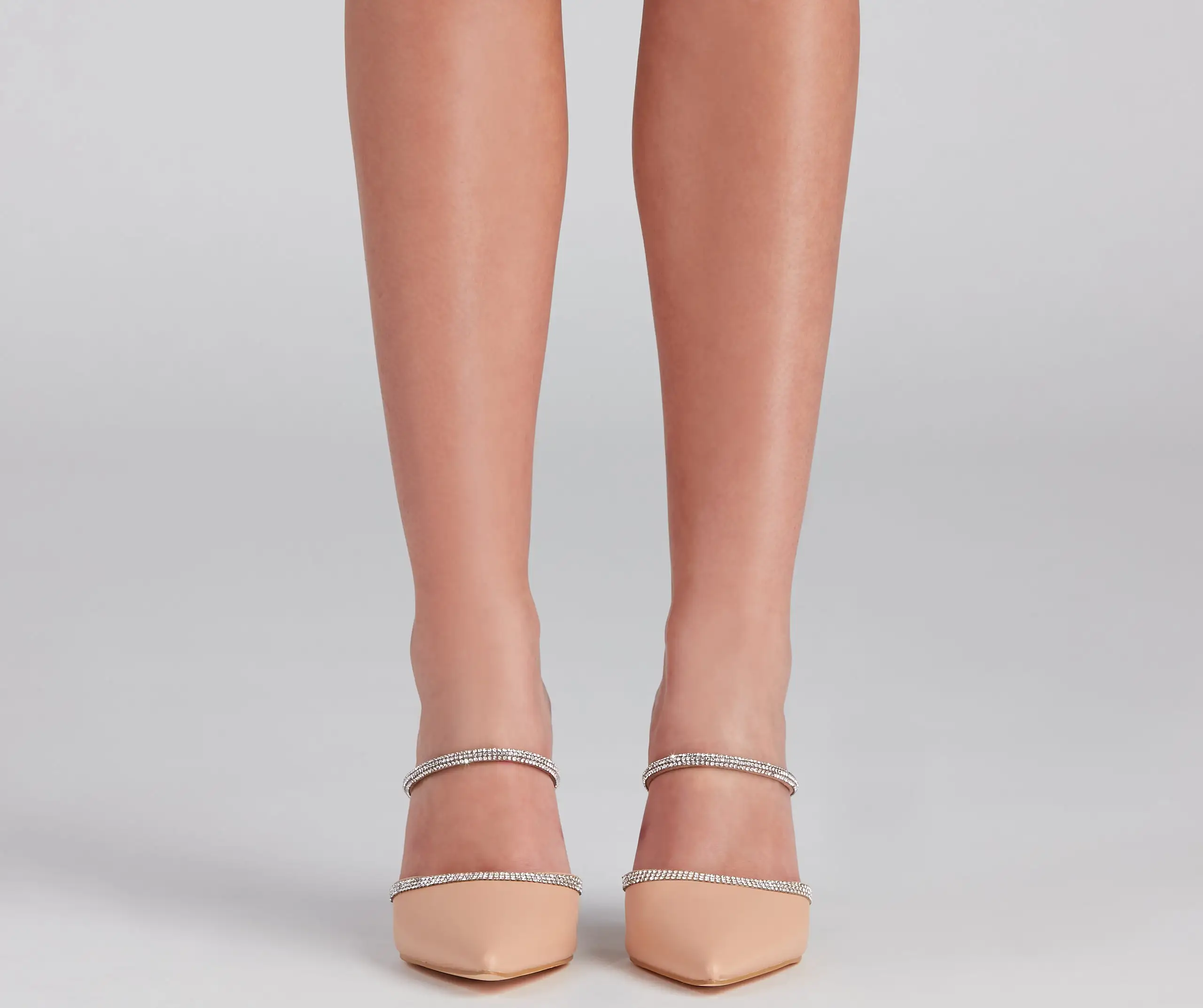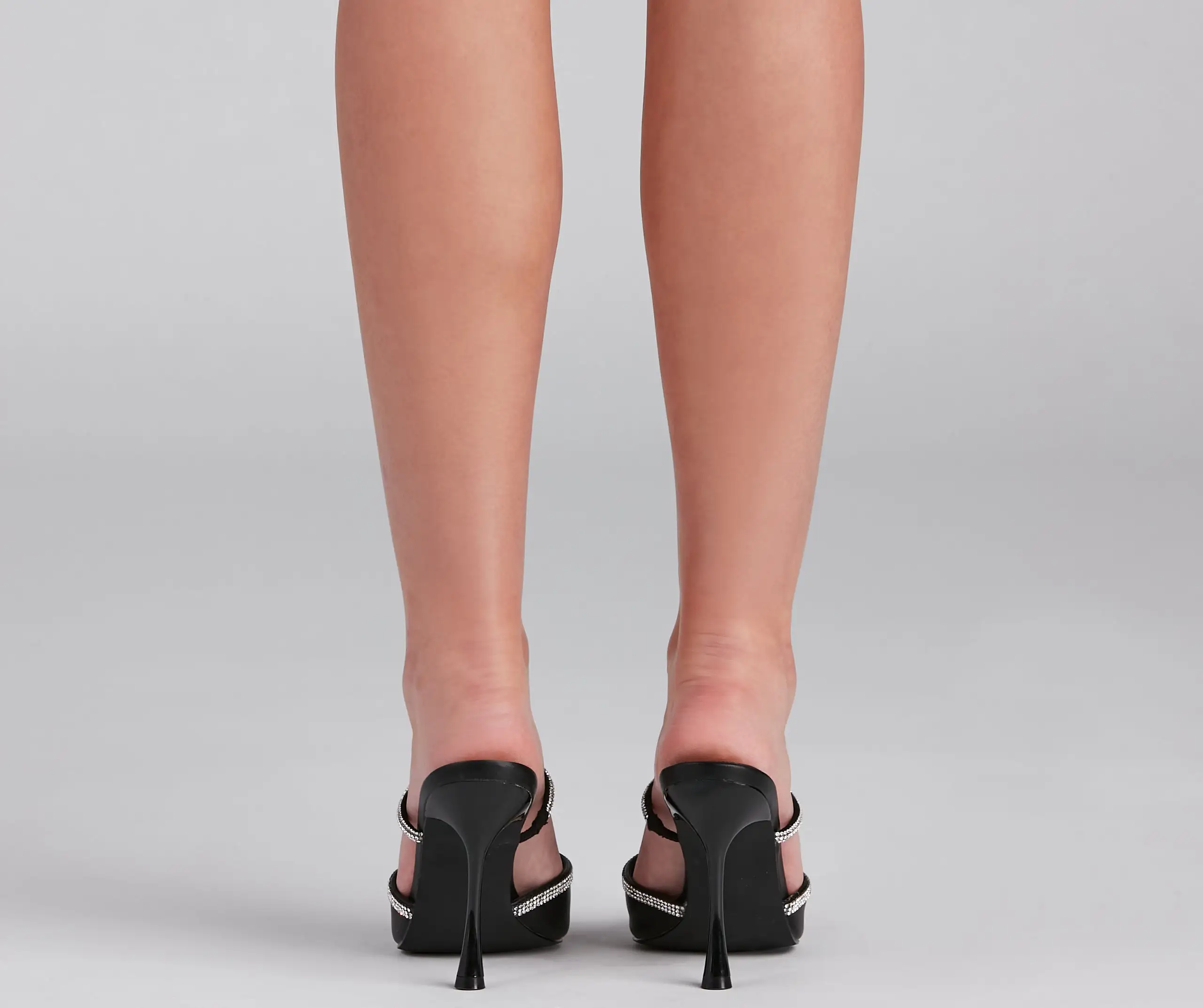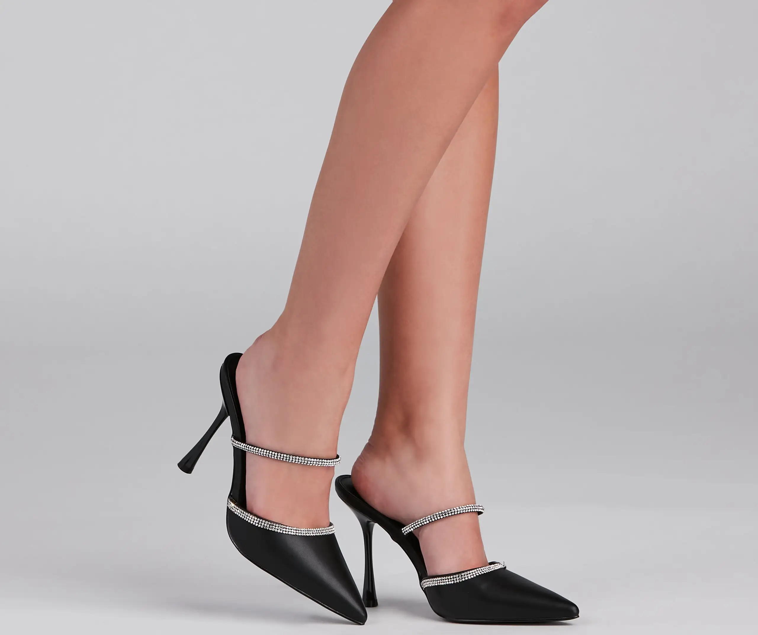 Step up your style with these elevated and glam pumps. They feature a closed pointed toe with a mini rhinestone trim, a sleek stiletto heel, and an open back with a rhinestone adorned strap that can be worn across the foot or on the back of the heel. Pair these pumps with a sparkly