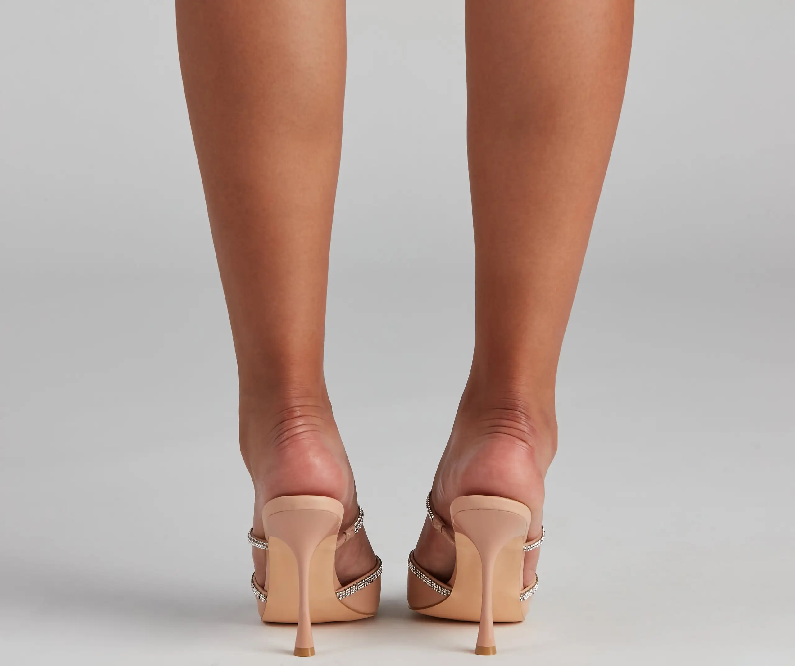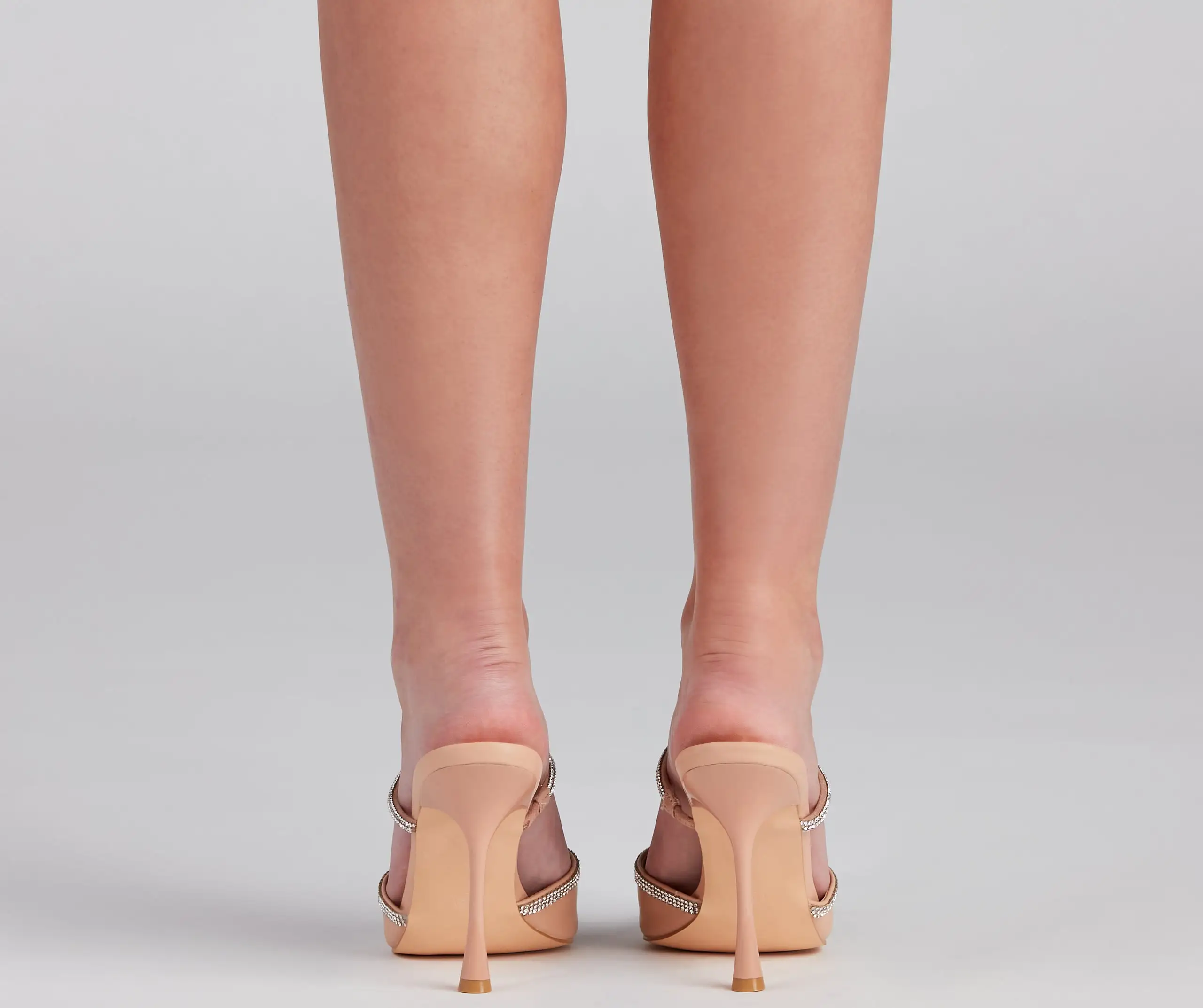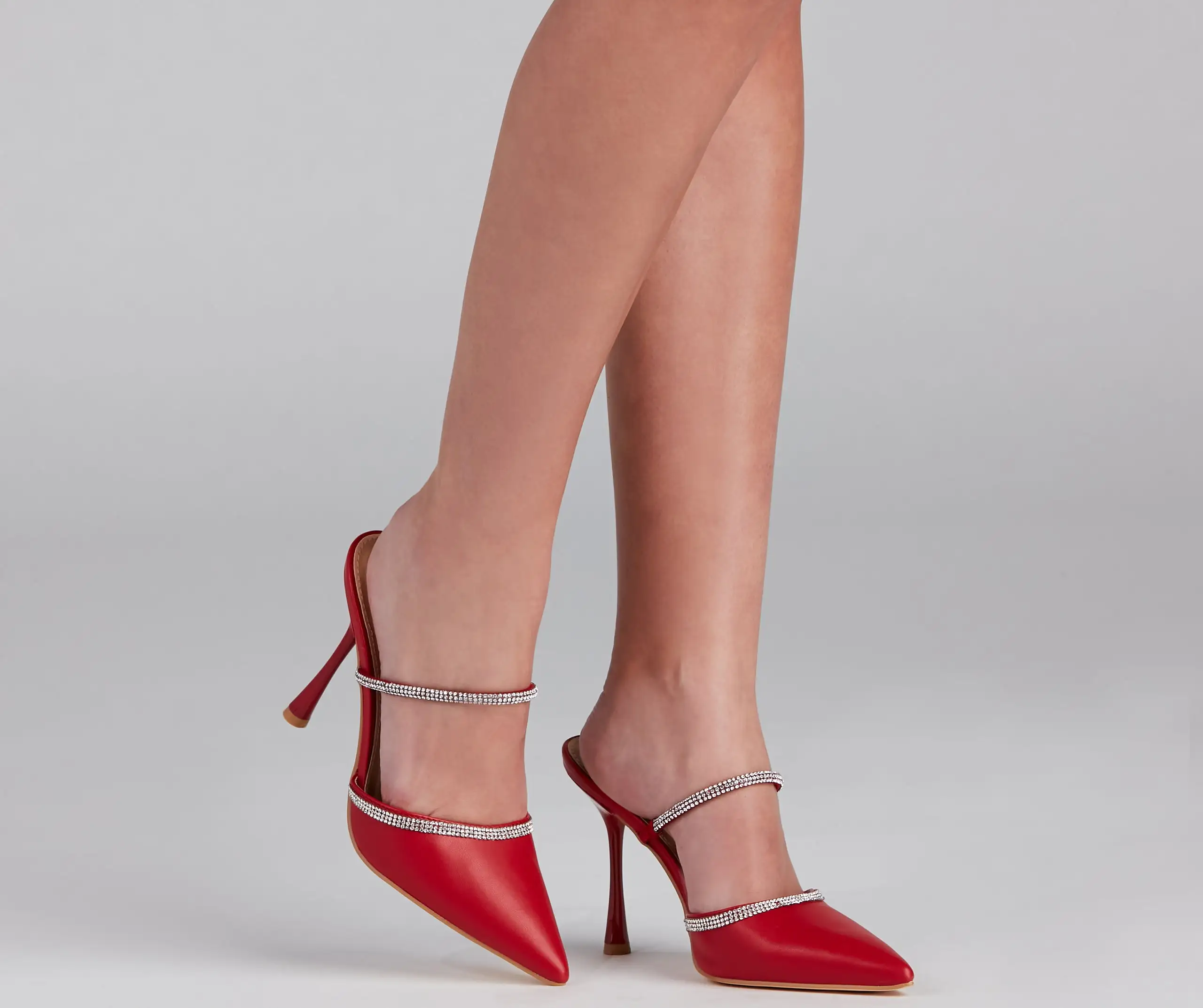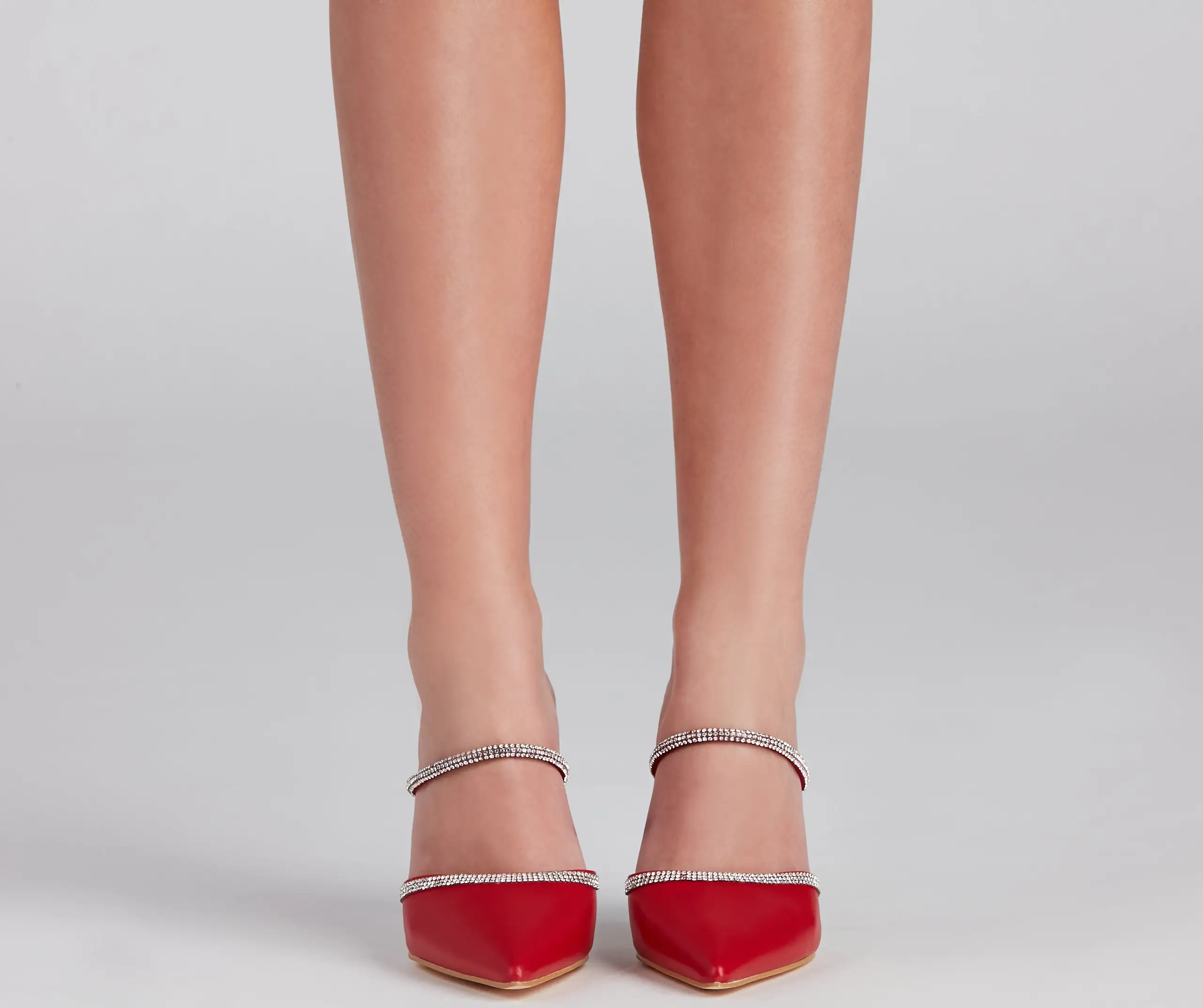 Step up your style with these elevated and glam pumps. They feature a closed pointed toe with a mini rhinestone trim, a sleek stiletto heel, and an open back with a rhinestone adorned strap that can be worn across the foot or on the back of the heel. Pair these pumps with a sparkly