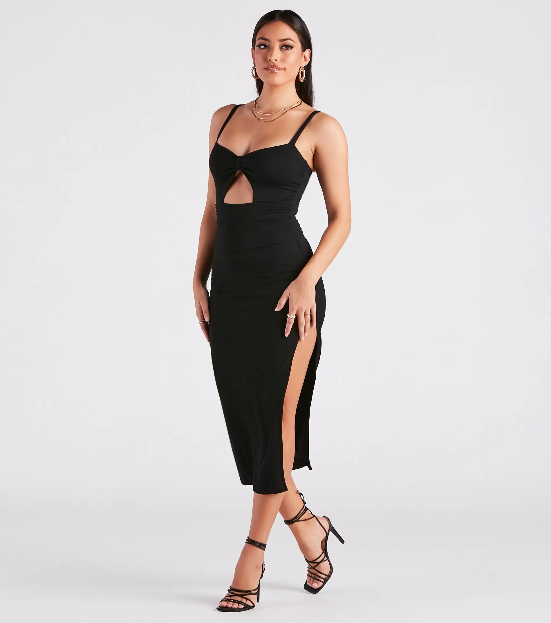 This chic cutout midi dress is elevated perfection! It features a sleeveless subtle sweetheart neckline with a knot detail at the center of the bust, an alluring keyhole cutout under the bust, spaghetti straps, a high waist seam to create a figure-flattering look, a midi-length hem with a thigh-high side slit, and a bodycon silhouette that will hug your curves. The ribbed knit fabric offers plenty of stretch. Style with a pair of