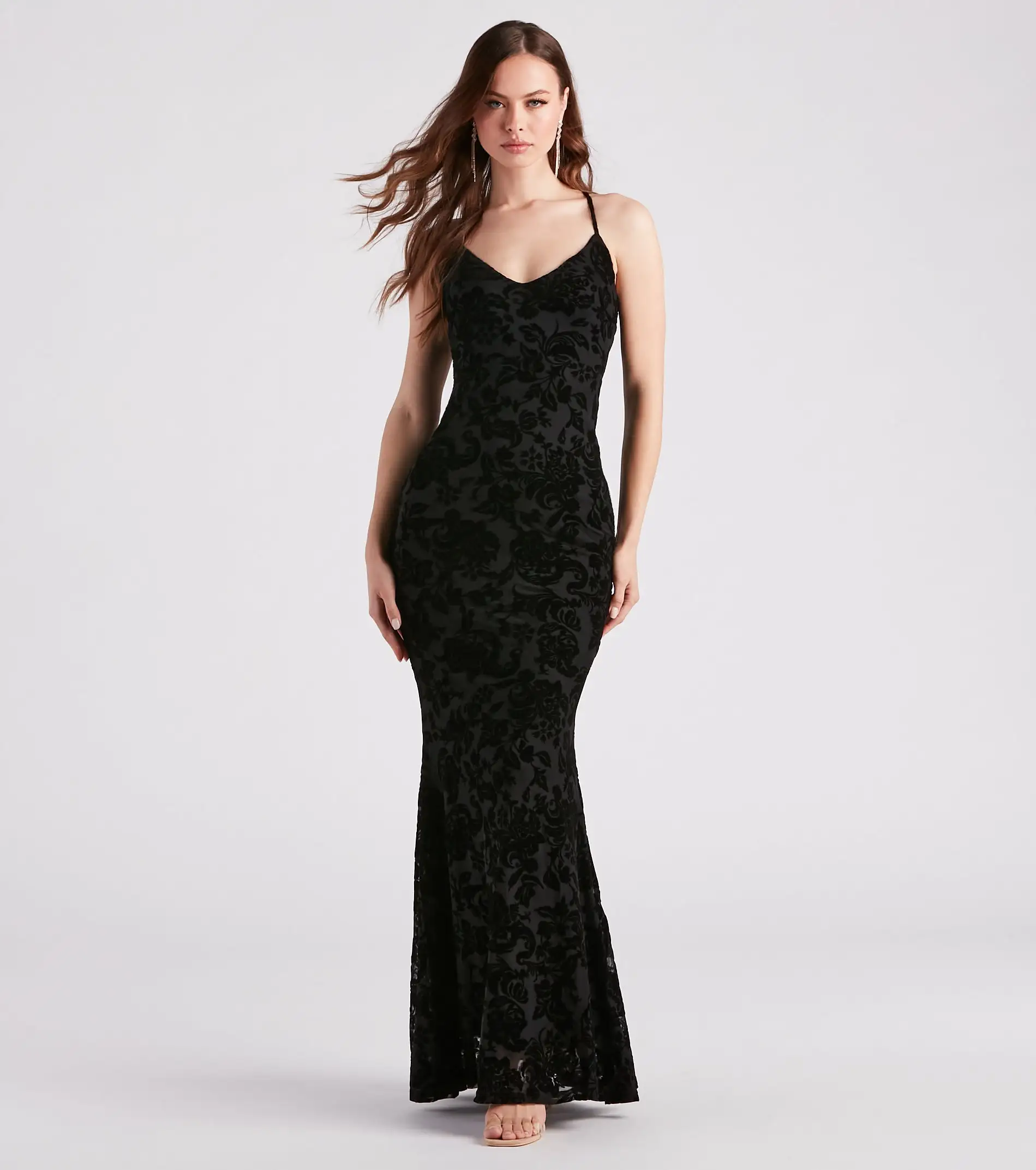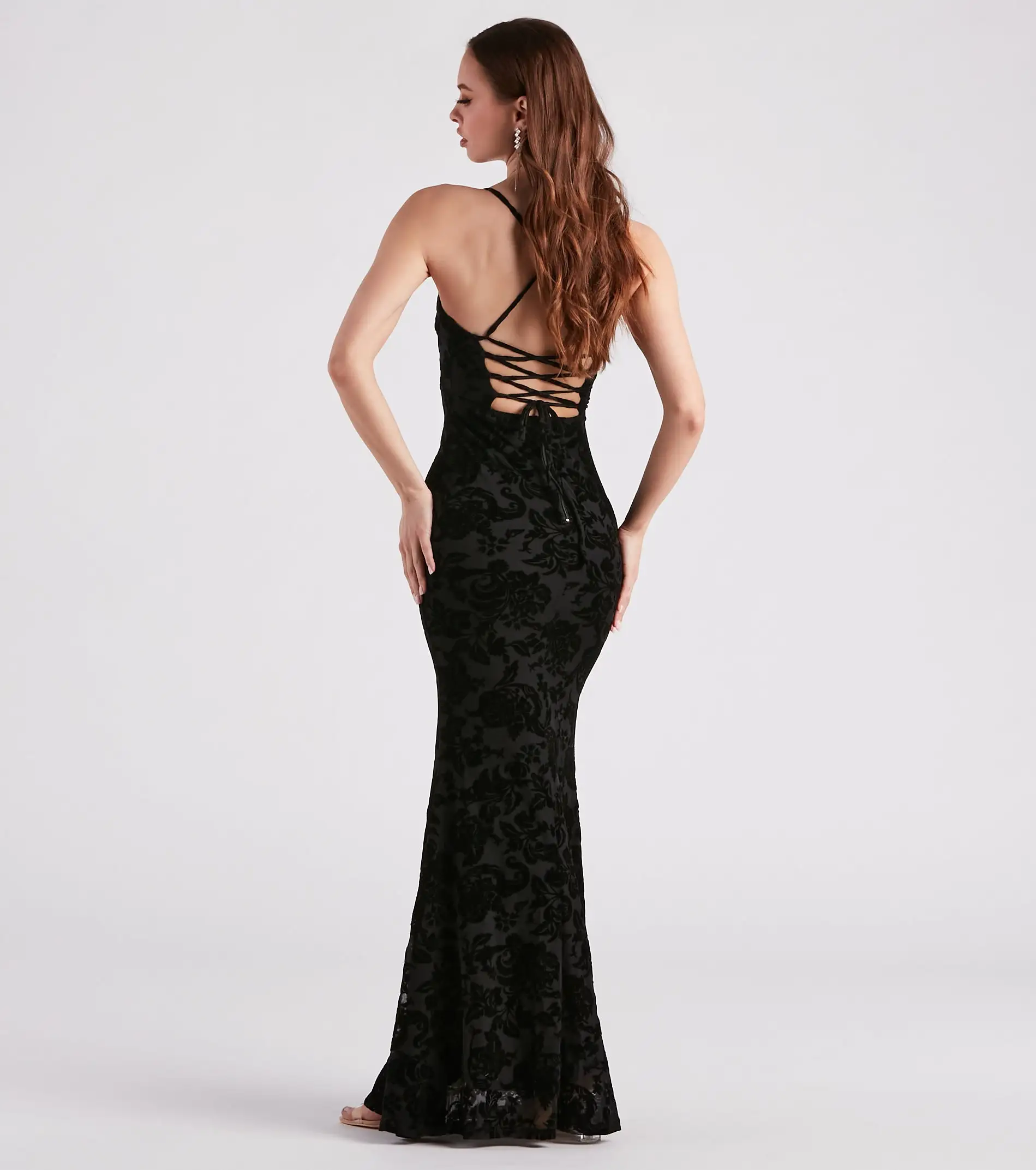 In the Eloise formal dress, there are two things to toast for, the newlyweds and how amazing you’ll look! She features a sleeveless V-neckline, spaghetti straps, an eye-catching lace-up back design, and a form-hugging mermaid silhouette that leads to her floor-length hem. The formal dress is composed of a flocked velvet patterned mesh fabric with a stretchy knit lining. Style with dainty