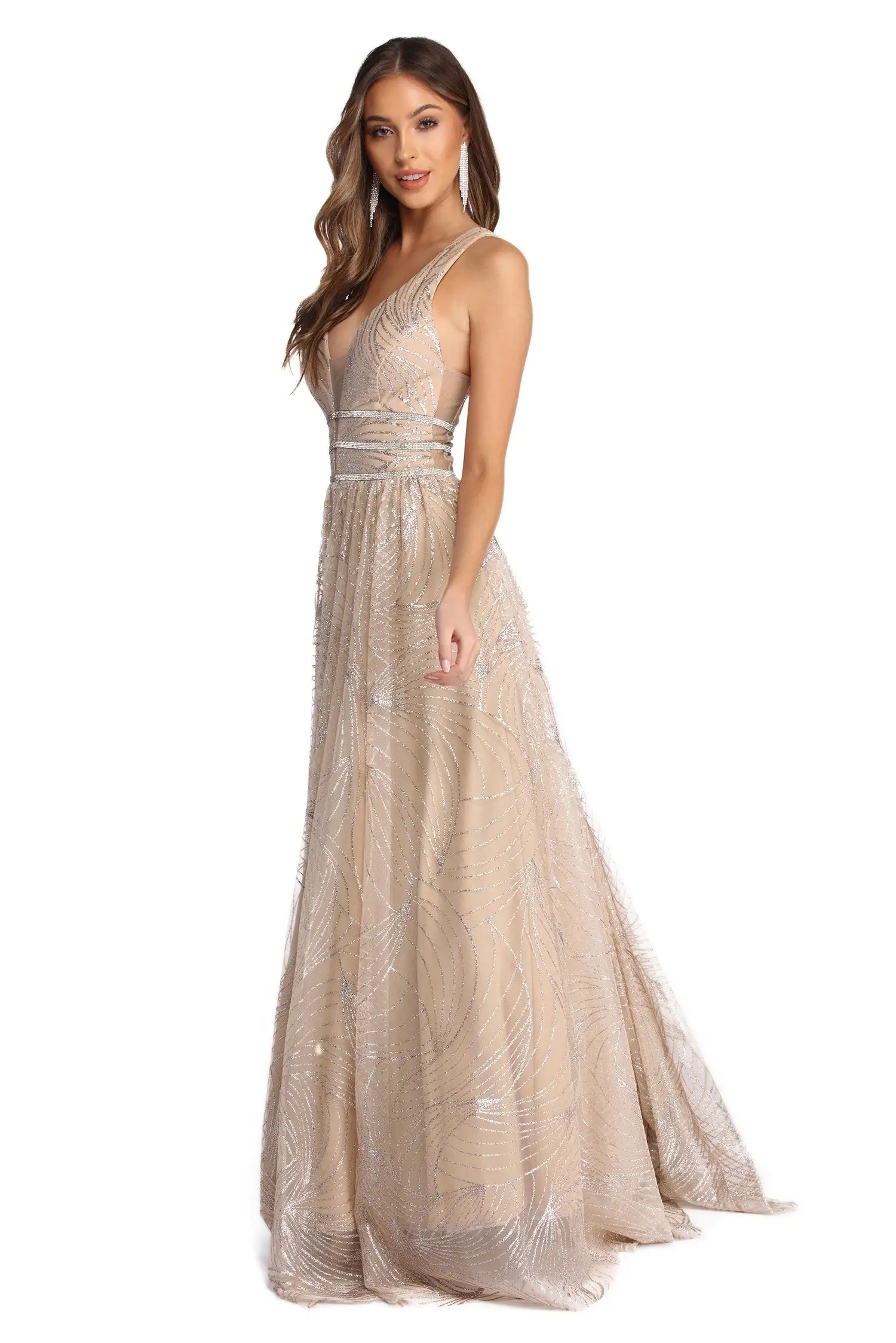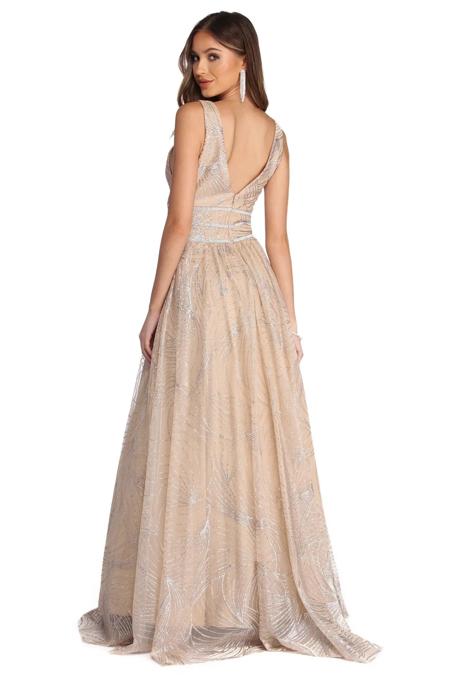 Glow from within as you dazzle in our fairy-tale worthy Emma light gold dress! She features a deep V neckline with an unlined mesh inset, padded cups, unlined mesh side panels and tank-like straps. Her waist is adorned with a triple row rhinestone belt accent to bring the shine and leads to a floor length silhouette. She is composed of a lined mesh fabric that is adorned with a gorgeous geometric glitter detail that makes Emma a true one of a kind! Dress offers a form hugging fit with minimal stretch. Includes a hidden back zipper closure and petticoat.
