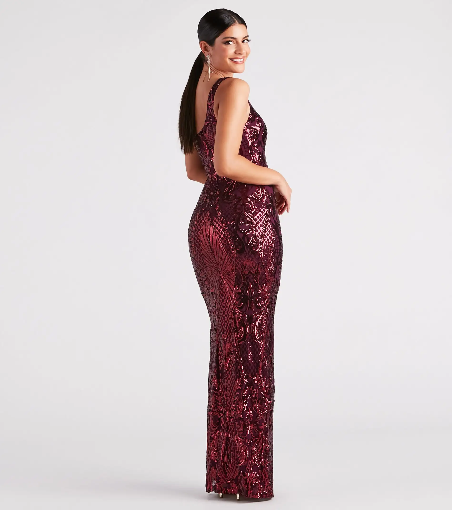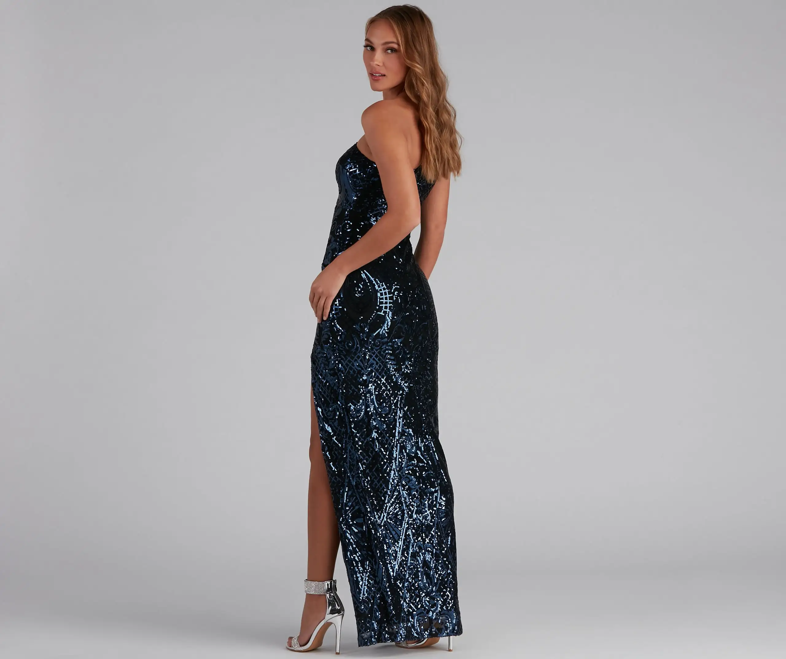 Walk into the room in a formal dress that brings the glamour to your special event. Eris features a sequin scroll pattern, a one-shoulder neckline with a supportive tank shoulder strap, padded cups that provide additional support, and a slim-fit waist. The waist leads to a floor-length form-hugging silhouette that is accented with a high side slit. The dress is composed of a lined mesh fabric that offers minimal stretch. Complete the look with rhinestone heels and a