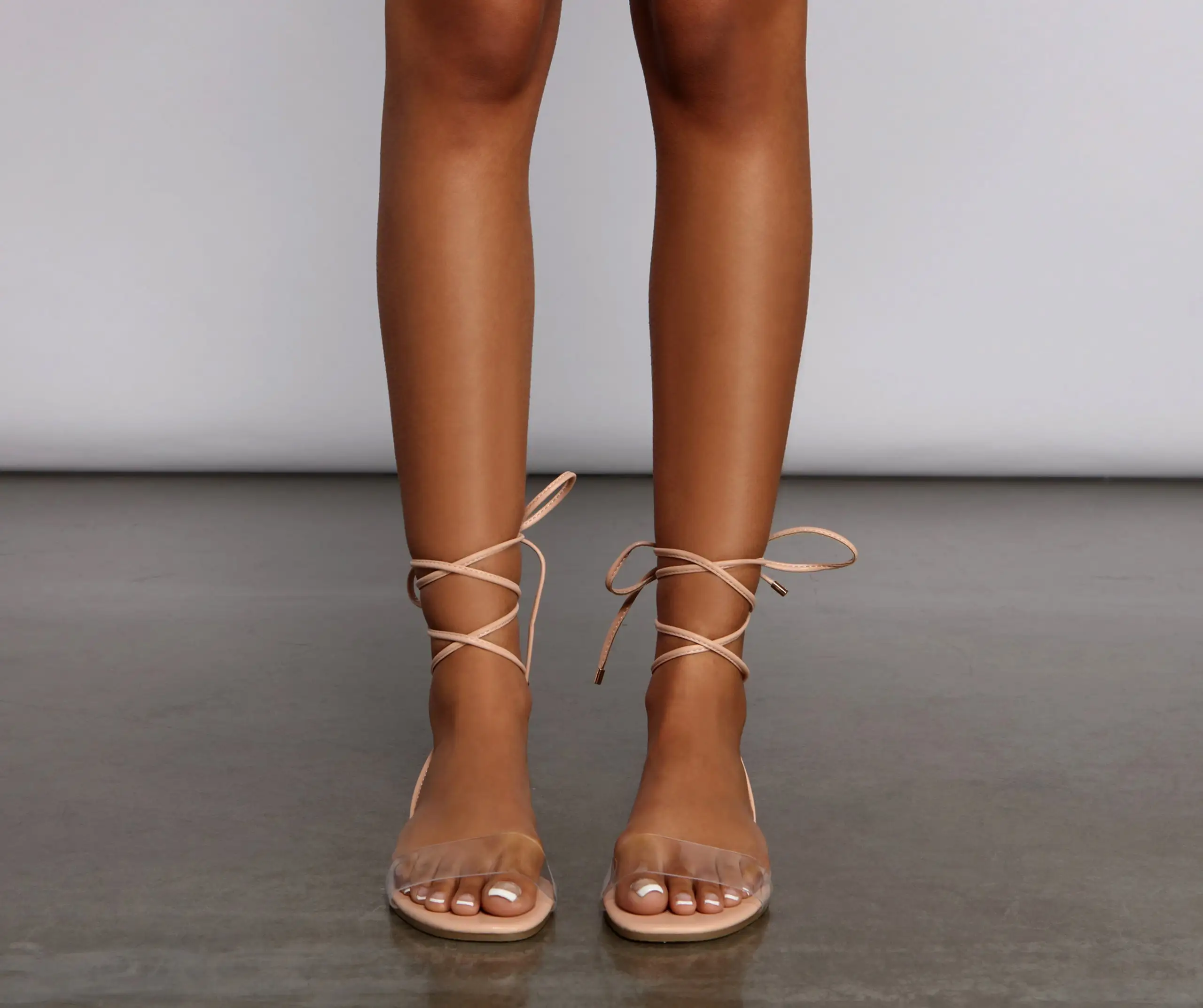 Lace-up in these sleek sandals that bring the style! The sandals feature a lace-up design, an almond toe, a clear PVC strap over the toe. Complete look with a