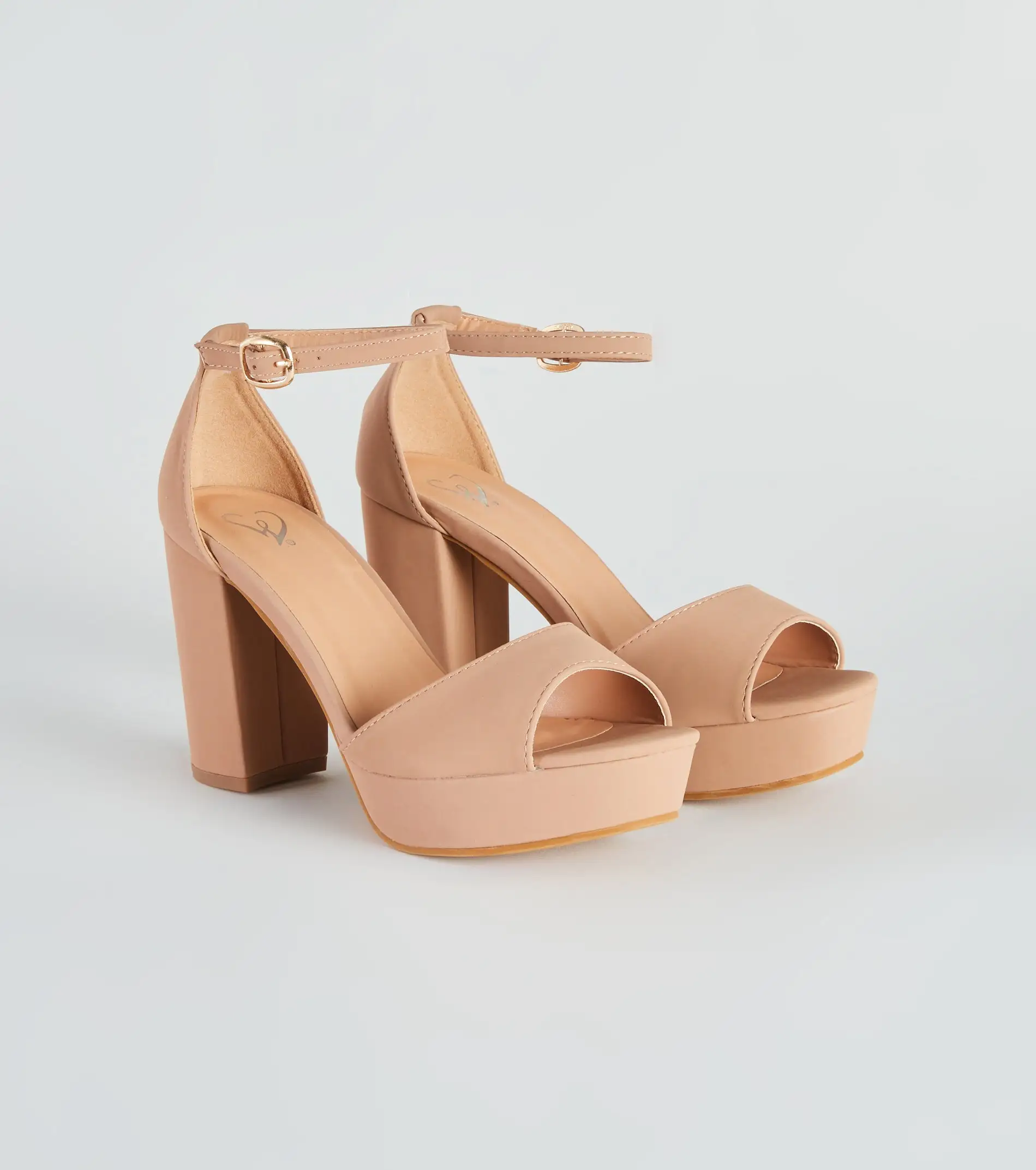 Complete your look with heels that elevate your outfit! The heels feature a closed-back, adjustable ankle strap, a peep toe with a wide strap over the toe, a wide platform, and a block heel. The heels are composed of a faux nubuck material. Complete look with a