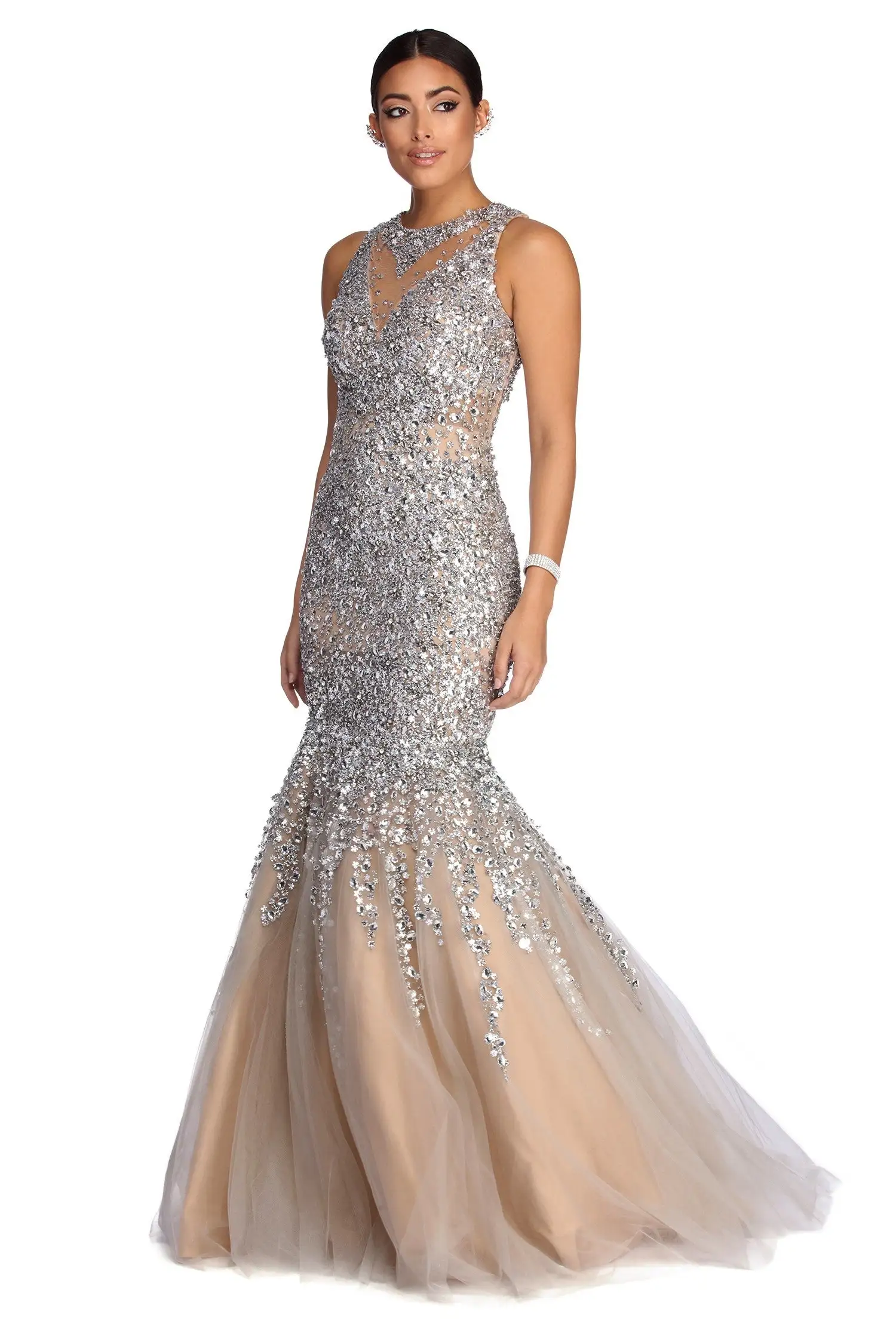 Radiate like the Queen you are in our breath taking Everleigh silver dress! She glows with her partially lined high round neckline adorned with a gemstone trim, padded cups and a sheer back panel that leads to a small lower back keyhole. Her slim fit bodice leads to a twirl-worthy mermaid silhouette complemented with godets. Her all over gemstones shine like a diamond are complemented with mini floral shaped sequins. Dress is composed of a lined mesh fabric that offers a form hugging fit with minimal stretch. Includes a hidden side zipper closure.