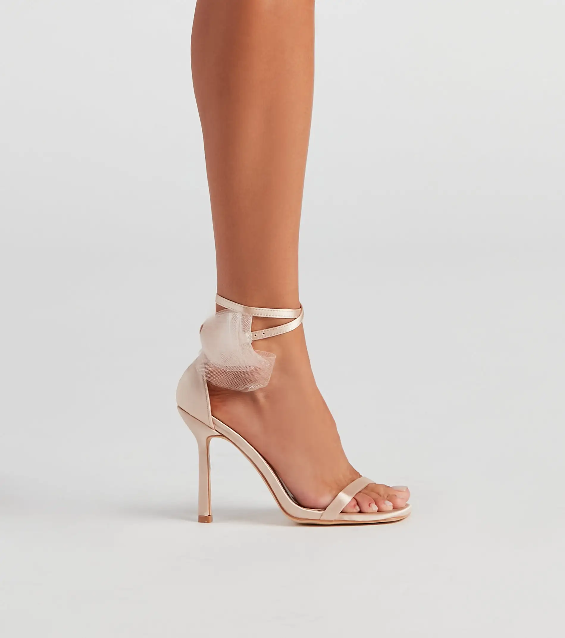 Bring the glam girl vibes to your chic outfit with these satin stiletto heels! They feature an open square-shaped toe with a thin strap, a thin adjustable ankle strap, a sheer organza bow accent, and a sleek stiletto heel. Style with