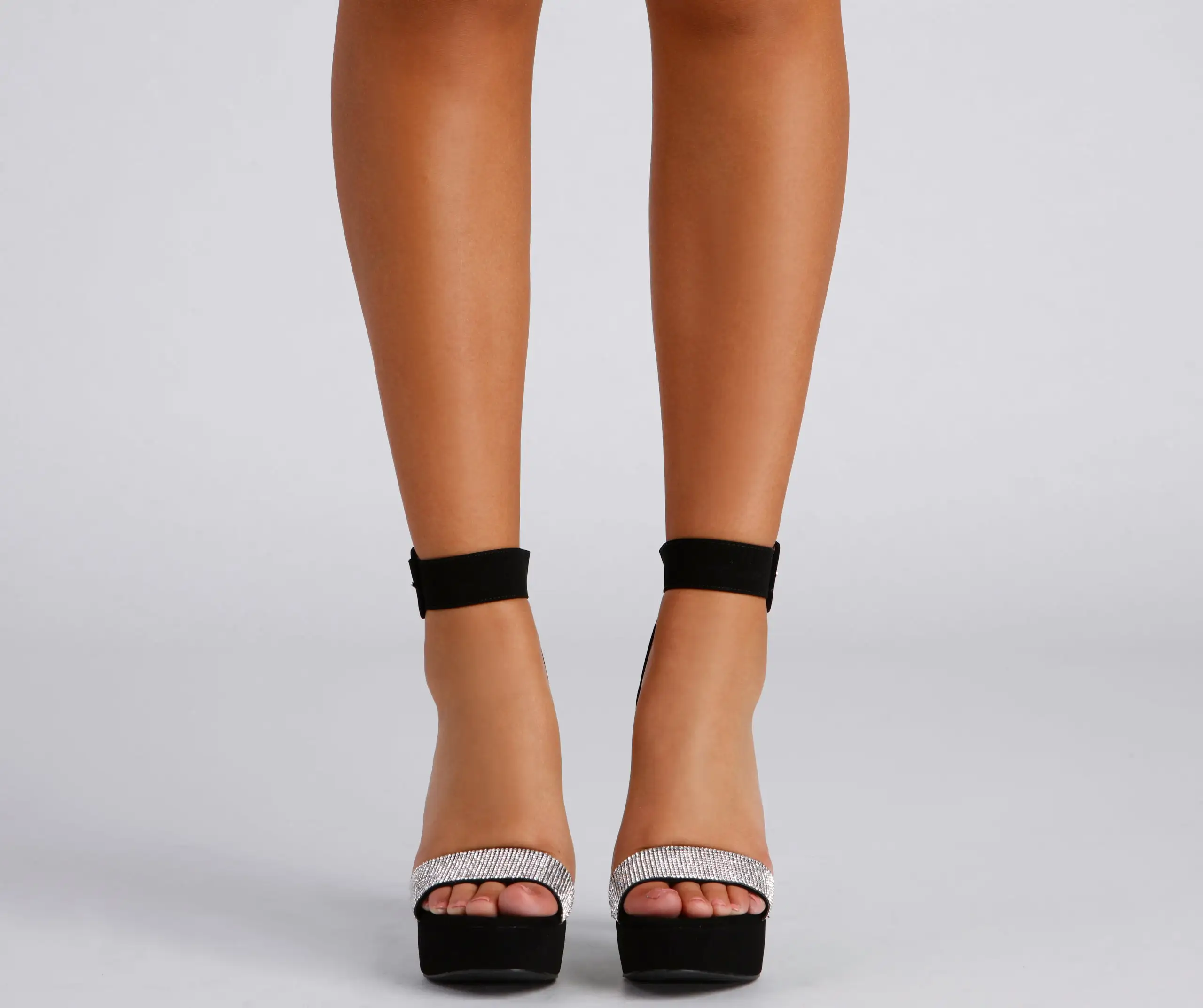 Elevate your glam night-out look in these nubuck stiletto heels! They feature an almond toe, rhinestone toe strap, and a buckle ankle on a platform sole. Complete your look with sparkly