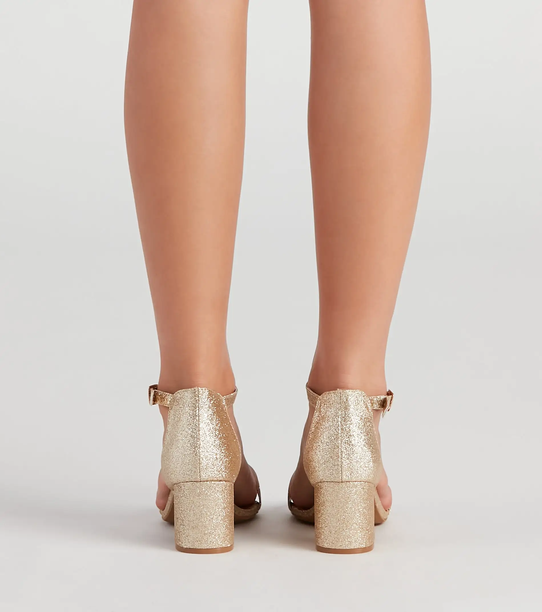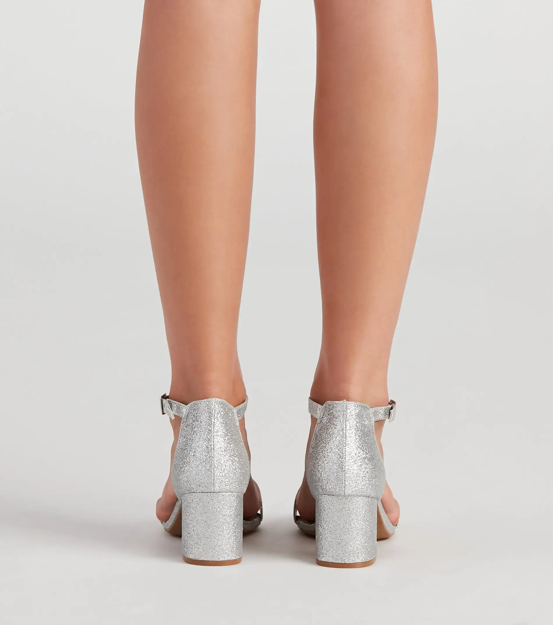 Make glam moves in these sparkly glitter mesh heels! They feature an open almond-shaped toe with a strap, an adjustable ankle strap, and a short block heel comfortable for dancing in. Style with a