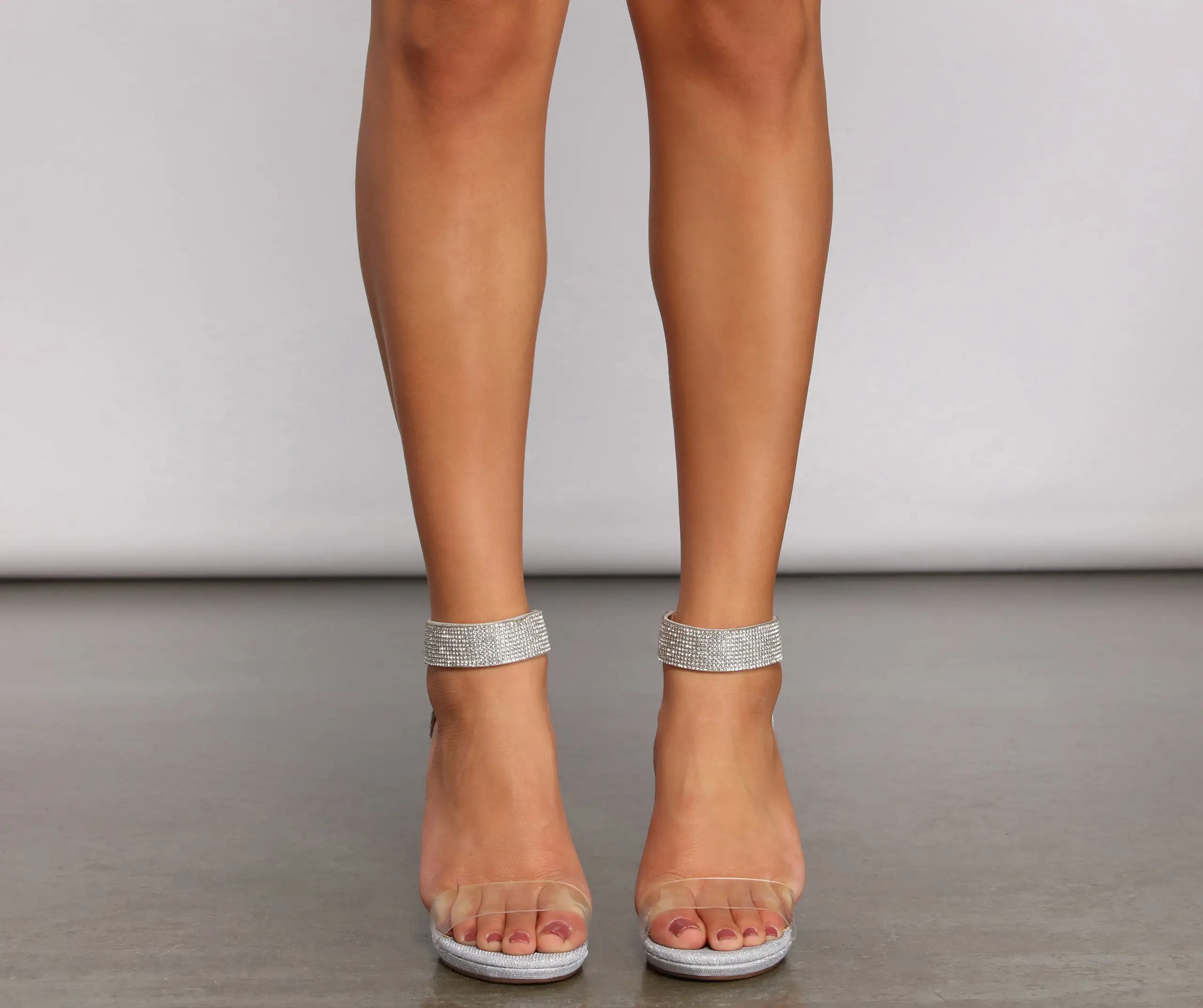 Glow on with heels that bring the shine! The heels feature a zippered back, a rhinestone embellished ankle strap, an open almond toe with clear PVC strap over the toe, and a glitter mesh heel. The heels are composed of a glitter mesh material. Complete look with a