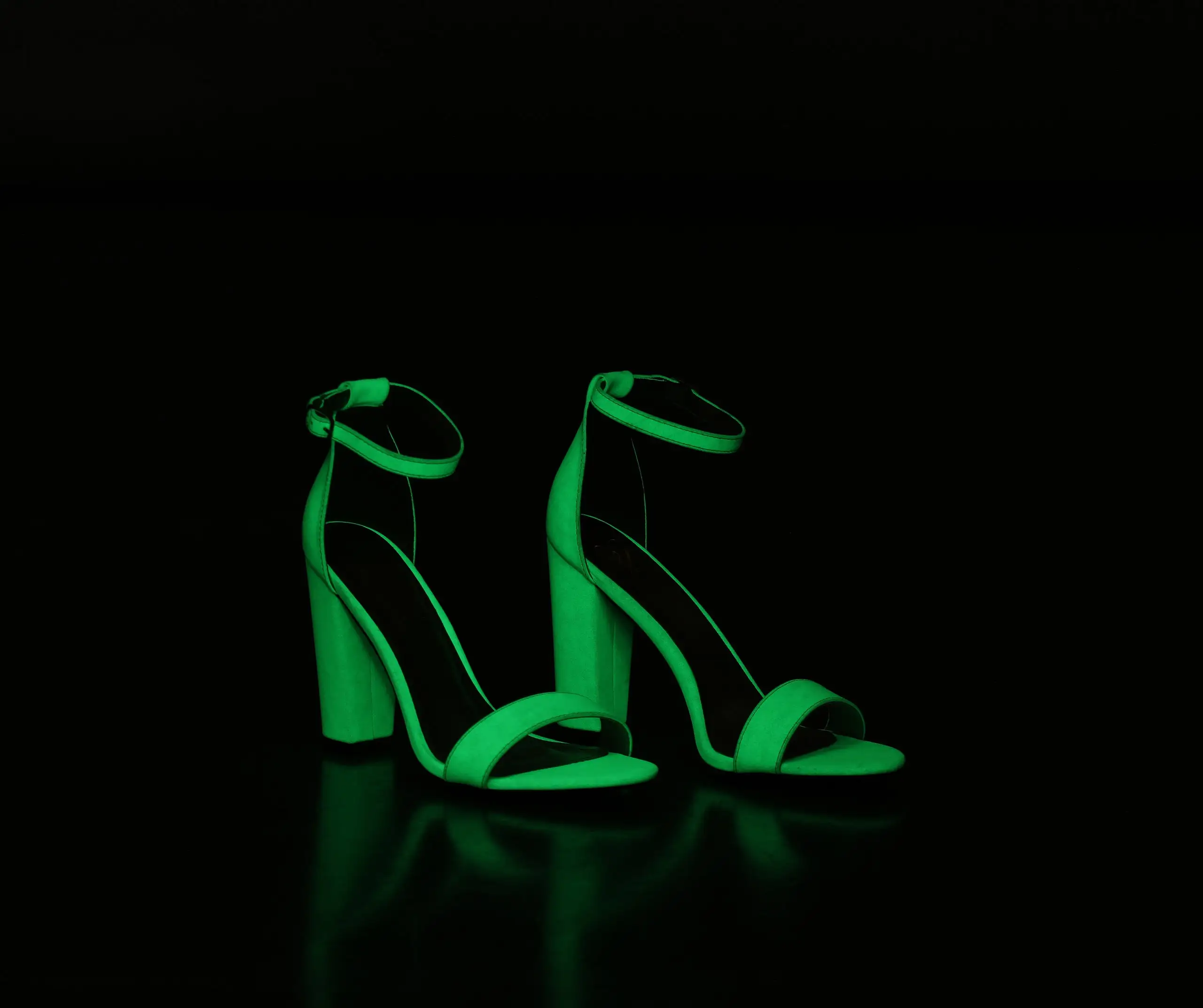 It’s glow time baby girl! Take your look from day to night in these glow-in-the-dark stunners. Featuring an open toe, an adjustable ankle strap and a band at the toe. The heels have a medium height heel and are composed of a faux leather material. Match these heels with your favorite spooky Halloween costumes this season!