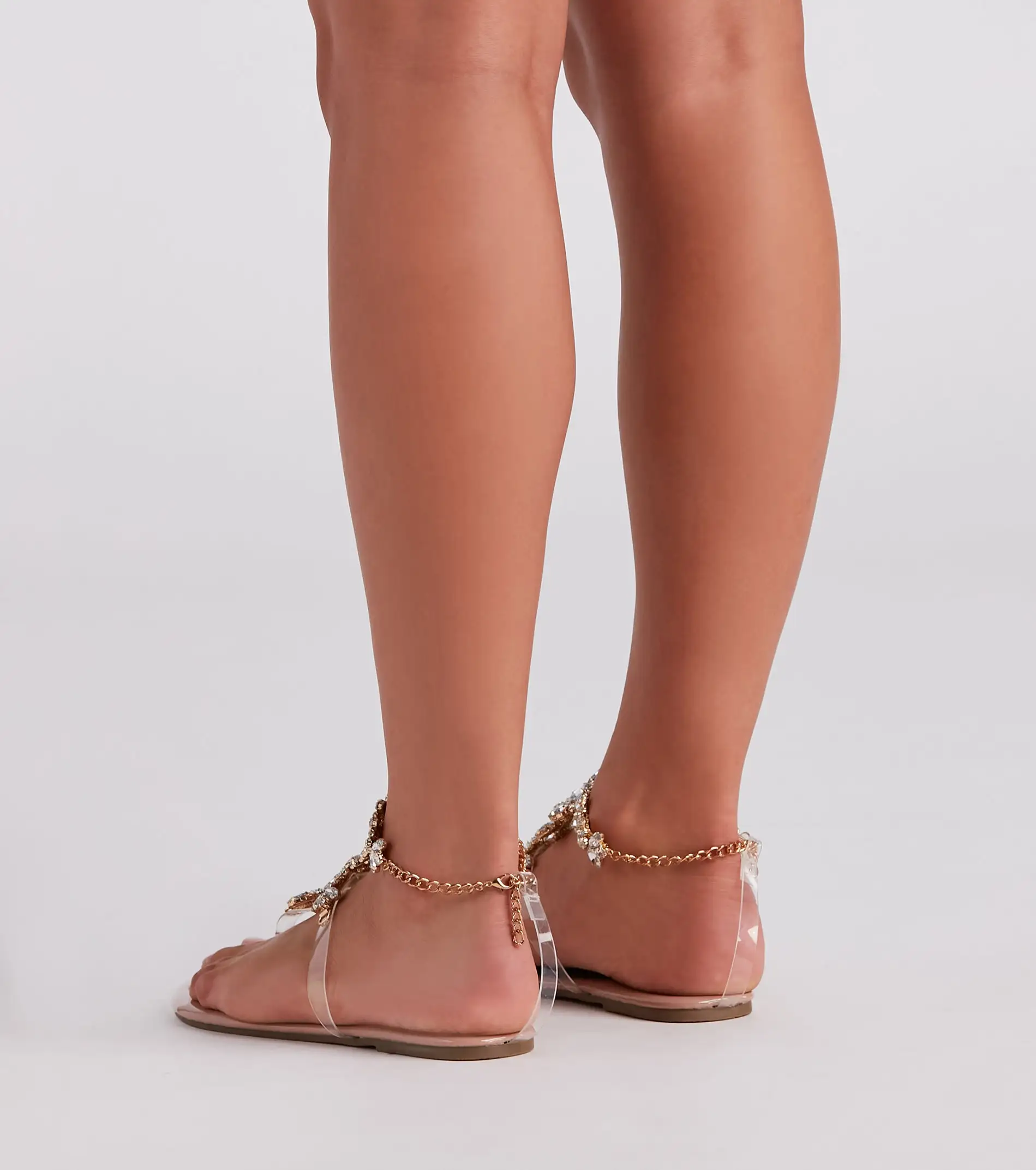 Unlock a Grecian mystique allure in these flat patent sandals for your next getaway! They feature an almond toe, PVC clear caged straps with statement rhinestone jewels, and an adjustable ankle chain with lobster clasp closure. Complete the look in a chic