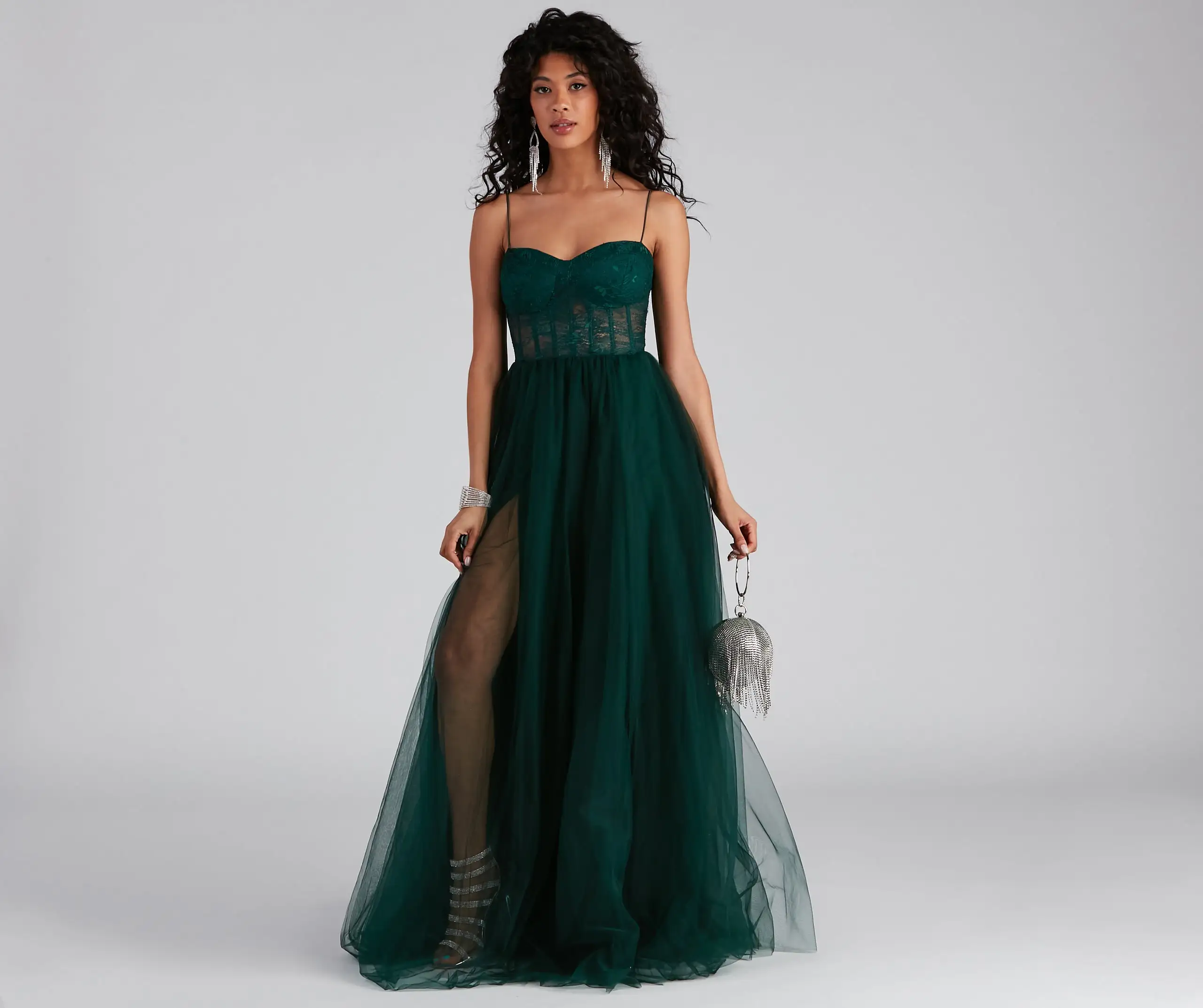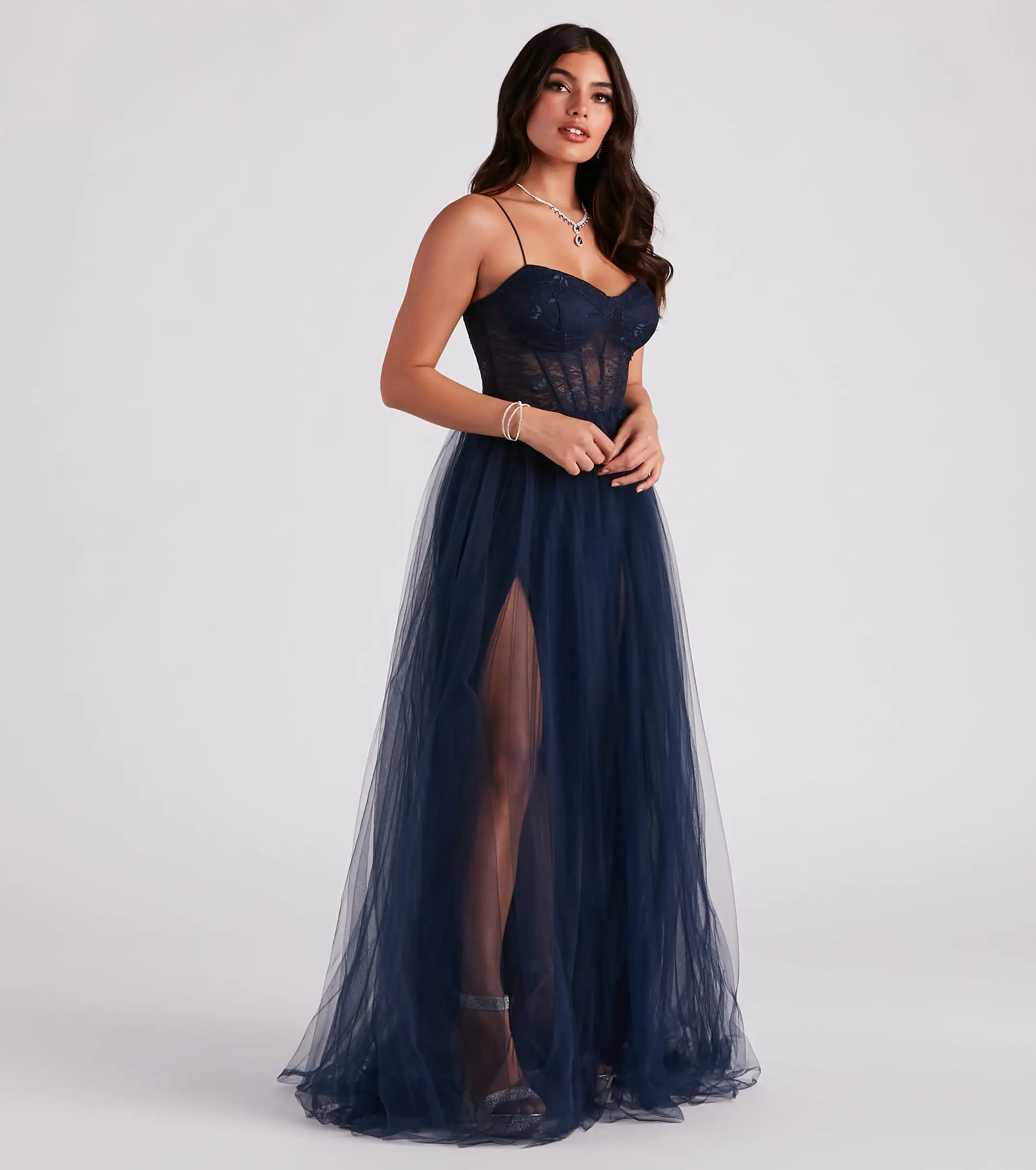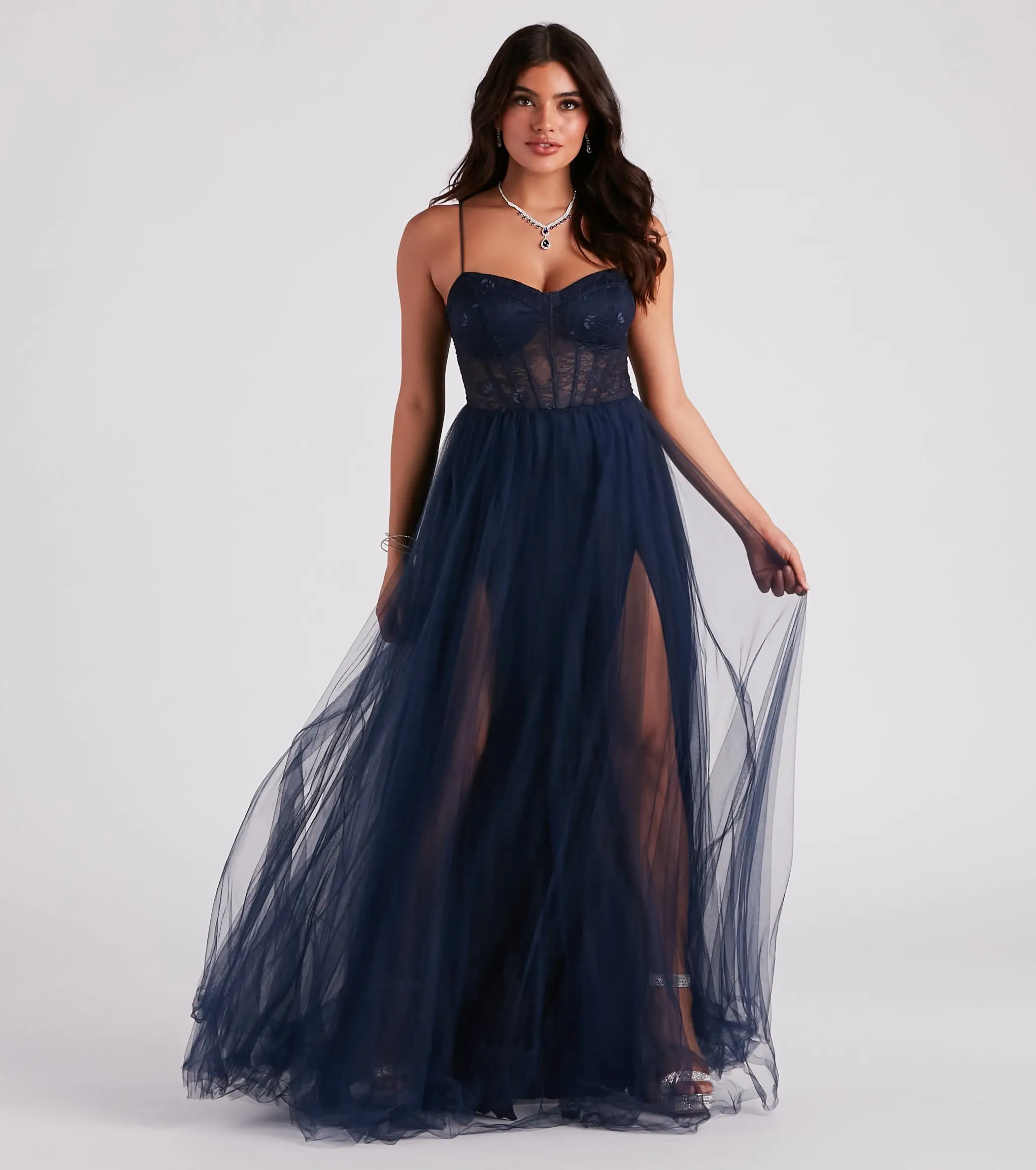 , molded padded cups that eliminate the need for a bra, and sleek bungee straps. Her bodice features a gorgeous lace design, contrast piping, and flexible boning that offers support. Her slim-fit bodice leads to a flowy floor-length A-line skirt composed of tulle. Her knit lining features a daringly high side slit to create a chic sheer contrast. Complete your prom outfit with rhinestone heels and clutch.Â