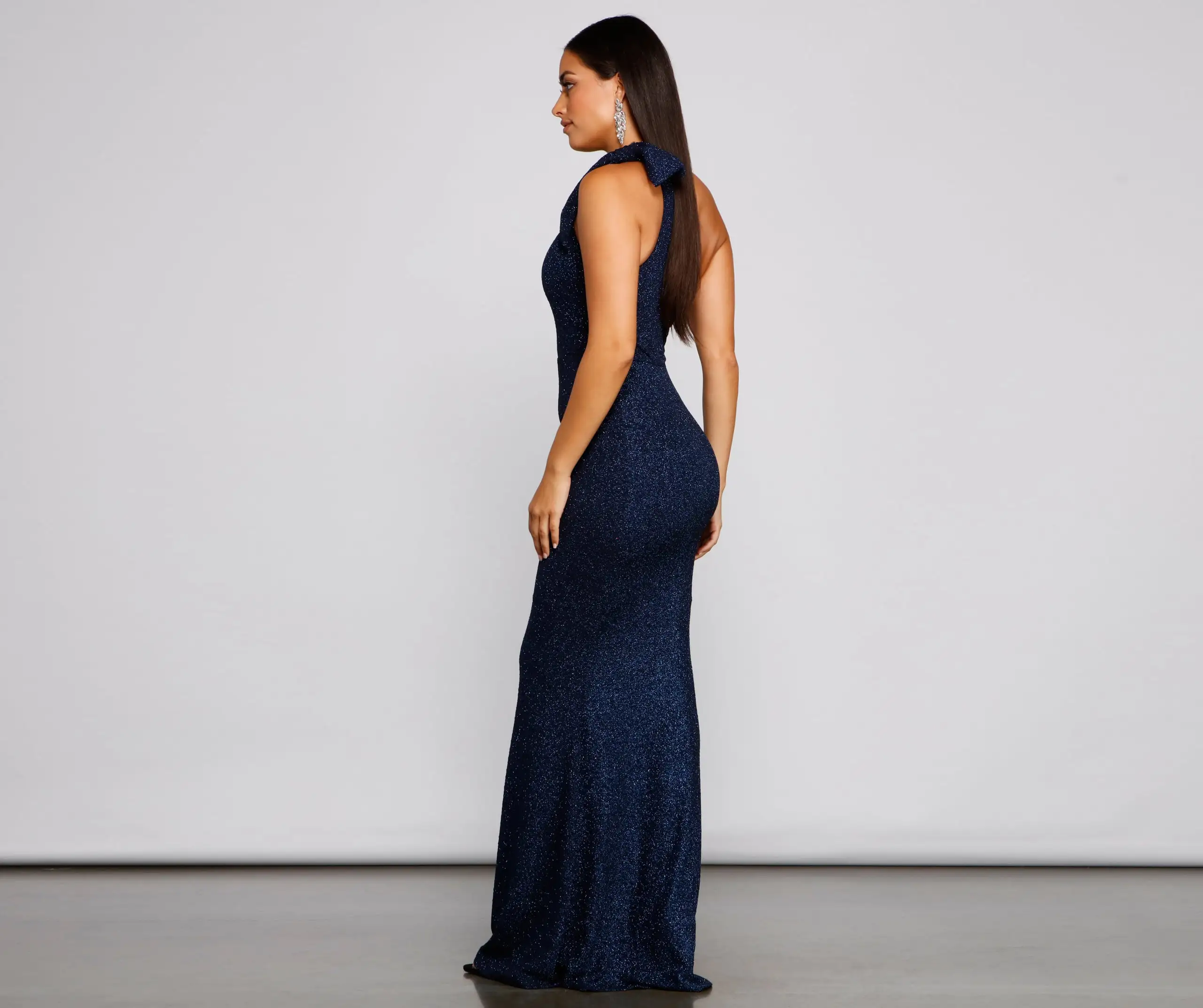 Make a glitzy impression in a formal dress that illuminates your evening! Henley features a one-shoulder neckline with a bow accent strap for added detail and a mermaid curve-defining silhouette. The dress is composed of a glitter knit fabric that offers a moderate stretch. Complete look with a