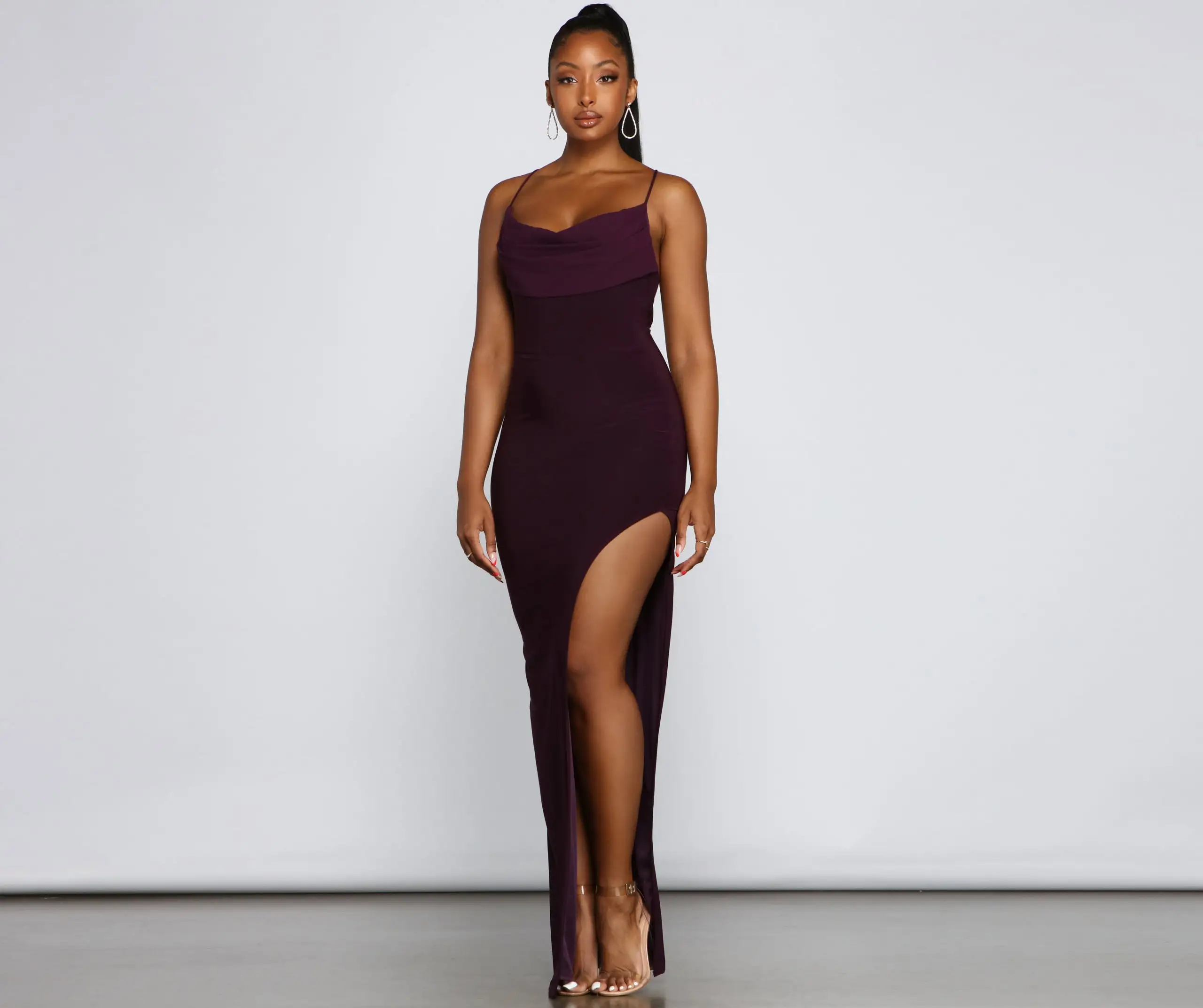 Make your mark with a captivating formal dress that brings the sophistication! Inez features a sleeveless cowl neckline, adjustable spaghetti straps that cross at the back, a ruched side seam, and a high side slit. The dress is composed of a smooth knit fabric that offers a form hugging fit with a moderate stretch. Complete look with