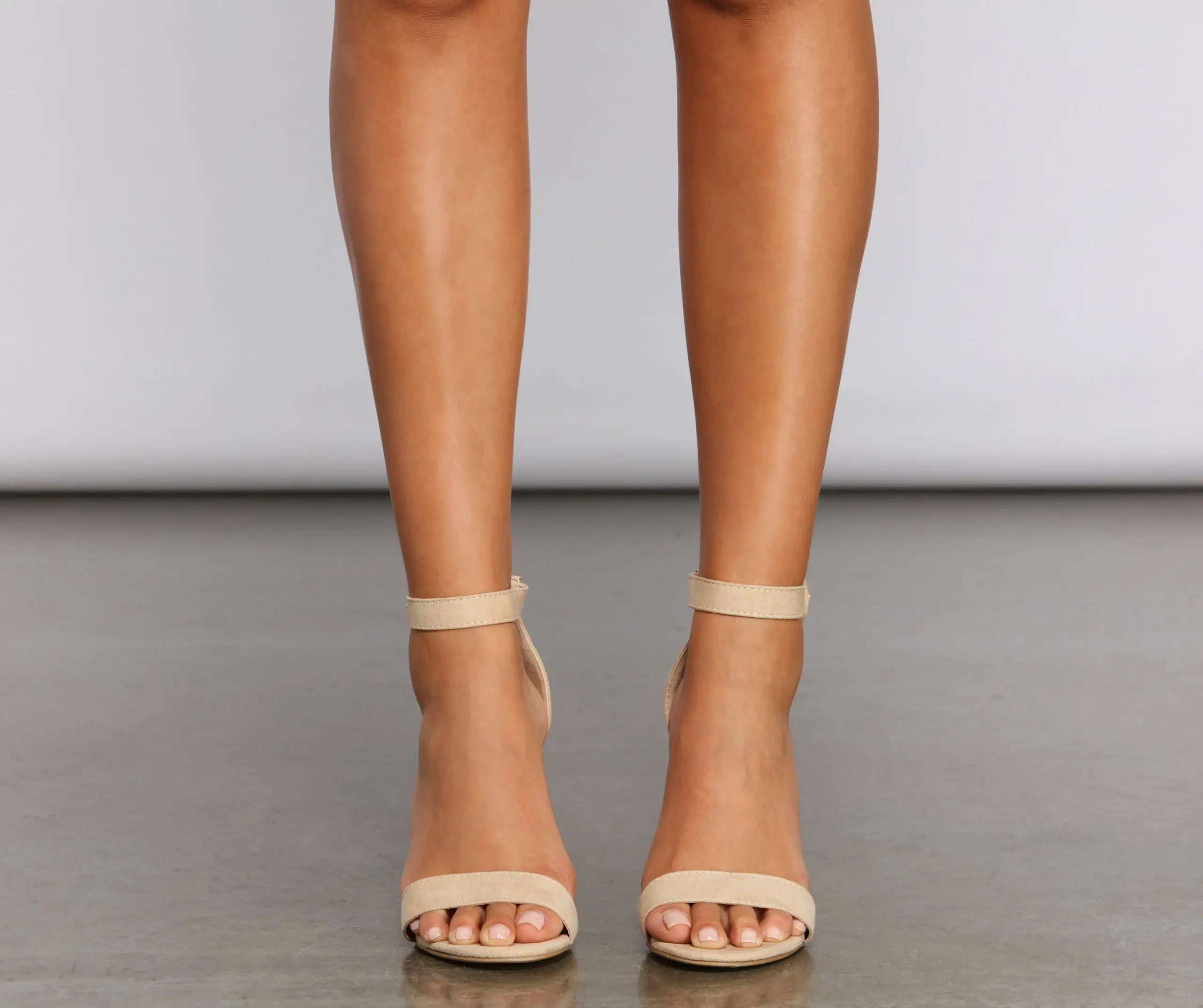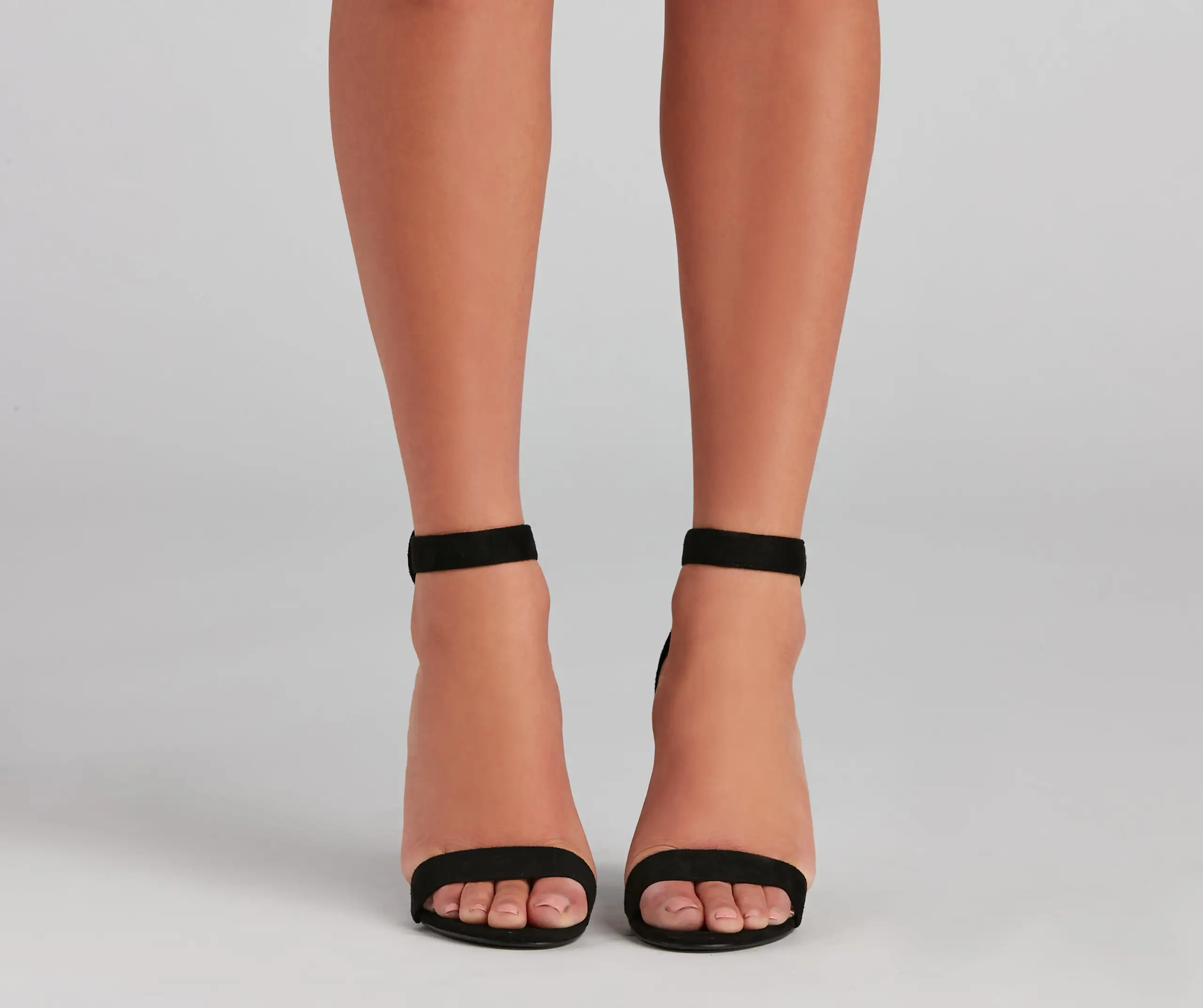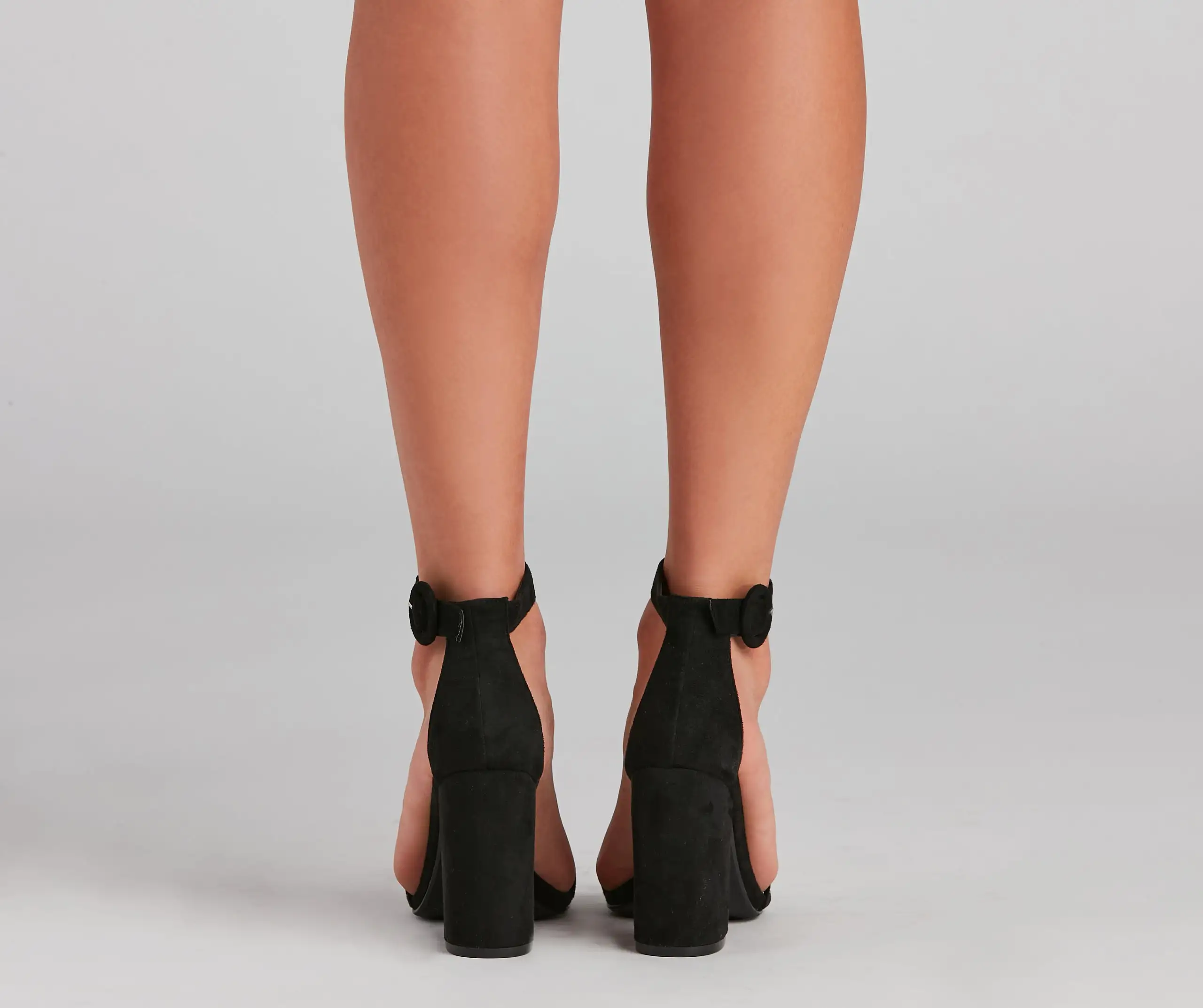 ! The heels feature an adjustable ankle strap with a circular buckle, an open almond toe with a strap over the toe, and a block heel.Â