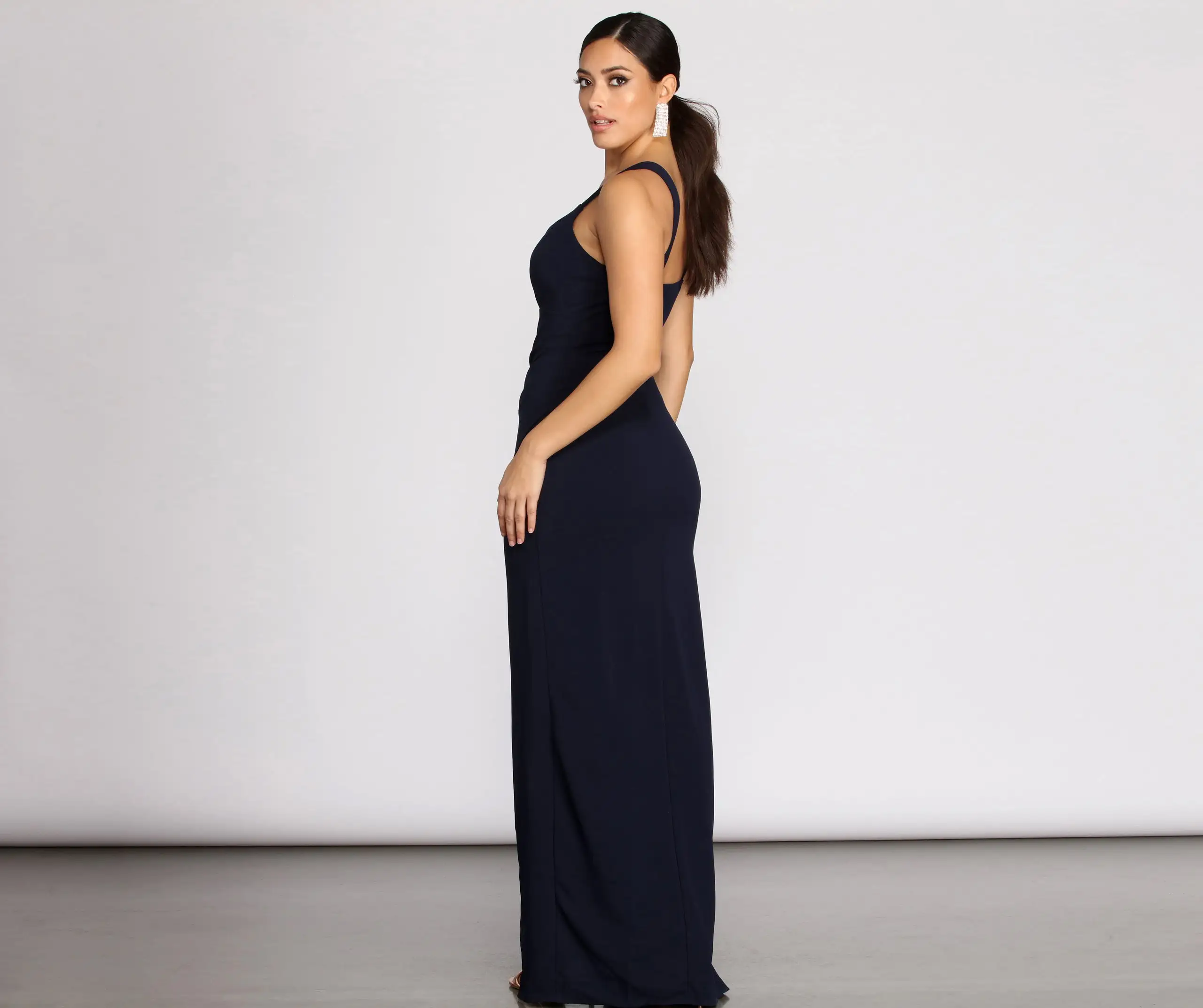 Our wrap front formal Jane dress is simple yet oh so stunning! Her front slit gives the dress a sultry feel.