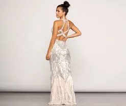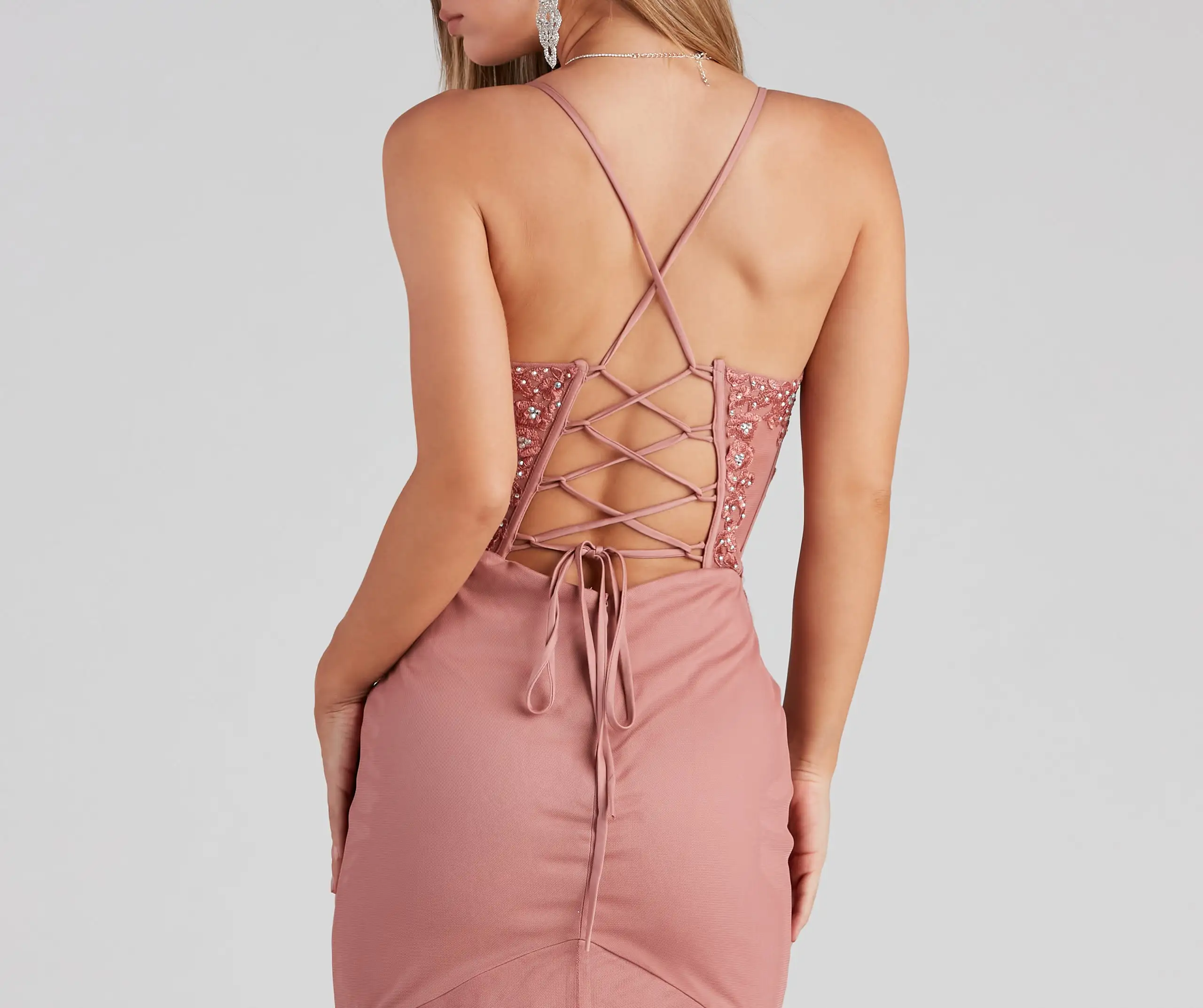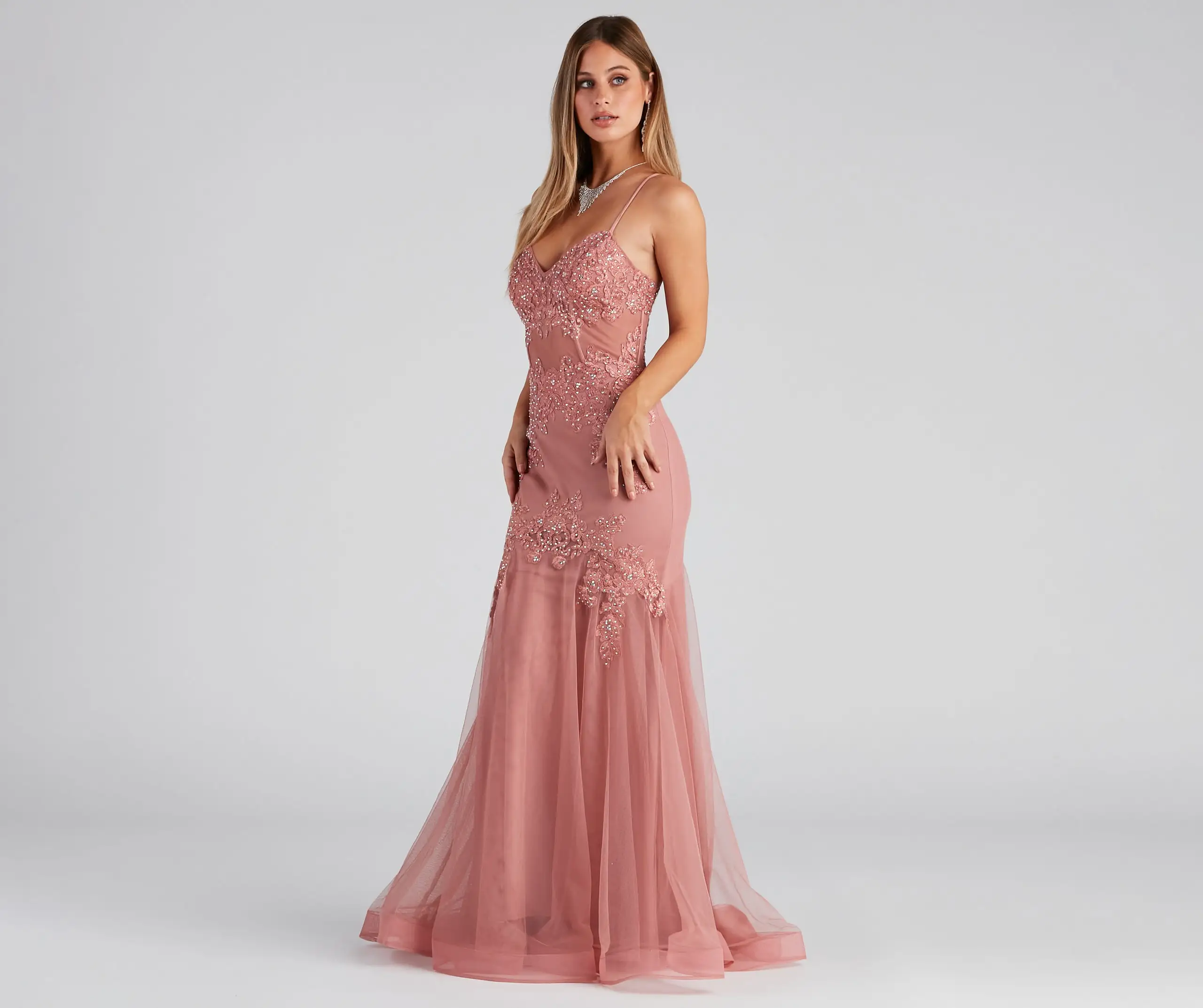 Waltz into prom glowing! Jenika is picture-perfect and ready for her close-up in extravagant embroidery and rhinestone detail to shine under the dance floor lights. She features a sleeveless, v-neck, spaghetti straps, a built-in padded bust, and a corset-style mesh bodice with flexible boning inserts for a structured fit. Showcase some back in her open design with a lace-up closure and zipper. Her form-fitting silhouette leads to a flared hem designed to flatter your figure. Composed of multi-layers of tulle with an inner lining. Finish the look in a rhinestone