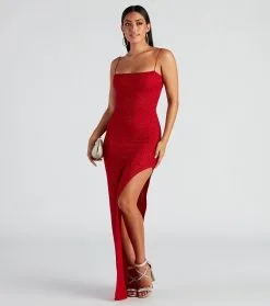 Glitter amplifies the sparkling radiance of the Jenna formal dress for your next fancy night out! She features a sleeveless scoop neck with sleek bungee spaghetti straps, an open back with lattice detailing, a high-waist seam, and a curve-hugging, floor-length hem with a sexy high-cut slit. The formal dress is composed of a stretch-knit glitter fabric that hugs your body like an hourglass. Complete the look with a statement
