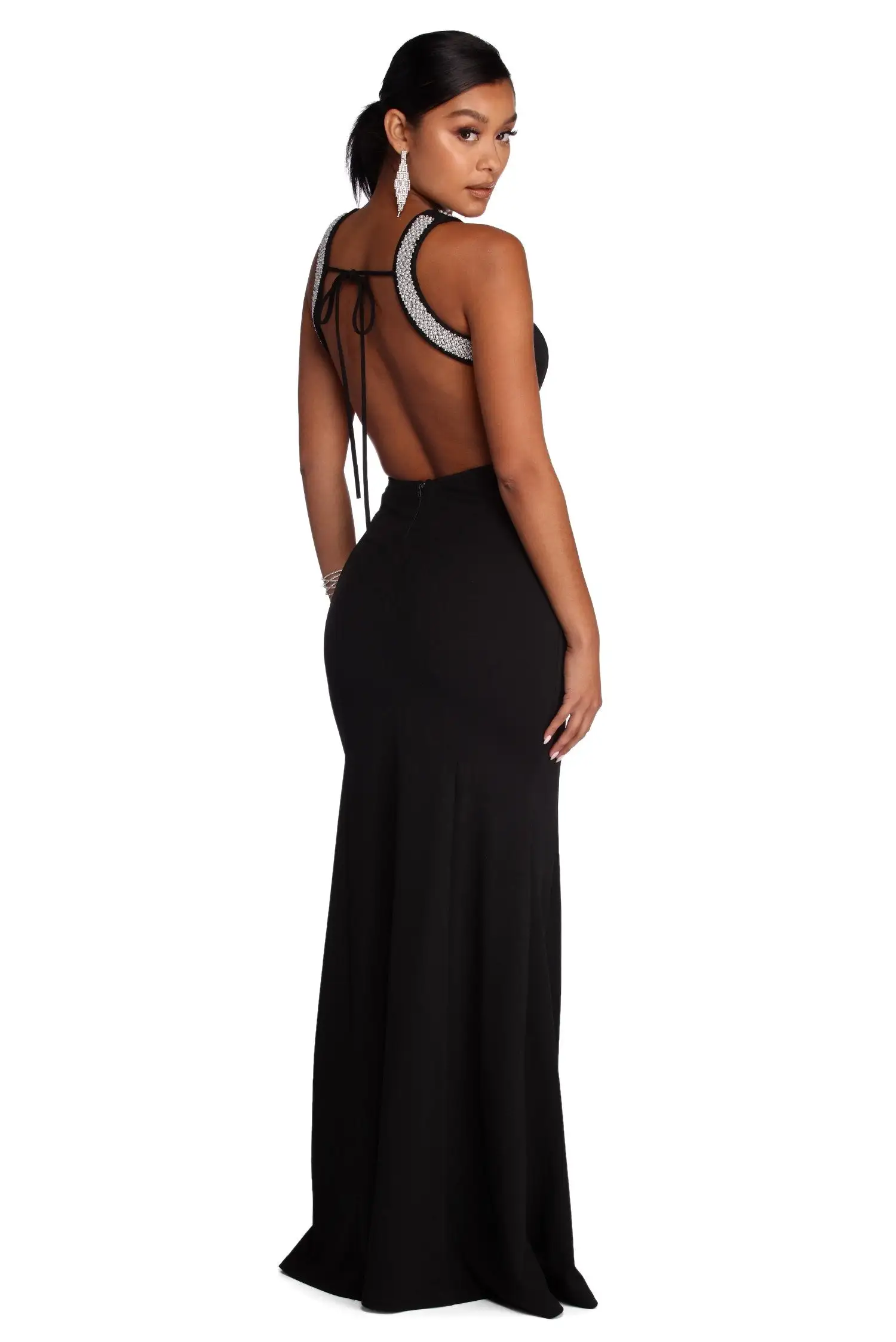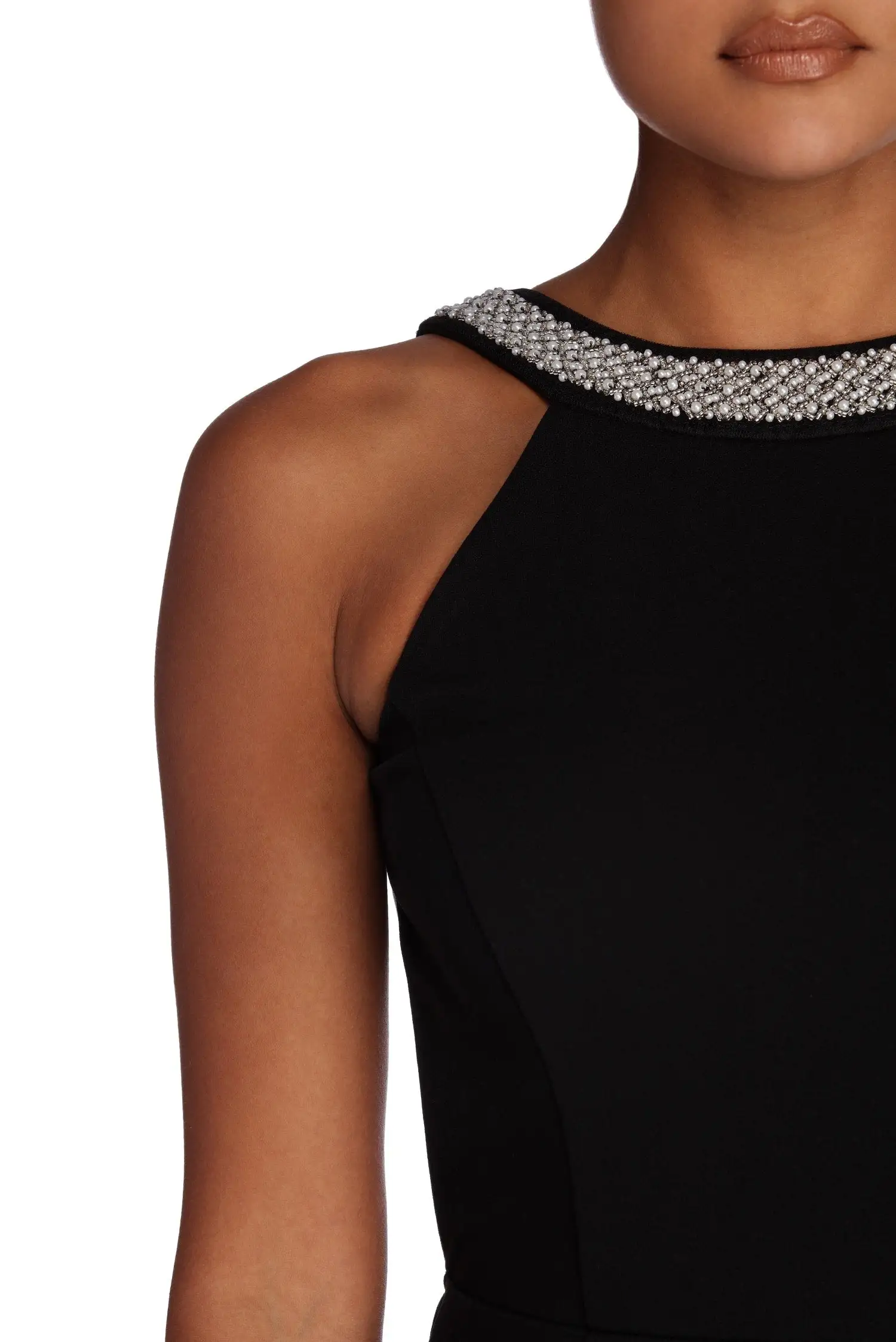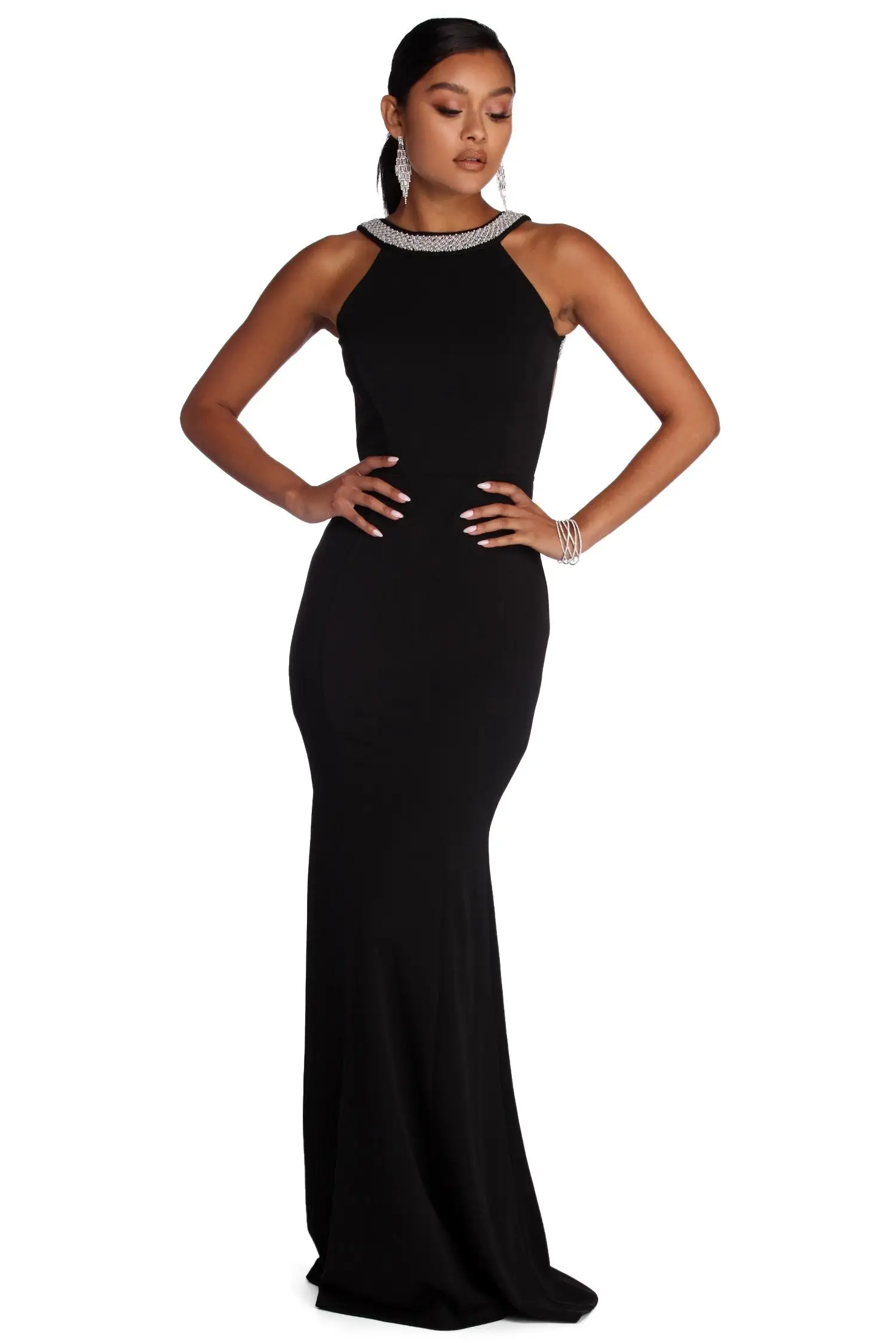 Go for the extra touch of luxe with pearls! Jocelyn features a chic black hue, a high round neckline with a pearl embellished trim, padded cups, princess seams and an open back with tie strap detail. Her slim fit bodice leads to a curve hugging floor length silhouette accented with vertical seams to create an hourglass-like effect. Dress is composed of stretchy crepe fabric.