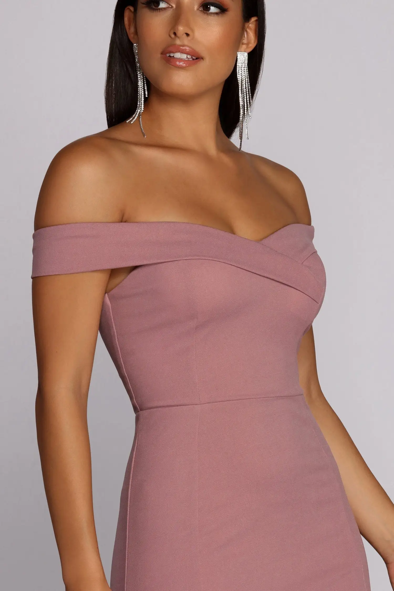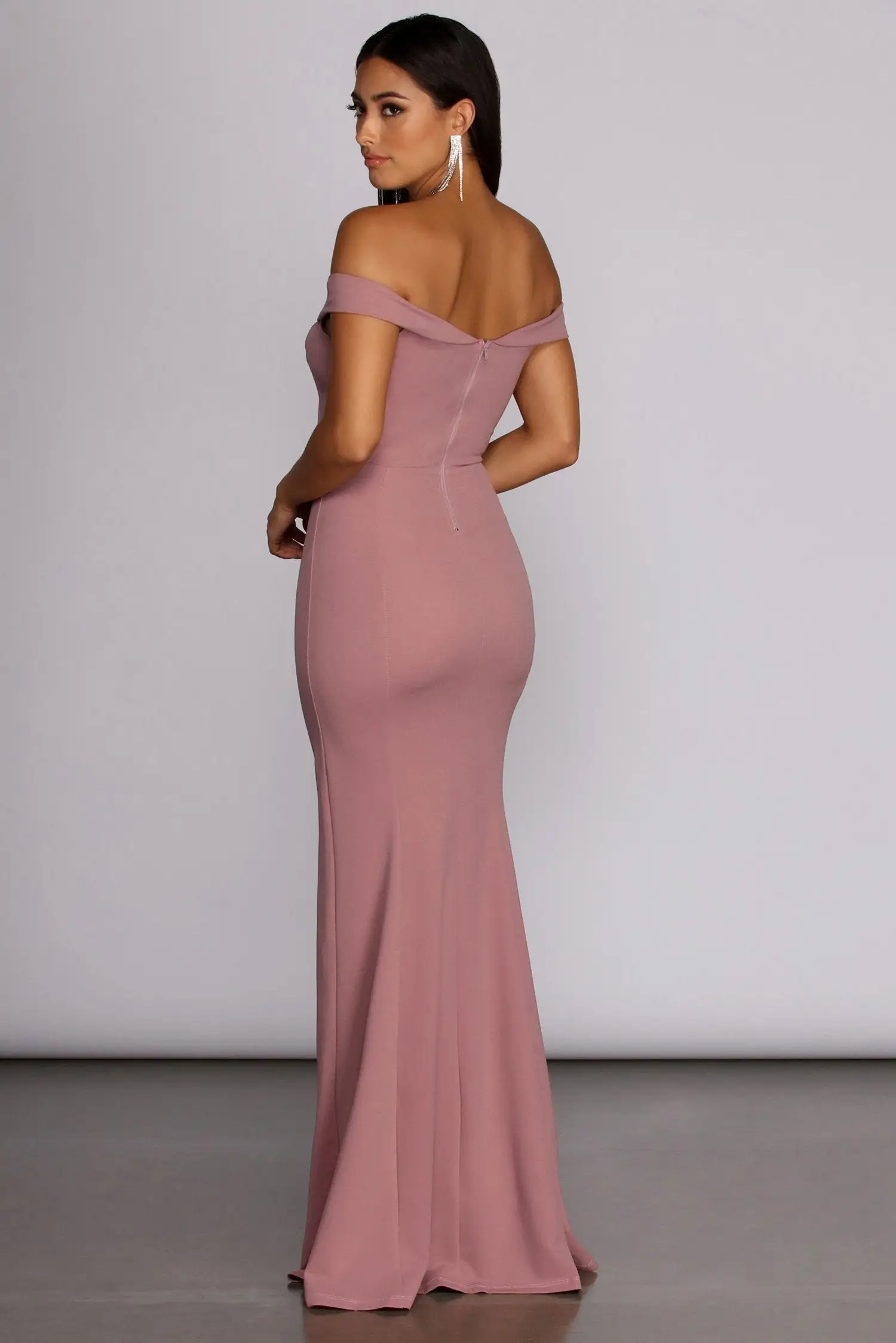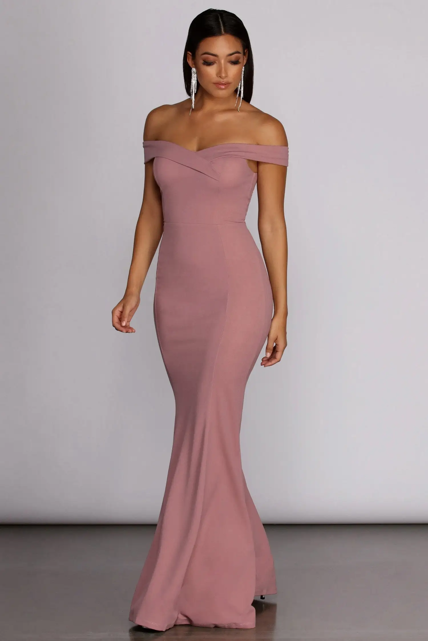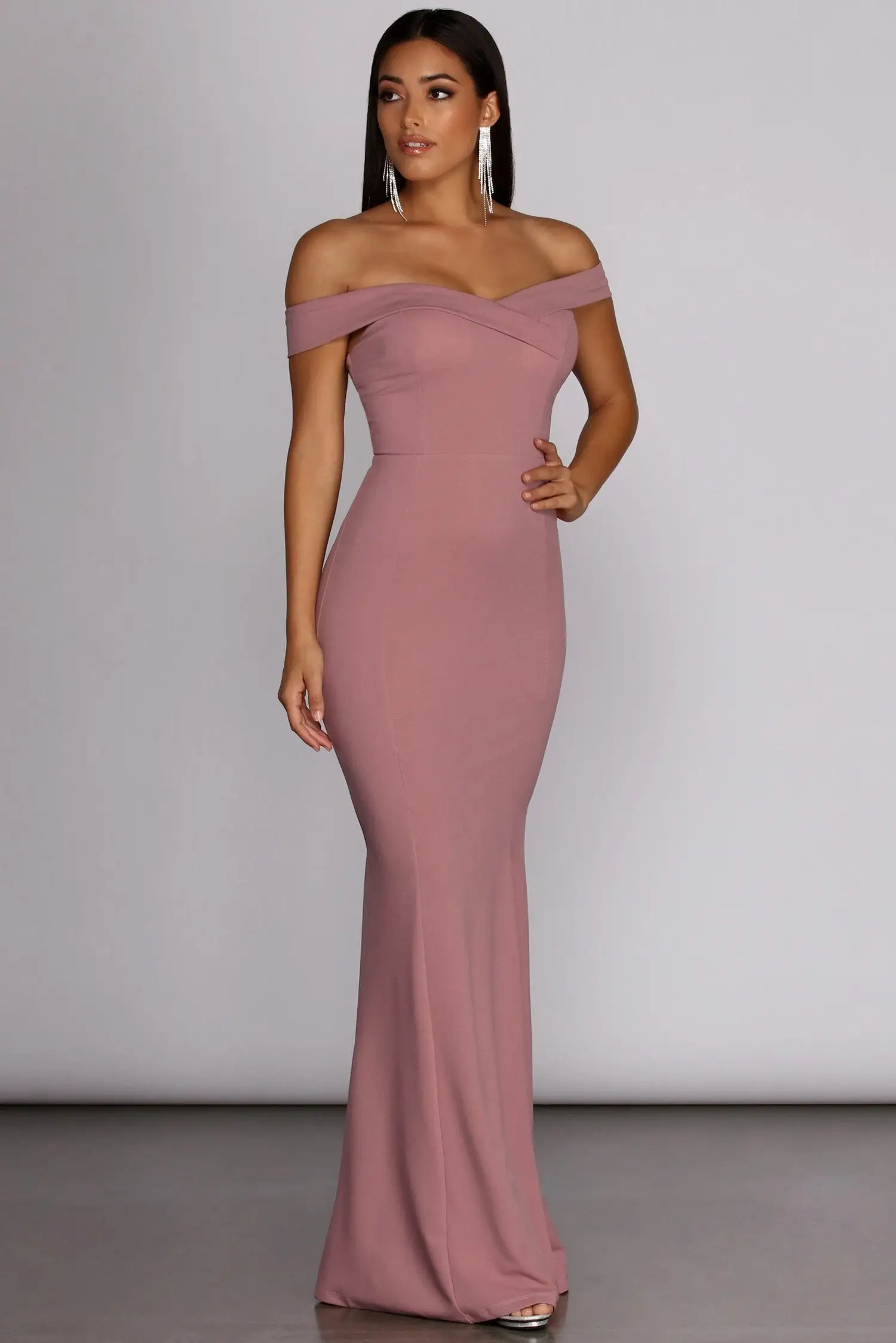 Draw them in with your stunning beauty in our gorgeous Kelly off the shoulder dress! She features an off the shoulder fold over neckline, a lined and padded bust, a high waist and seam detailing, an exposed back zipper closure, and an elongating floor length skirt. Dress is composed of a crepe fabric that offers moderate stretch and a flattering, form hugging fit.