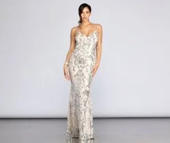 Introducing our beautiful and elegant Kennedy gown, She has a form fitting silhouette that is floor length. She has a v neckline, padded cups and adjustable spaghetti straps that lead to a low V back and zipper closure. She is fully lined and showcases a beautiful scroll sequin pattern. Her hem flows out in a mermaid style fashion. Just beautiful!