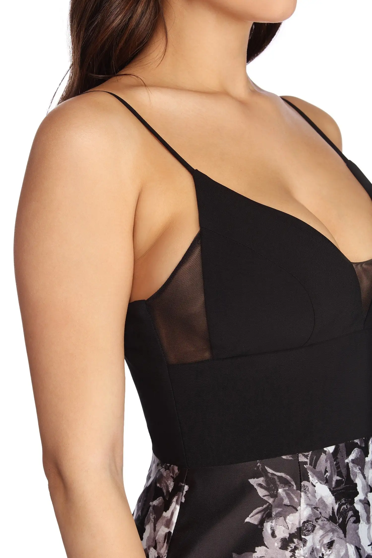 Bloom in gorgeous florals as you stun in our unique Kiki dress! She features a black hue, a sleeveless bodice, a plunging V neckline, padded cups, an unlined mesh inset, unlined side mesh panels and an empire waist accent. Her curve hugging mermaid silhouette features a gorgeous floral print with black and white hues. Dress is composed of a combination satin, mesh and smooth knit fabric that offers a minimal stretch. Includes a hidden back zipper closure.