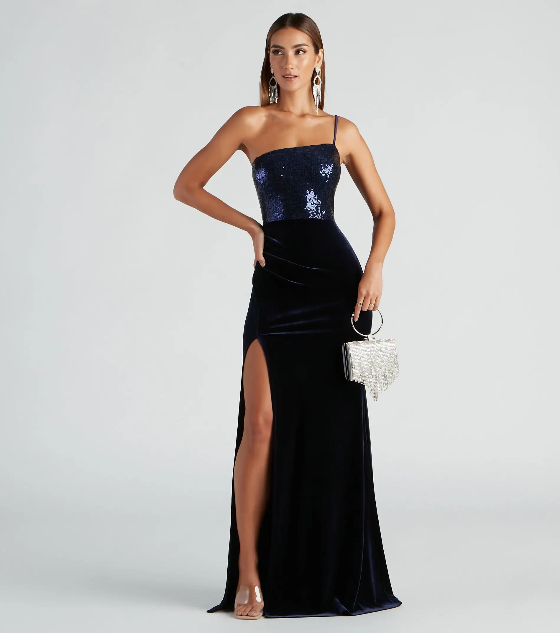 Showcase a luxe look with a stunning sparkle in the Kira sequin velvet mermaid dress. She features a sleeveless asymmetrical one-shoulder neckline, a single adjustable shoulder strap, and a fitted bodice with all-over sequin embroidery. Her high waist seam leads to a floor-length smooth velvet skirt with ruching at the top and a thigh-high side slit. Style this dress with