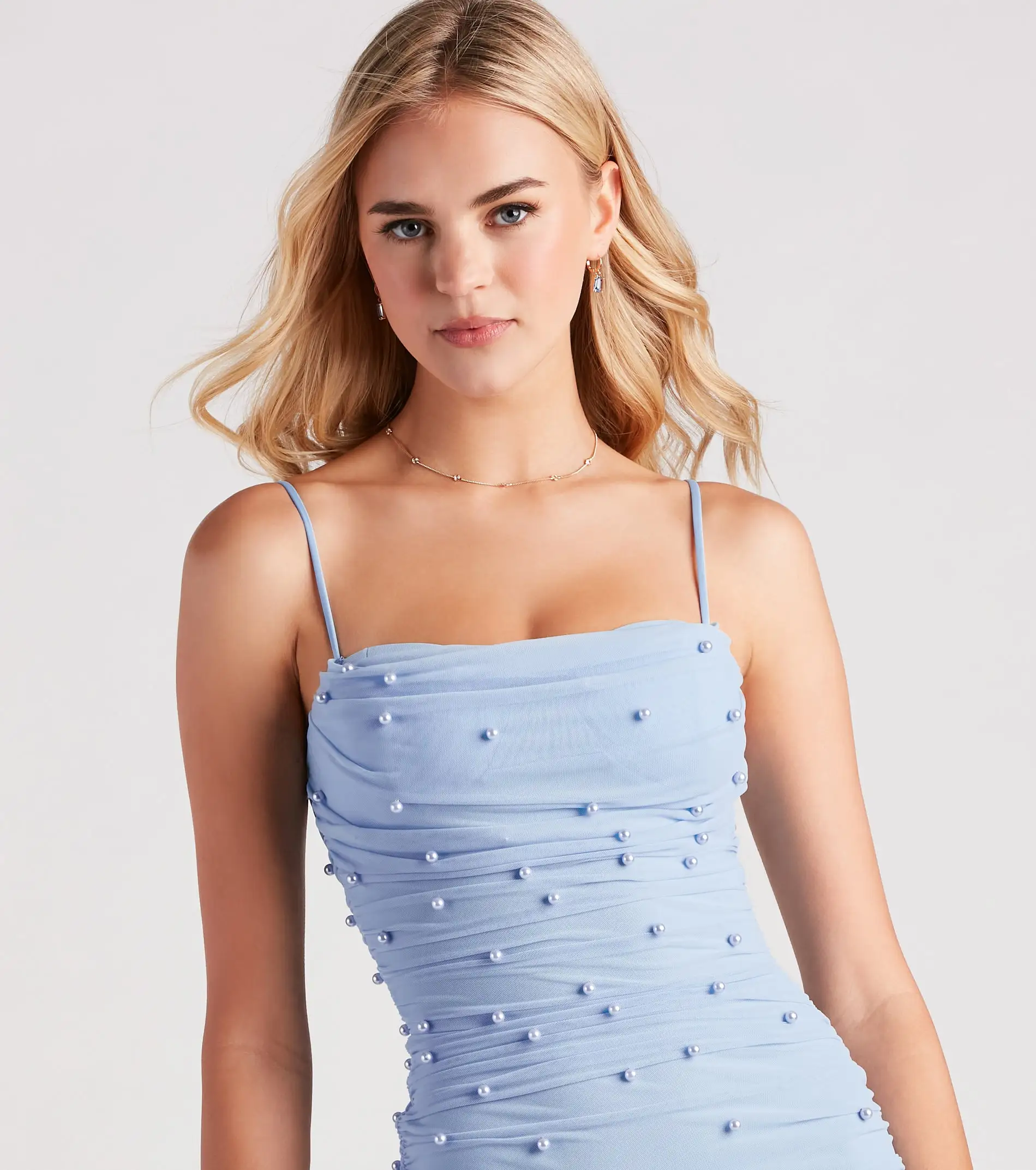 Both sexy and demure, the Kristen party dress wows from every angle! Perfect for bachelorette weekends, themed soirees, and formal birthdays! She features a sleeveless sweetheart neckline with a padded bust, cowl draping, adjustable spaghetti straps, and side-ruched seams that hug your curves along her short bodycon silhouette. The formal party dress is composed of a faux pearl embellished mesh fabric with a stretchy knit lining. Complete the look in statement