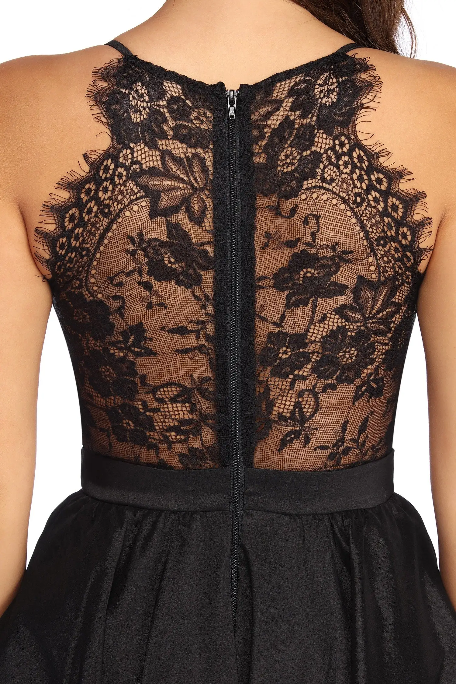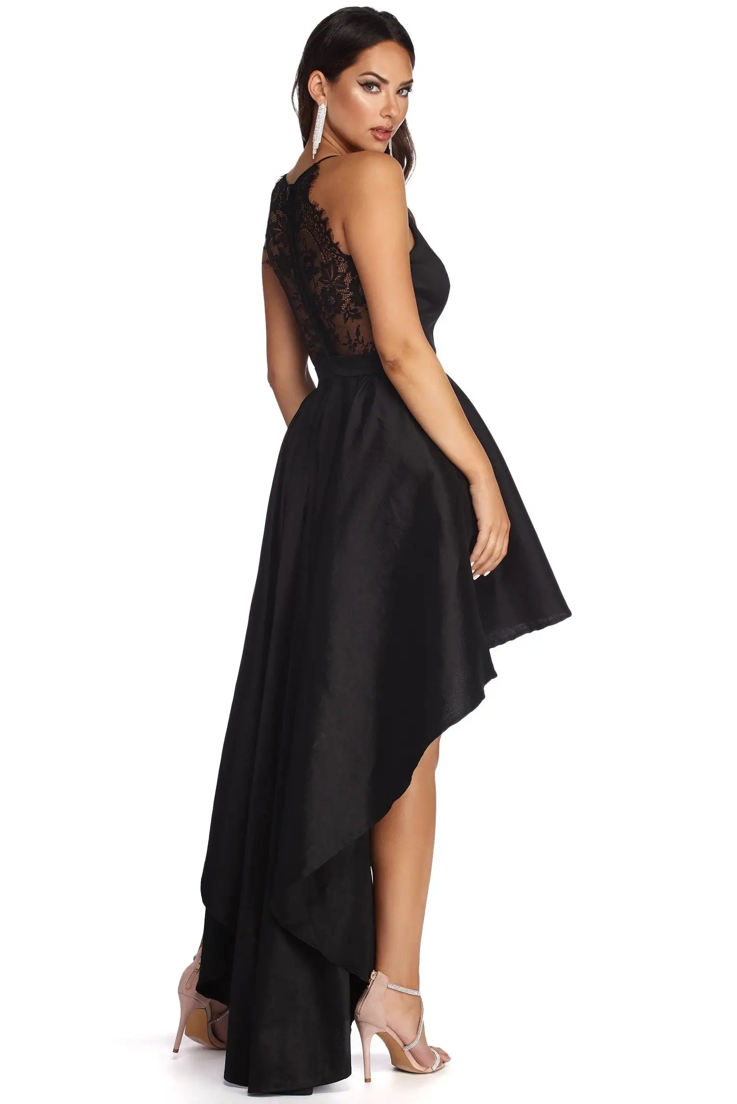 Raise the bar in our simply breath taking Kylie black dress! She features a sleeveless bodice, a plunging V neckline and narrow straps that lead to an unlined floral lace panel. Her slim fit bodice leads to dramatic high low silhouette with hidden side pockets. Dress is composed of a lined taffeta fabric that offers a form hugging fit with a moderate stretch. Includes a petticoat and back zipper closure.