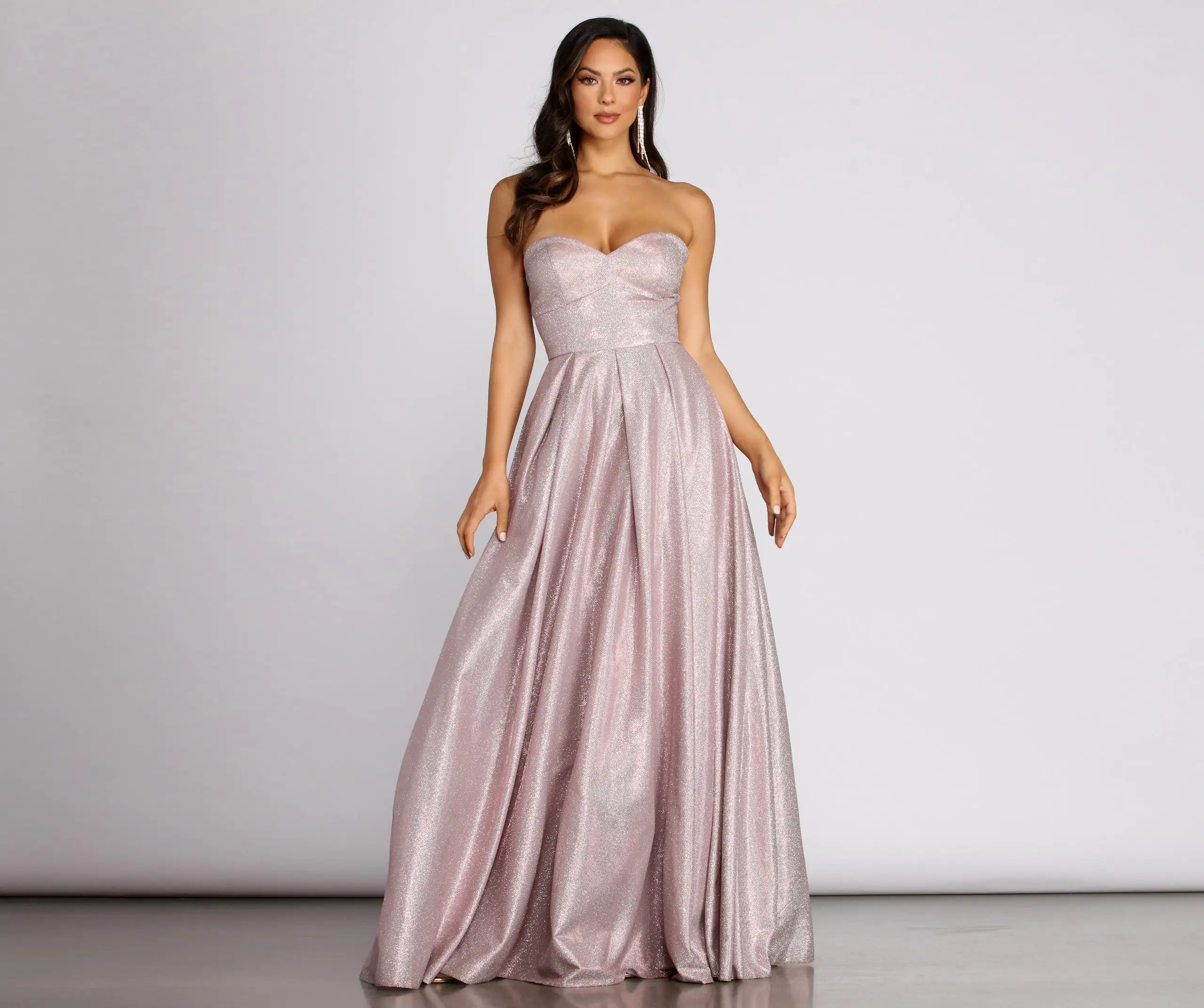 Shine like the goddess you are in our breathtaking Kylie ball gown! Glow with her metallic glitter body and pair her with chrome heels for an entrance to wow them all!