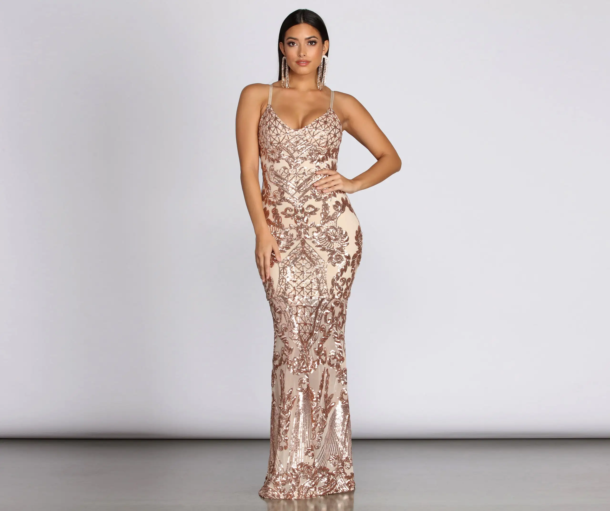 Have the time of your life and dance the night away in our Layla! She features a v neckline, adjustable spaghetti straps that lead to a square back with a zipper closure. She features a cup stitching at the bodice and a subtle banded waist line. She has a mini skirt lining that is sewn in place which makes her easy to move around in, and a floor length mermaid hemline. She is composed of a mesh material that offers a form fitting silhouette with slight stretch, that showcases a beautifully detailed geometric and floral sequin pattern!Â