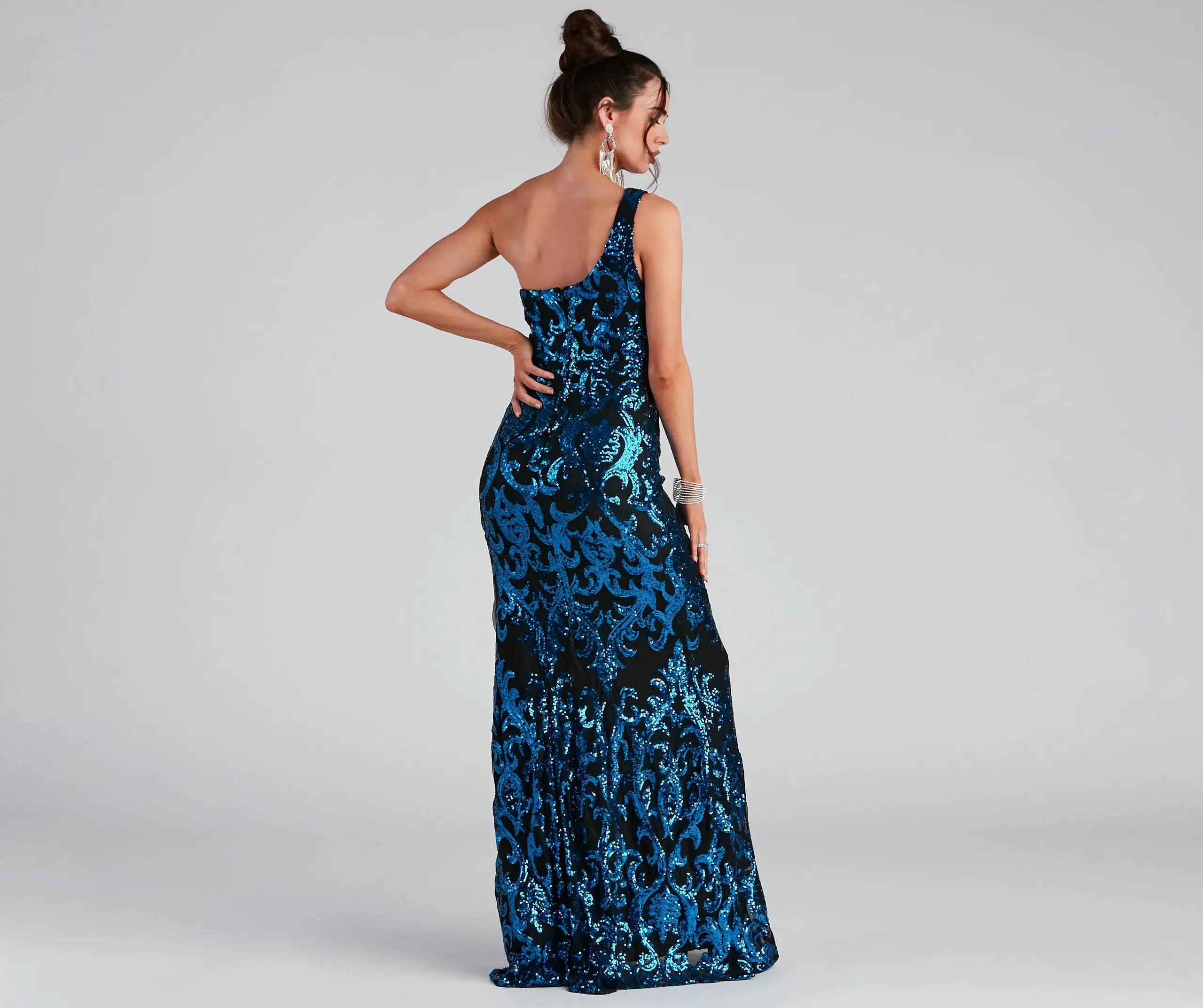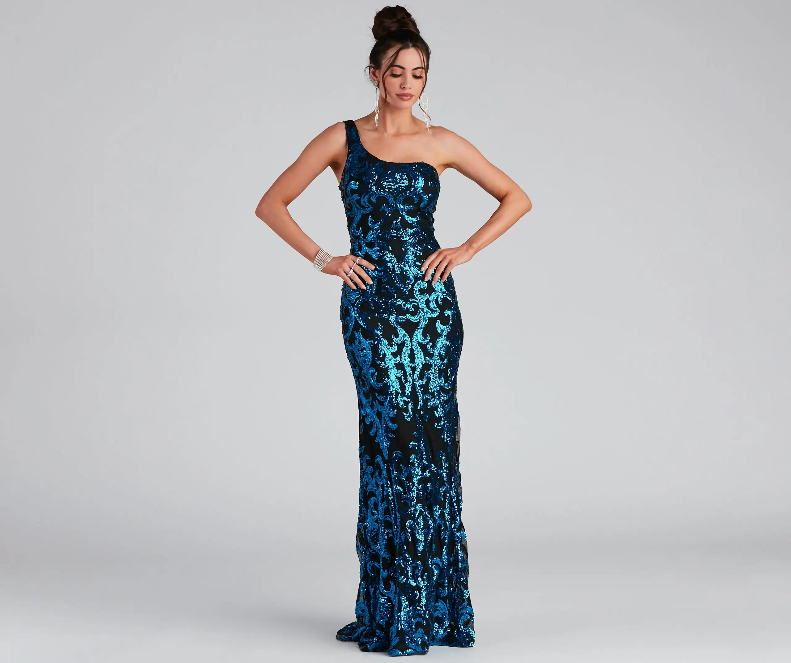 Bring the sparkle to your event with a formal dress that wows from the moment you enter the room. Layton features a damask sequin pattern, a one-shoulder neckline with a built-in padded bust, and a high waist seam that leads to a mermaid silhouette. The dress is composed of a lined mesh fabric that offers minimal stretch. Complete look