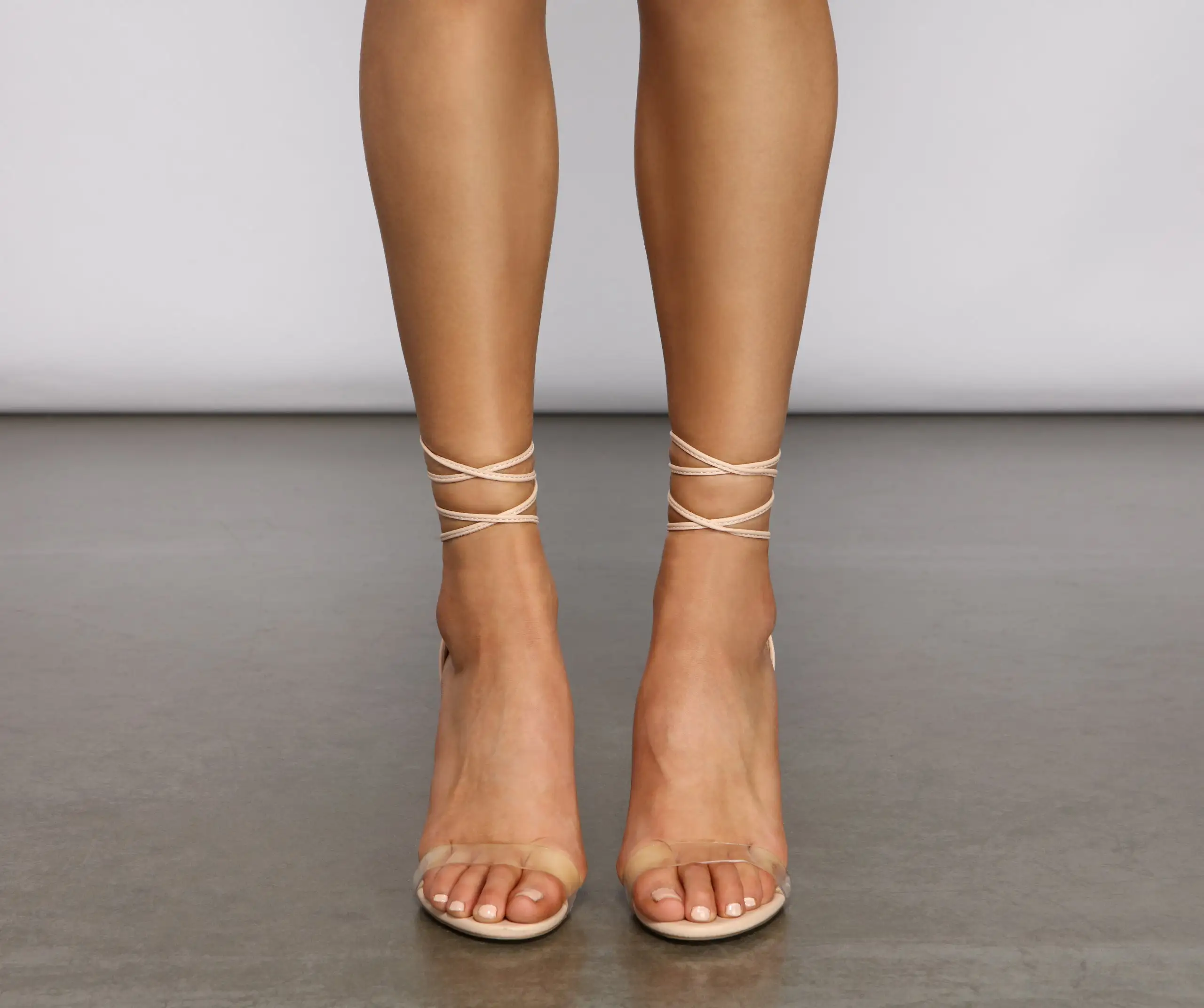 Take the lead in these heels that command attention with each step! The heels feature closed-back, lace-up straps, an open almond toe, a clear PVC strap over the toe, and a stiletto heel. Complete look with a