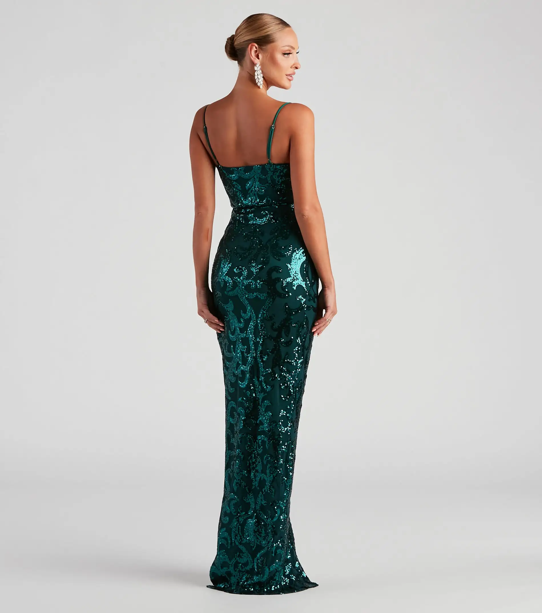 Leave the room breathless in the captivating Leah formal dress showcasing a regal sequin scroll design that elevates the night! She features a sleeveless cowl neckline, adjustable spaghetti straps to customize the fit, a high waist seam, and a form-hugging silhouette with a sultry high-cut side slit along the floor-length hem. The formal dress is composed of a sequin-scroll patterned mesh fabric with a sewn-in knit lining and minimal stretch. Complete your stunning look in chandelier